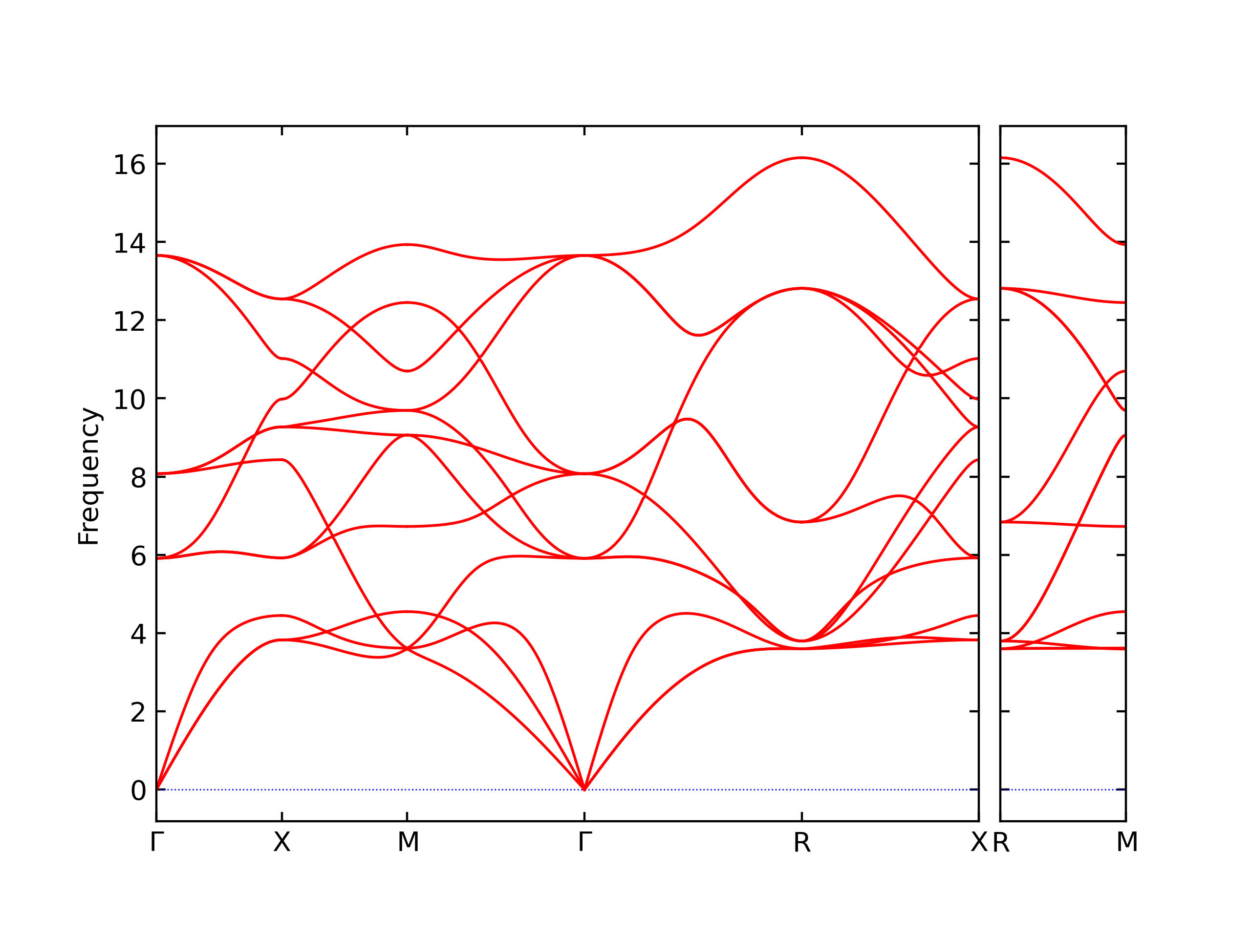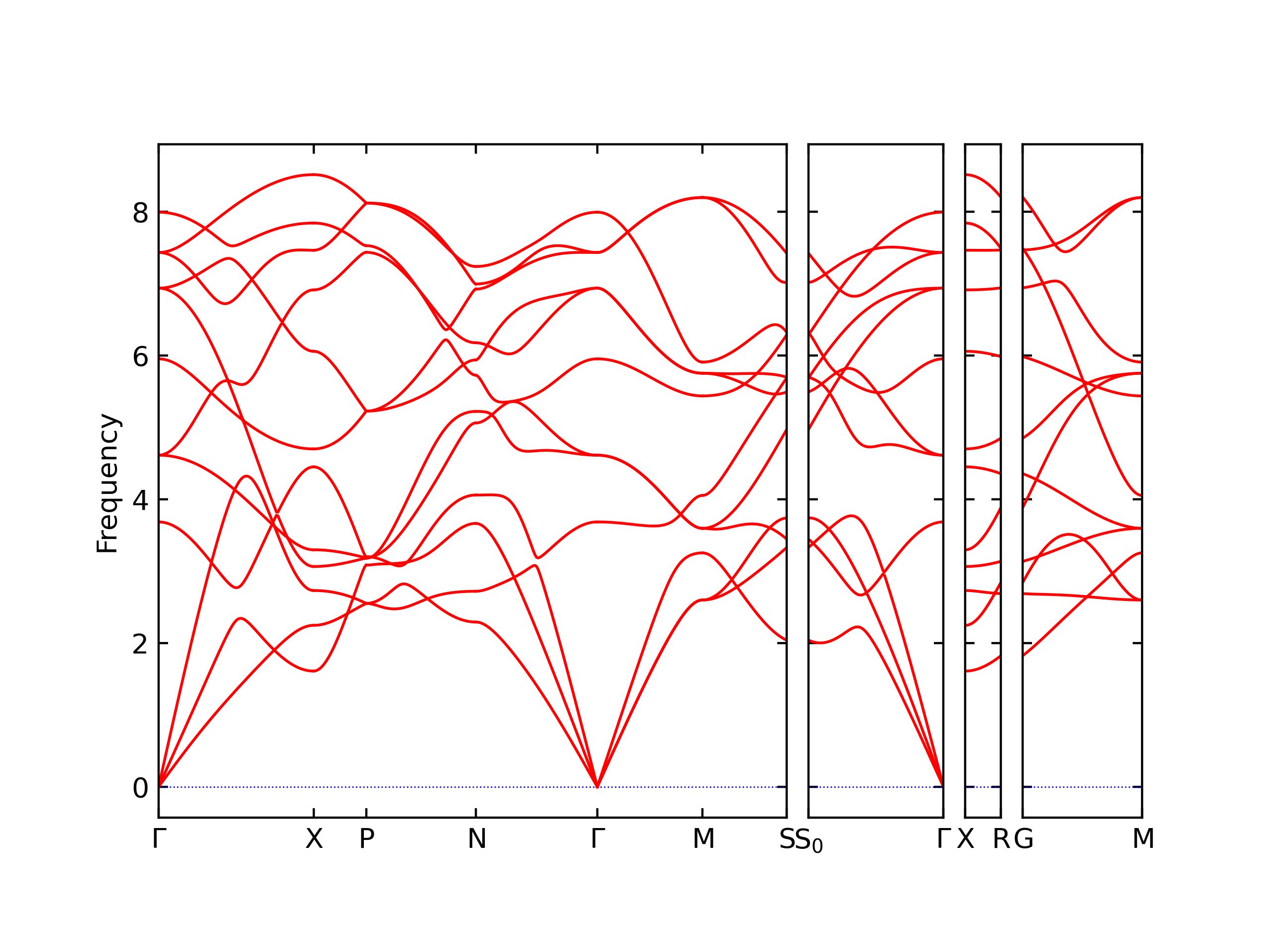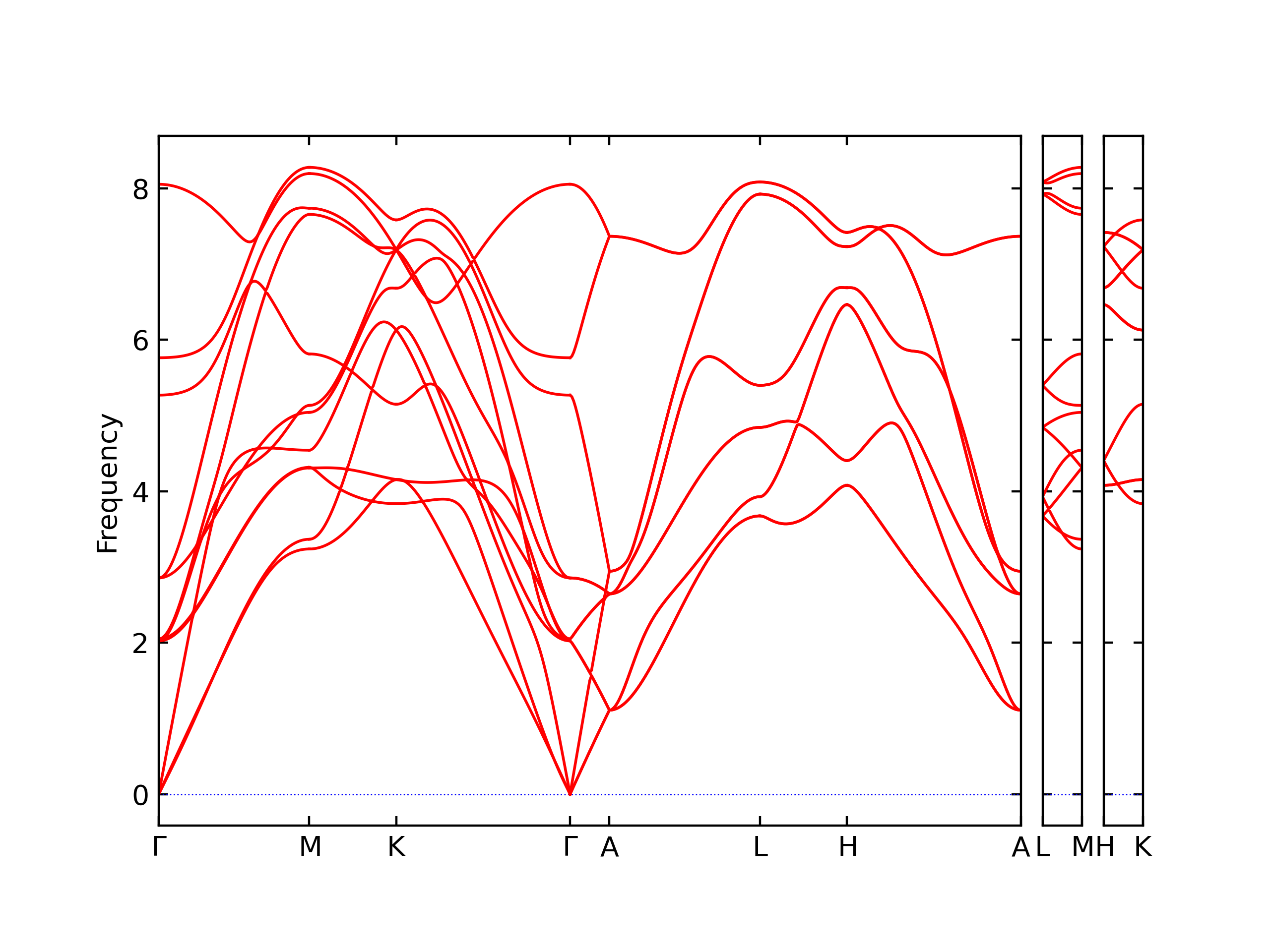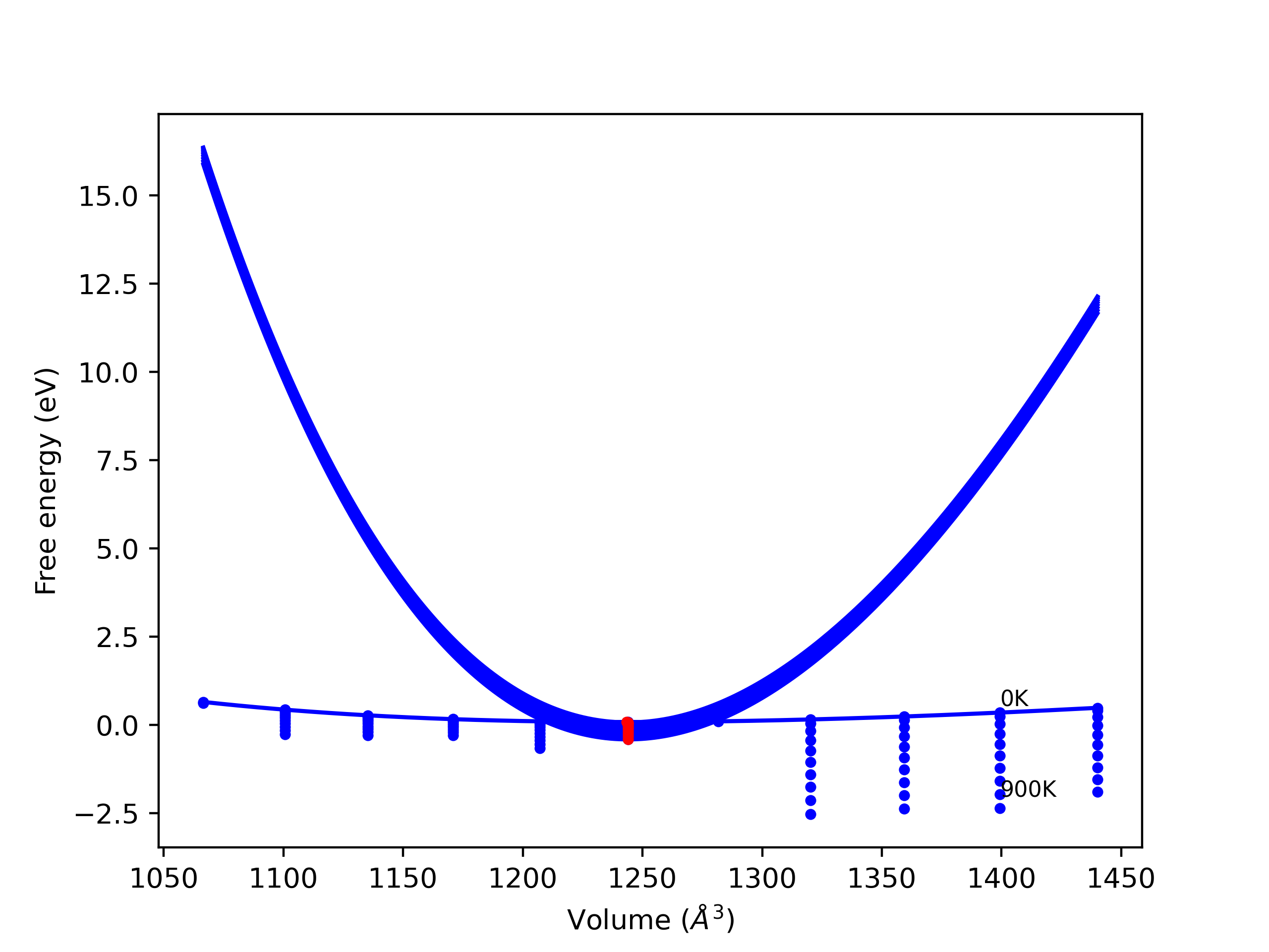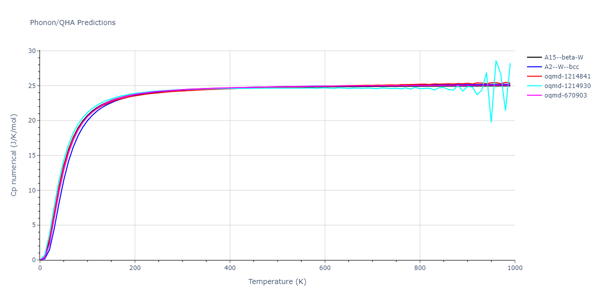 Phonon band structures and crystal properties estimated from quasi-harmonic approximation (QHA) calculations are displayed for select crystals. The calculations were performed using phonopy and LAMMPS. For the phonon calculations, 3x3 supercells of the potential-specific relaxed crystals were used. The QHA calculations were based on 11 strain states ranging from -0.05 to 0.05.