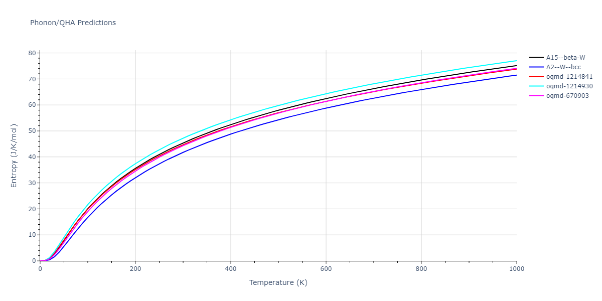 The Gibbs energies of the phases are estimated using thermodynamic integration between the interatomic potential in question and a simpler model with known Gibbs free energy values. For solids, the reference model is an Einstein solid, while for liquids it is the Uhlenbeck-Ford potential. Besides a short run at the start of the solid calculations to estimate Einstein model spring constants, the two calculations proceed similarly. Starting with the final relaxation configurations, the systems are stabilized for 25,000 steps. Then, over the next 50,000 steps the potential is swapped out for the reference potential. The system is then stabilized for another 25,000 steps with the reference model before a reverse swap of 50,000 steps is performed. The simulation ends with one final 25,000 step stabilization period. From the simulation, the irreversible work of transformation is estimated and used to compute the absolute Gibbs free energy of the target phase and potential relative to the reference potential. Entropy is estimated as the difference in enthalpy and Gibbs free energy and divided by temperature.