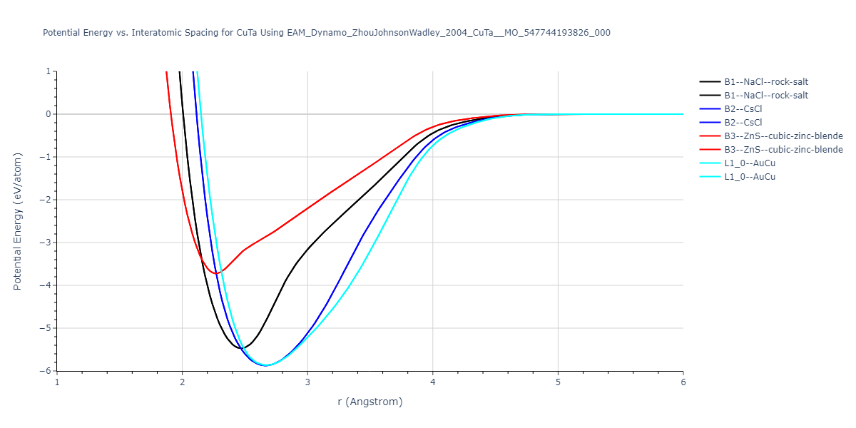 Plots of potential energy vs interatomic spacing, r, are shown below for a number of crystal structures. The structures are generated based on the ideal atomic positions and b/a and c/a lattice parameter ratios for a given crystal prototype. The size of the system is then uniformly scaled, and the energy calculated without relaxing the system. To obtain these plots, values of r are evaluated every 0.02 Å up to 6 Å.
