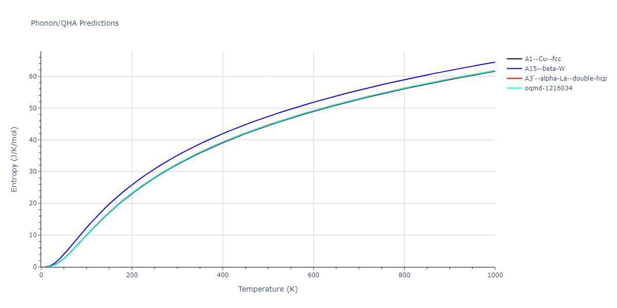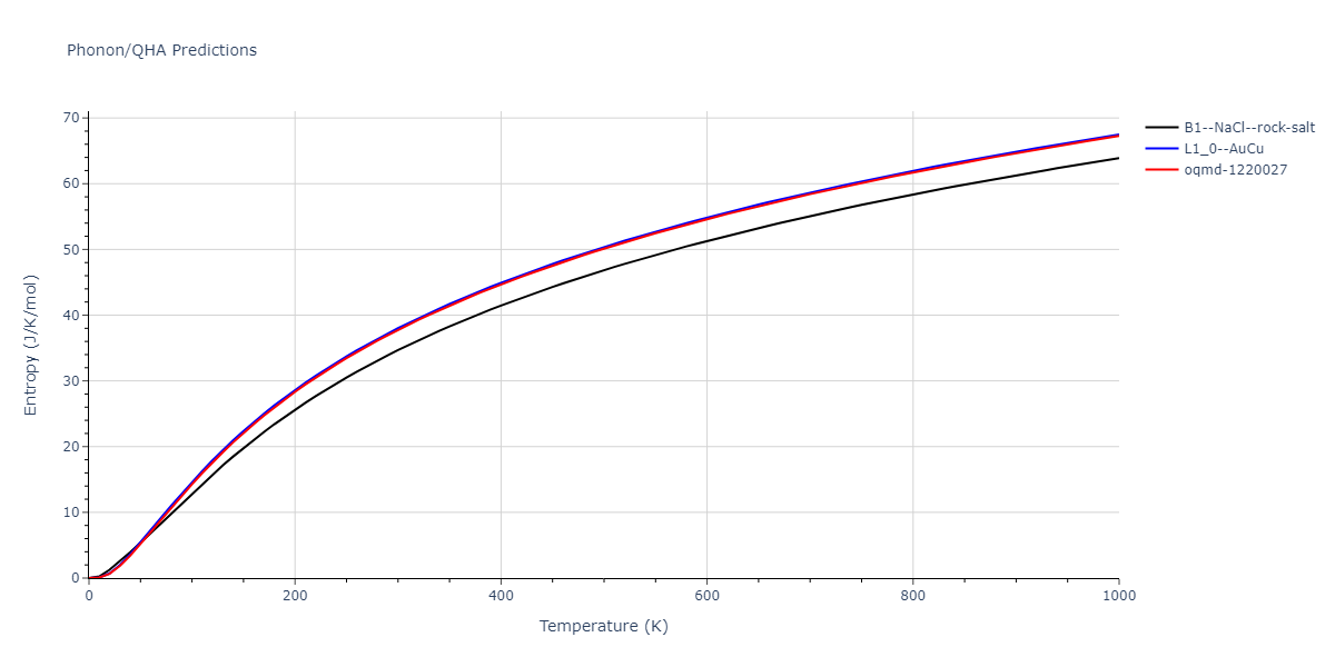 The Gibbs energies of the phases are estimated using thermodynamic integration between the interatomic potential in question and a simpler model with known Gibbs free energy values. For solids, the reference model is an Einstein solid, while for liquids it is the Uhlenbeck-Ford potential. Besides a short run at the start of the solid calculations to estimate Einstein model spring constants, the two calculations proceed similarly. Starting with the final relaxation configurations, the systems are stabilized for 25,000 steps. Then, over the next 50,000 steps the potential is swapped out for the reference potential. The system is then stabilized for another 25,000 steps with the reference model before a reverse swap of 50,000 steps is performed. The simulation ends with one final 25,000 step stabilization period. From the simulation, the irreversible work of transformation is estimated and used to compute the absolute Gibbs free energy of the target phase and potential relative to the reference potential. Entropy is estimated as the difference in enthalpy and Gibbs free energy and divided by temperature.