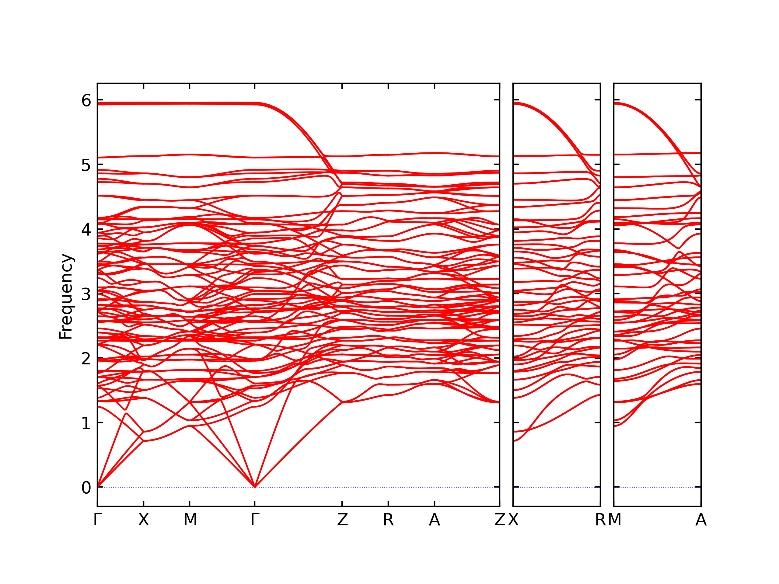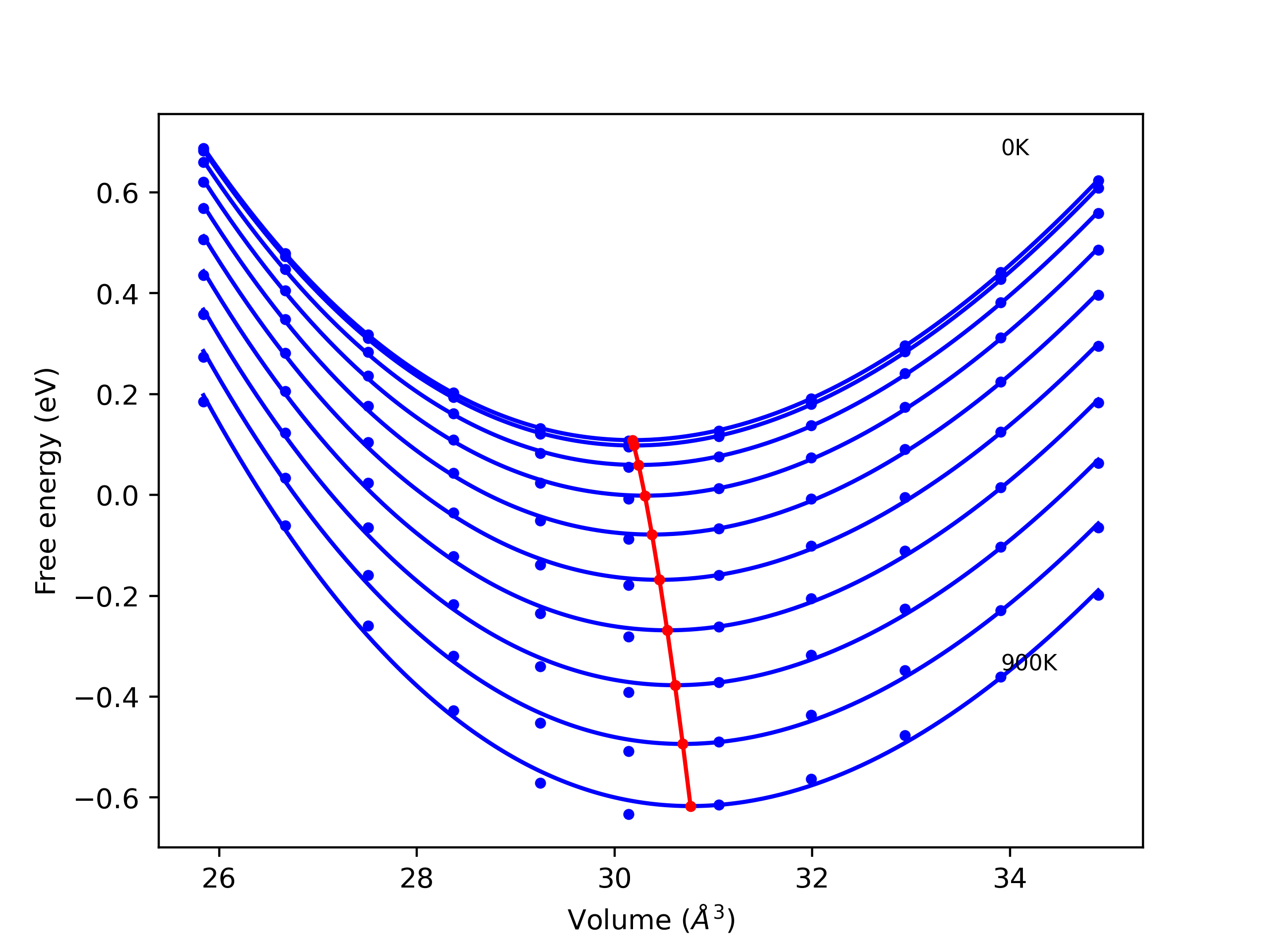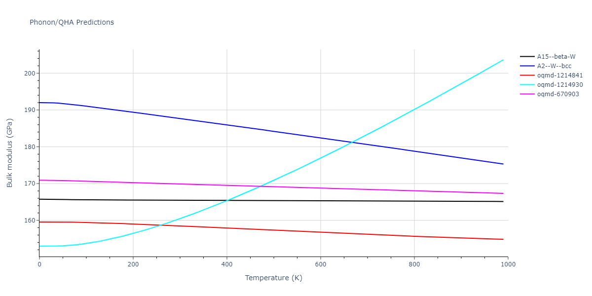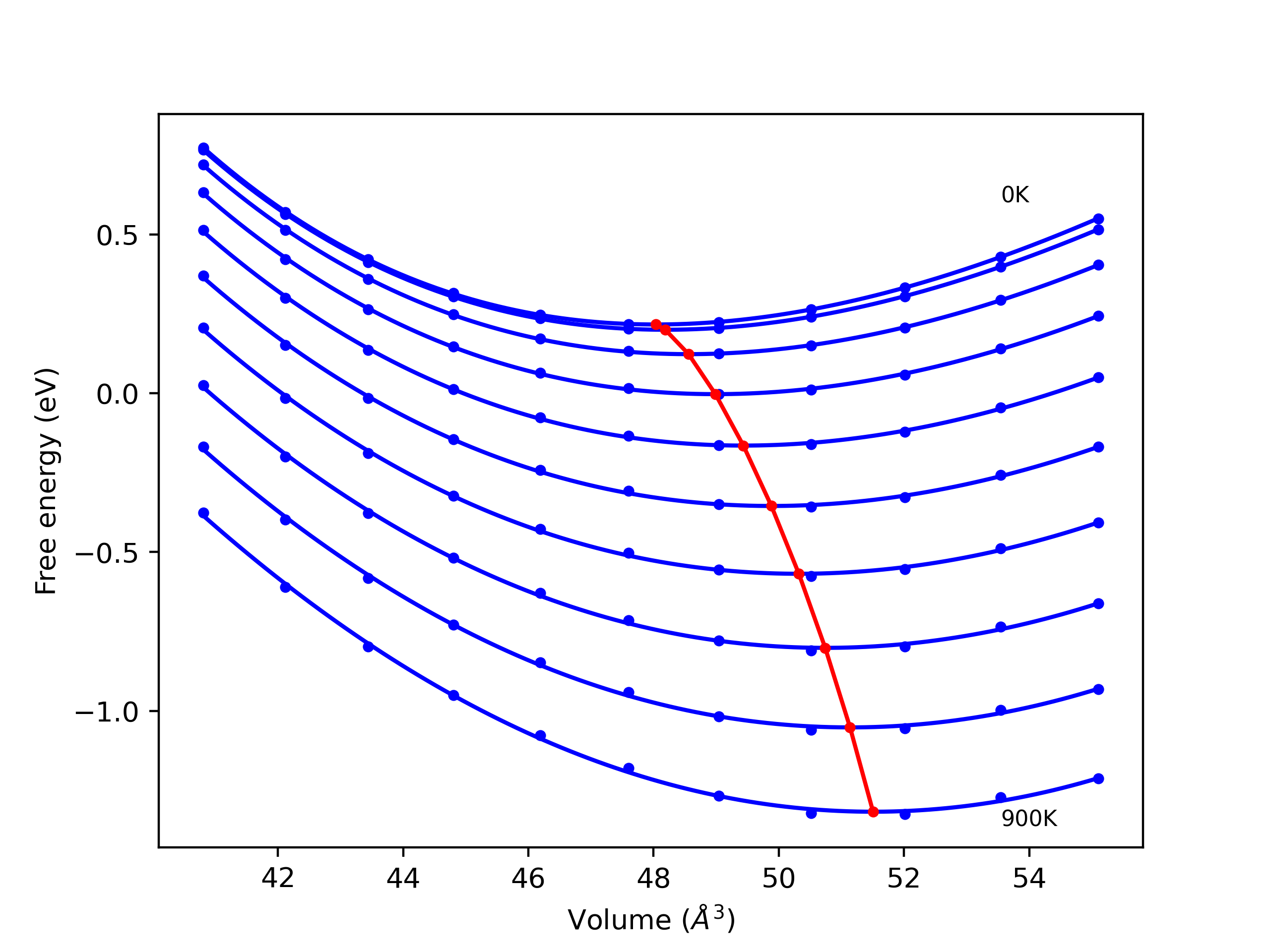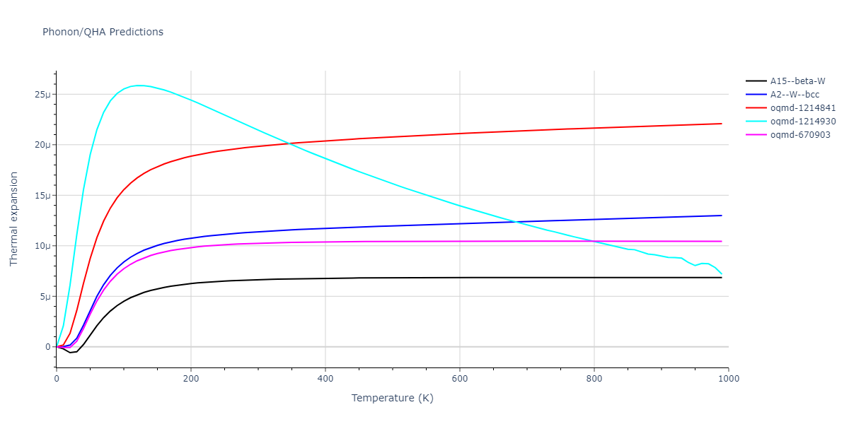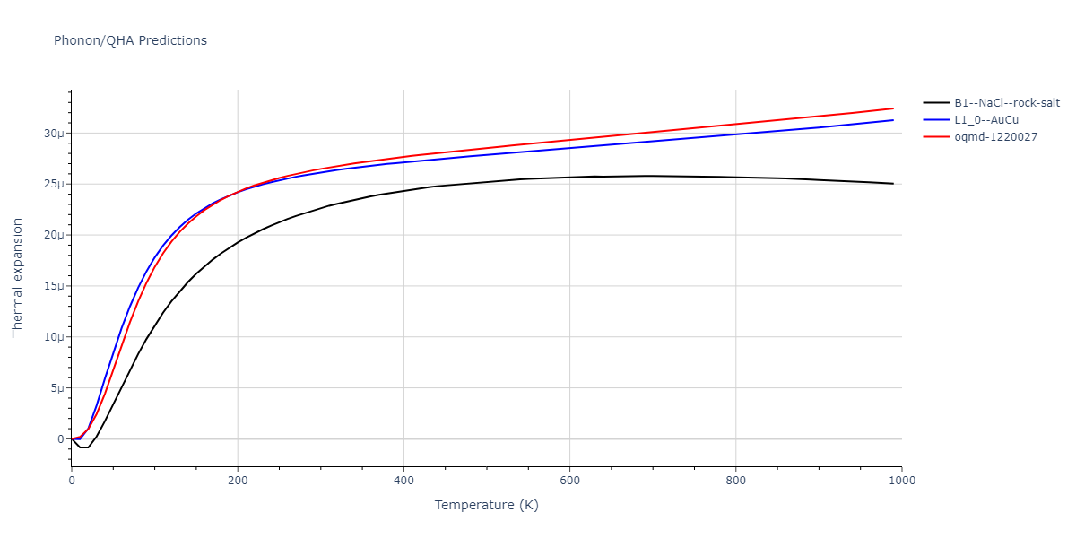 Phonon band structures and crystal properties estimated from quasi-harmonic approximation (QHA) calculations are displayed for select crystals. The calculations were performed using phonopy and LAMMPS. For the phonon calculations, 3x3 supercells of the potential-specific relaxed crystals were used. The QHA calculations were based on 11 strain states ranging from -0.05 to 0.05.