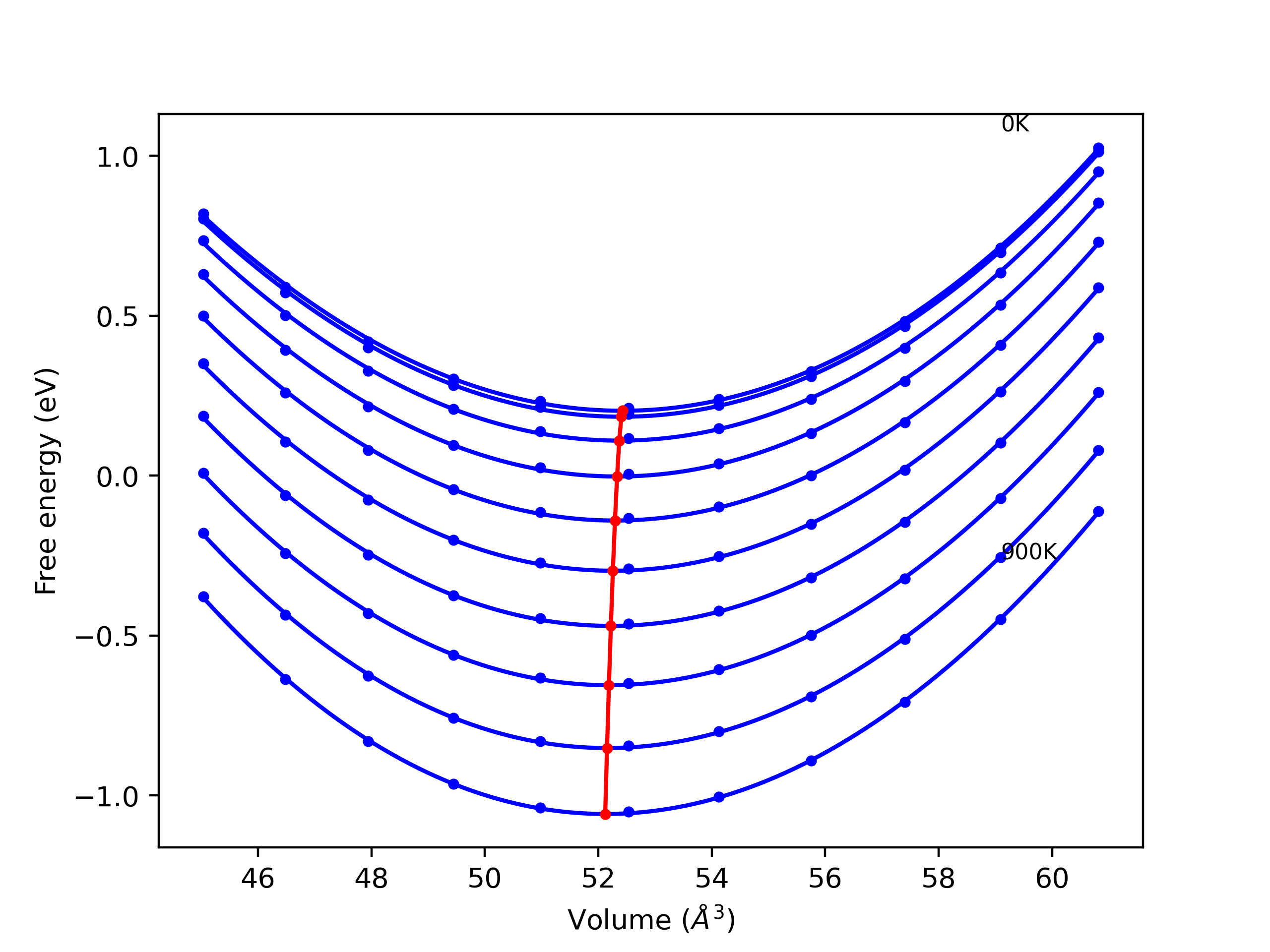 • The thermodynamic properties estimated from QHA are based on the assumption that only volumetric changes affect the phonon behaviors as the temperature changes. This tends to give good predictions at lower temperatures but ignores anharmonic effects such as phonon coupling and vacancy formation that can be important at higher temperatures.