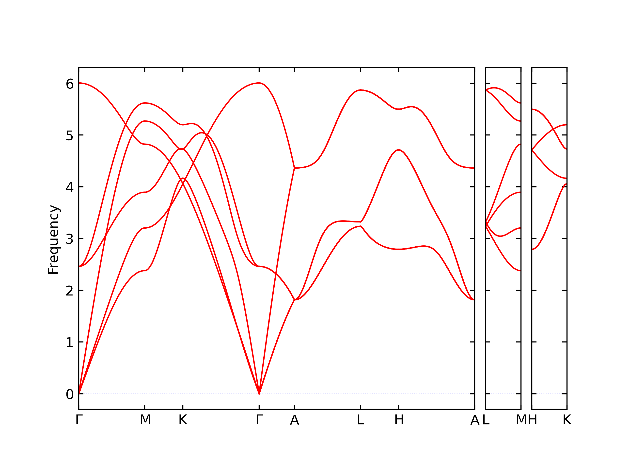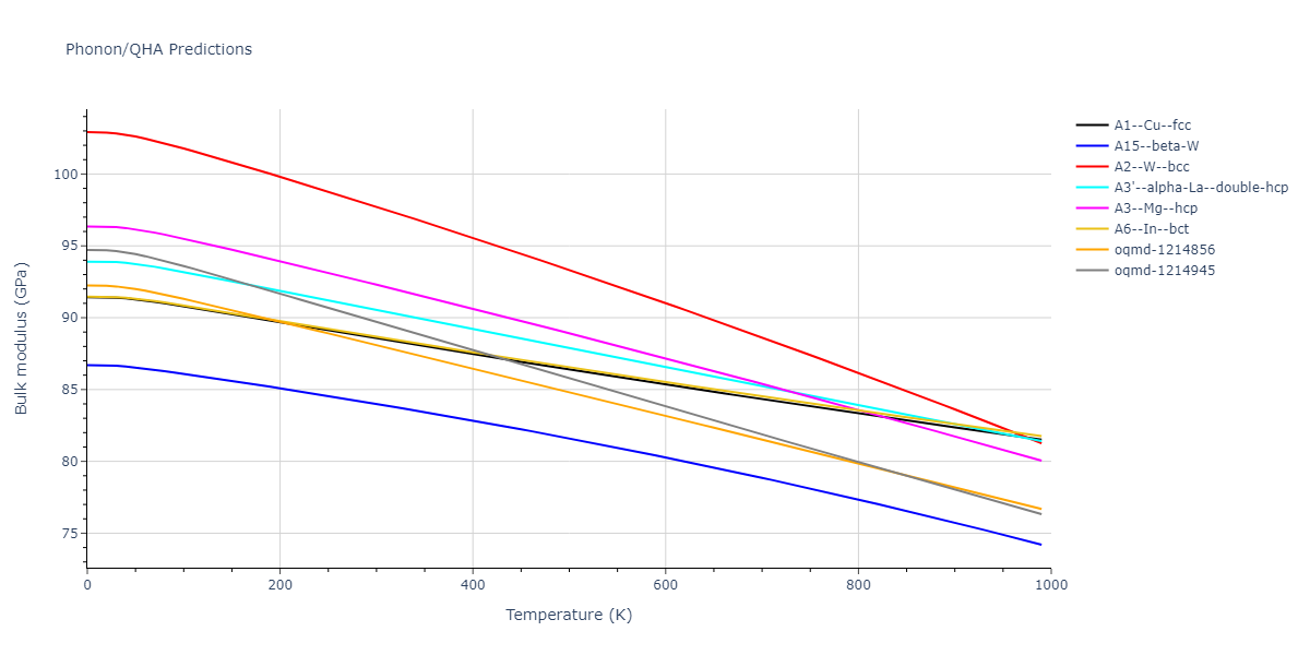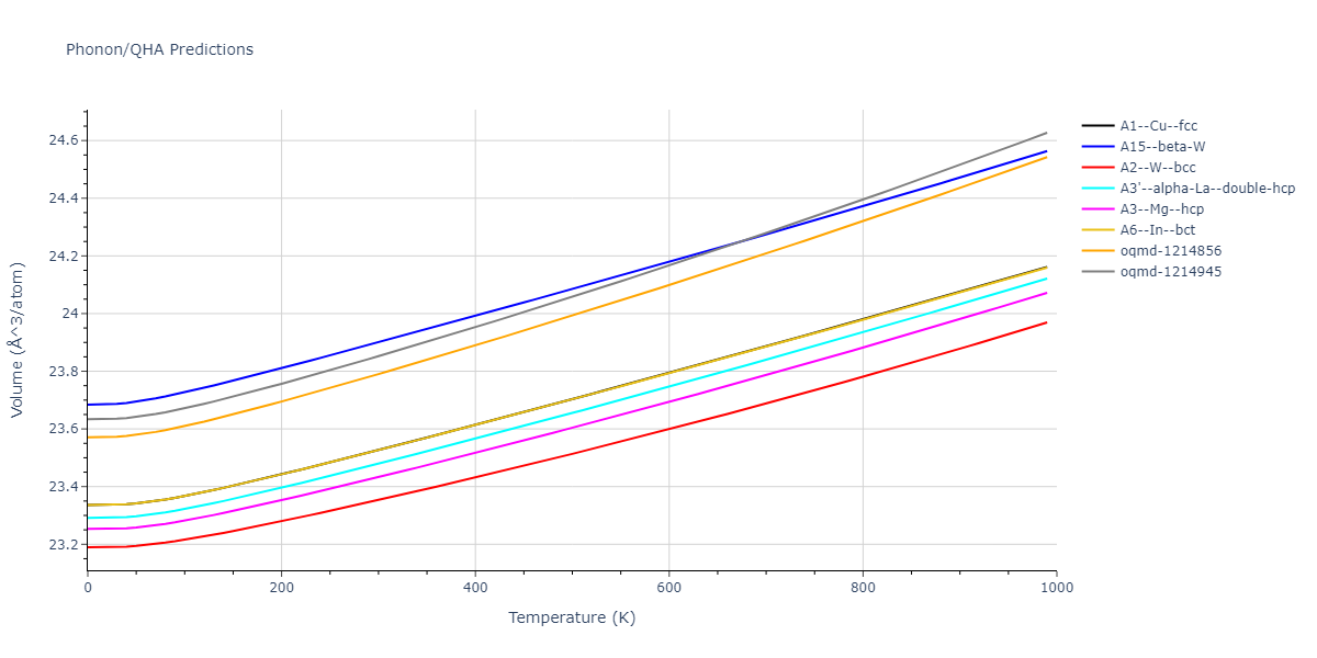 Phonon band structures and crystal properties estimated from quasi-harmonic approximation (QHA) calculations are displayed for select crystals. The calculations were performed using phonopy and LAMMPS. For the phonon calculations, 3x3 supercells of the potential-specific relaxed crystals were used. The QHA calculations were based on 11 strain states ranging from -0.05 to 0.05.