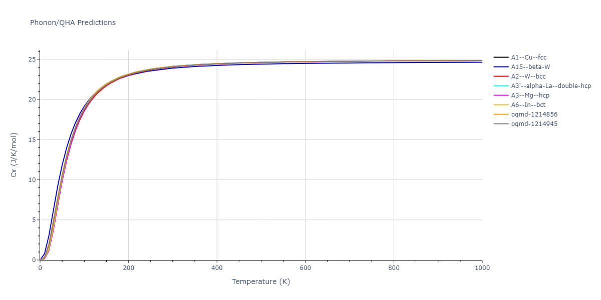 Phonon band structures and crystal properties estimated from quasi-harmonic approximation (QHA) calculations are displayed for select crystals. The calculations were performed using phonopy and LAMMPS. For the phonon calculations, 3x3 supercells of the potential-specific relaxed crystals were used. The QHA calculations were based on 11 strain states ranging from -0.05 to 0.05.