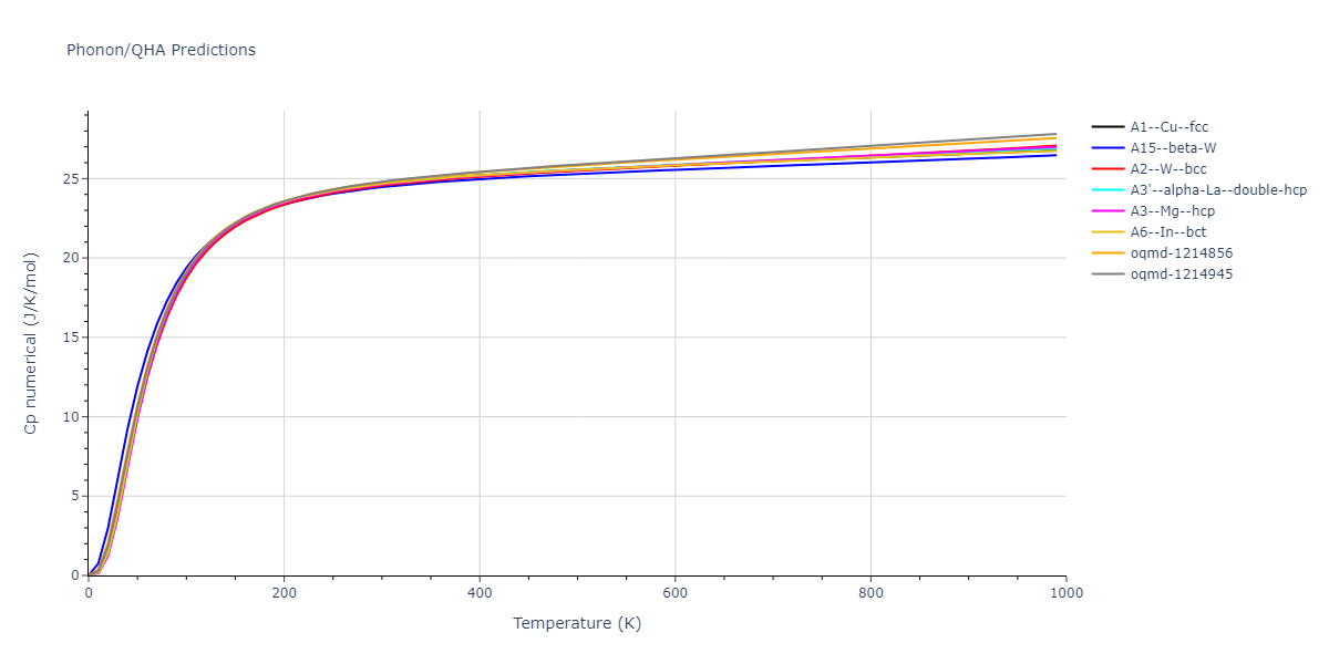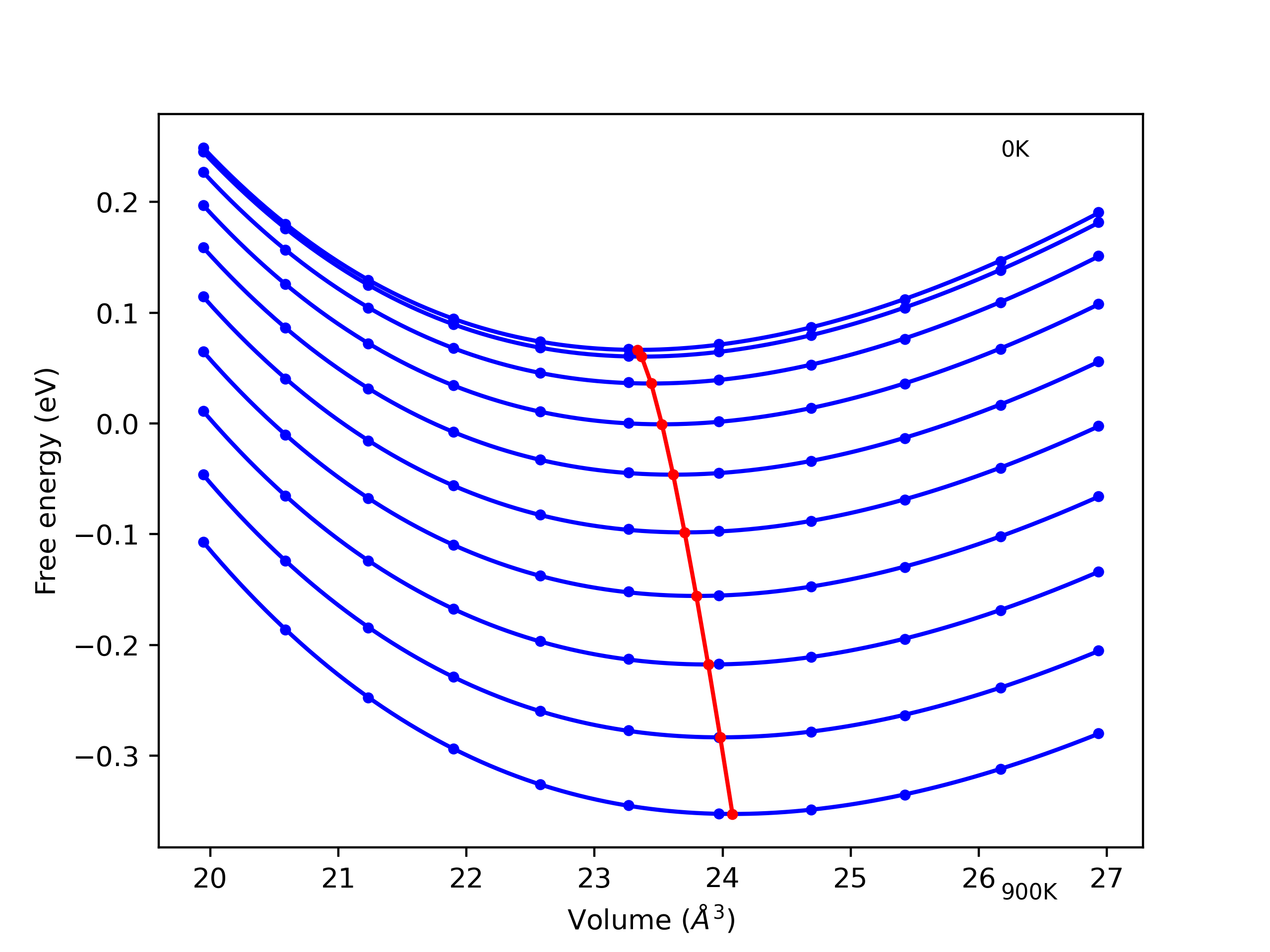 Phonon band structures and crystal properties estimated from quasi-harmonic approximation (QHA) calculations are displayed for select crystals. The calculations were performed using phonopy and LAMMPS. For the phonon calculations, 3x3 supercells of the potential-specific relaxed crystals were used. The QHA calculations were based on 11 strain states ranging from -0.05 to 0.05.