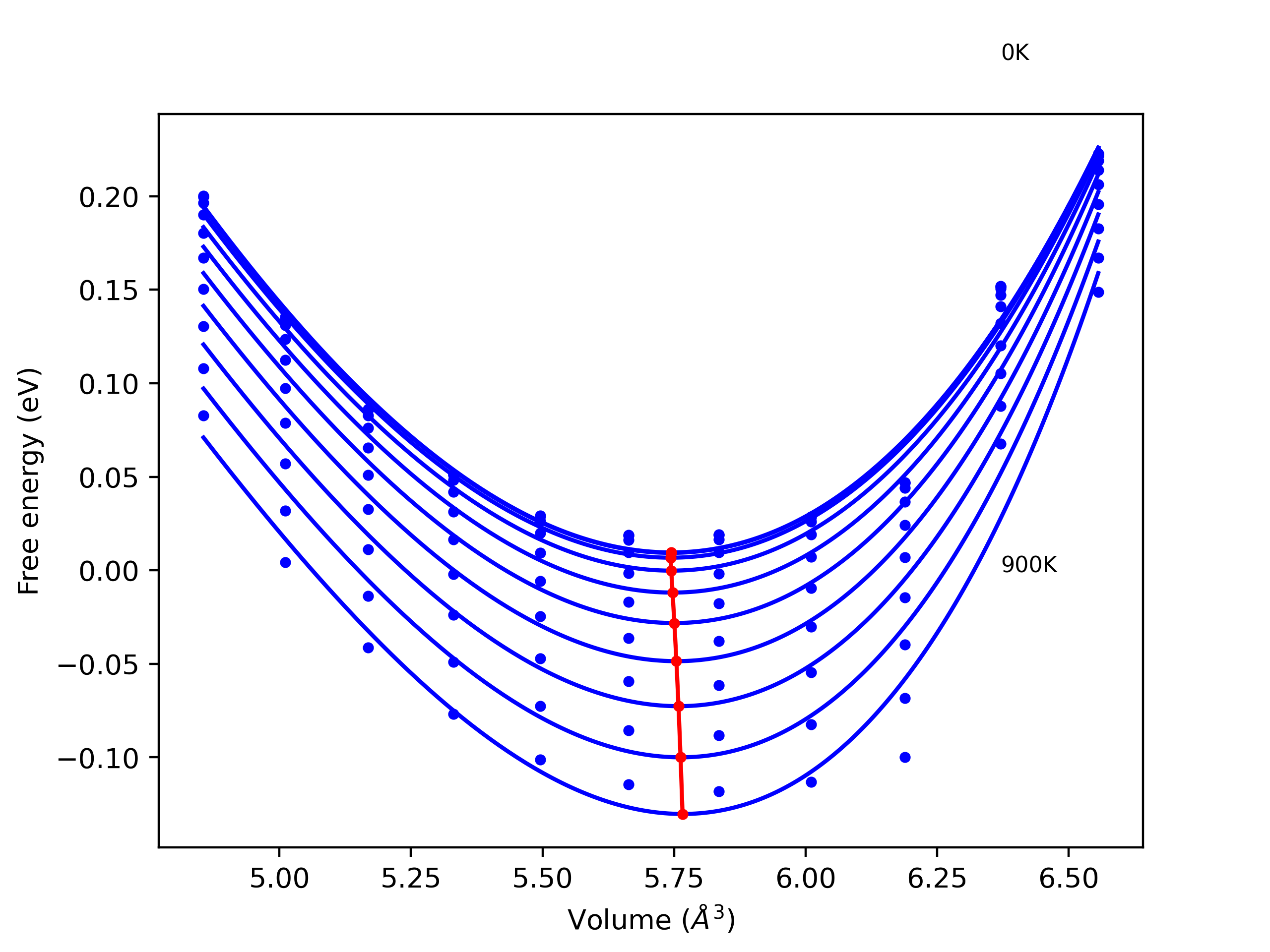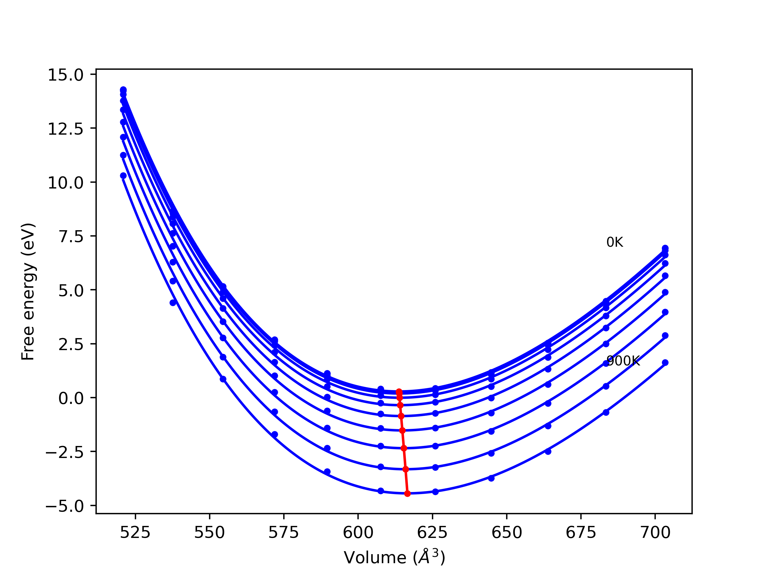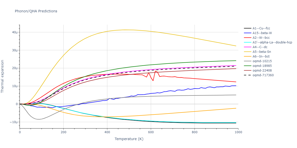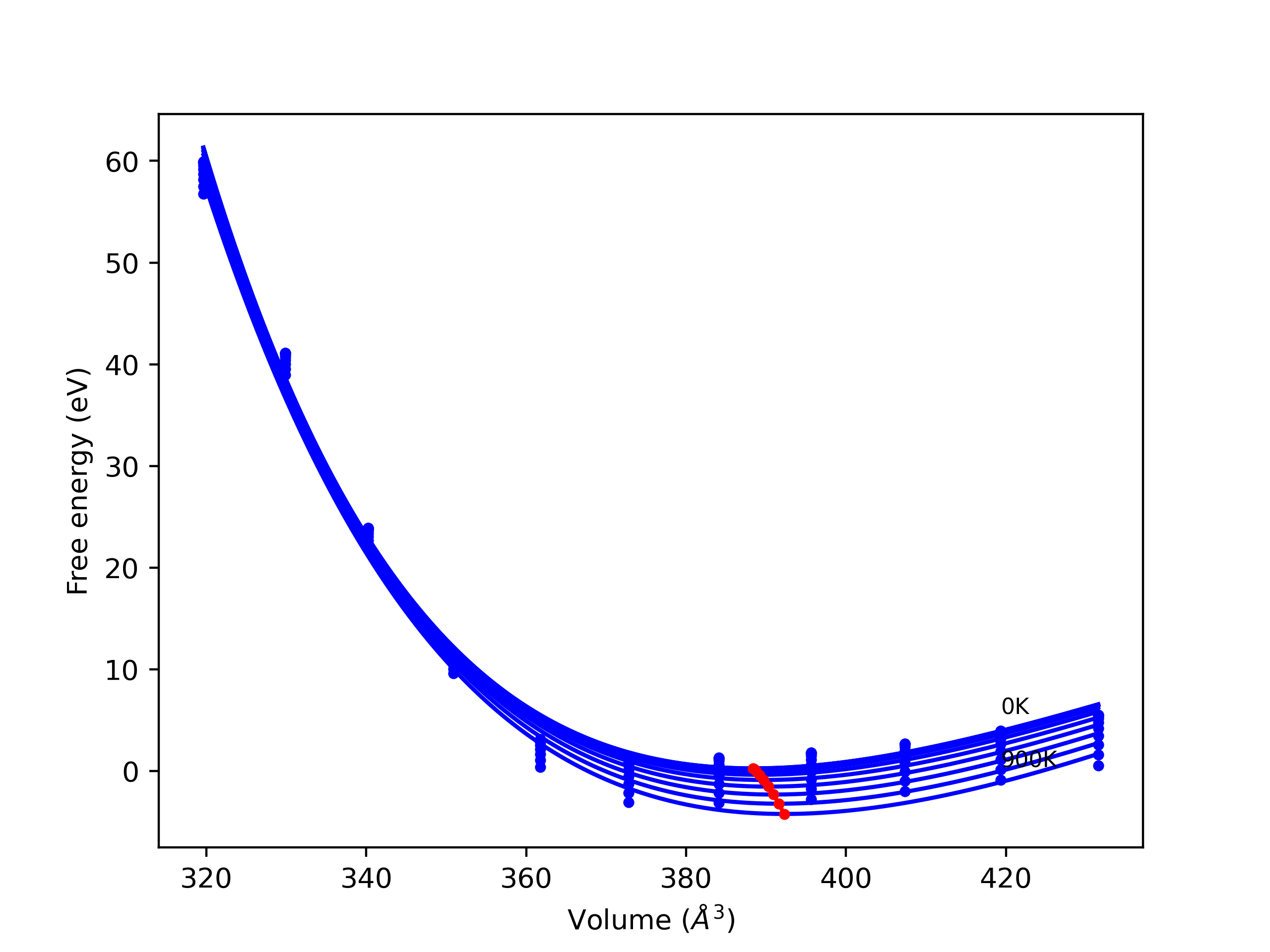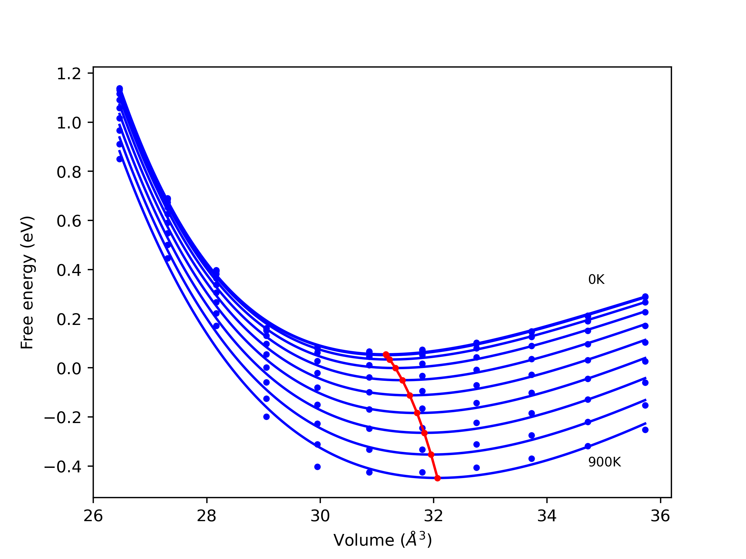 Plots of lattice and elastic constants are shown as a function of temperature. The 0K points were taken from the Crystal Structure Predictions and the Elastic Constants Predictions sections above for the unique crystal structures relaxed with the "dynamic" method. Starting from the 0 K relaxed crystal unit cells, supercell systems are created by replicating all three dimensions by the same multiplier to achieve at least 4000 atoms. The systems are then relaxed at 50 K and zero pressure using 1 million NPT steps. Lattice constants are estimated by averaging the measured box dimensions. Temperatures are iteratively increased by 50 K, with each subsequent relaxation calculation starting from the final atomic configuration at the previous temperature and relaxing for another 1 million steps.