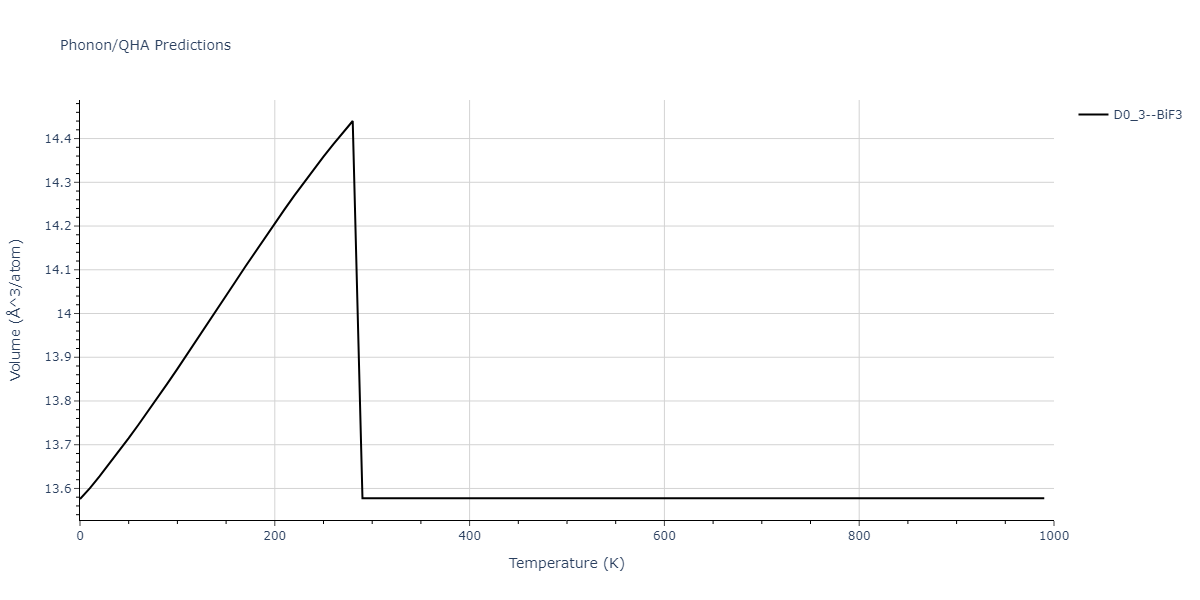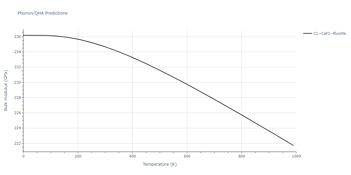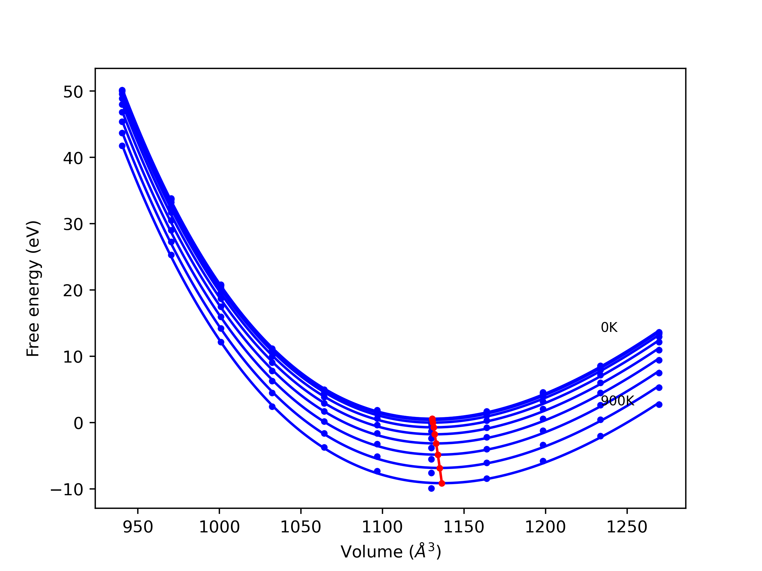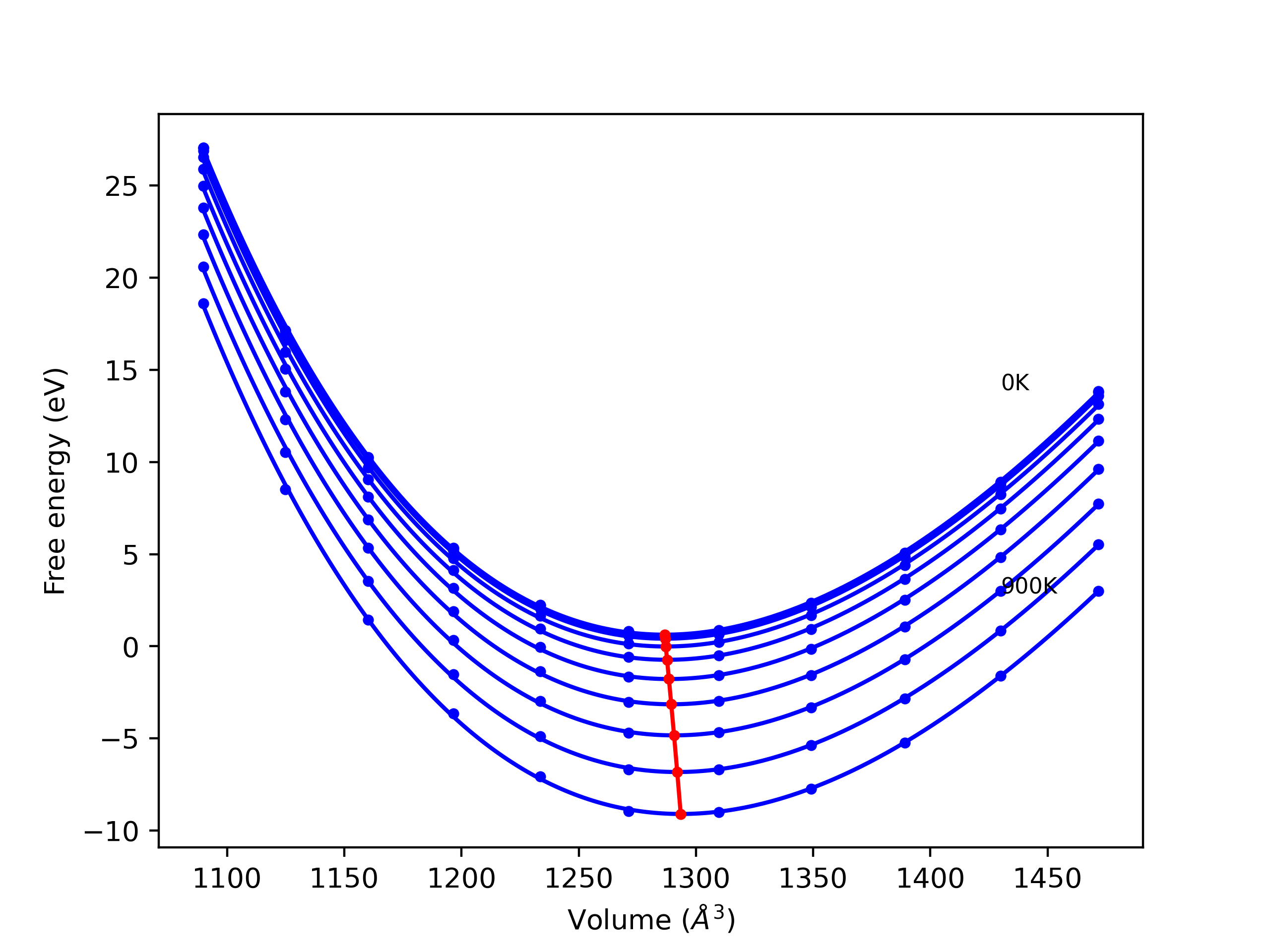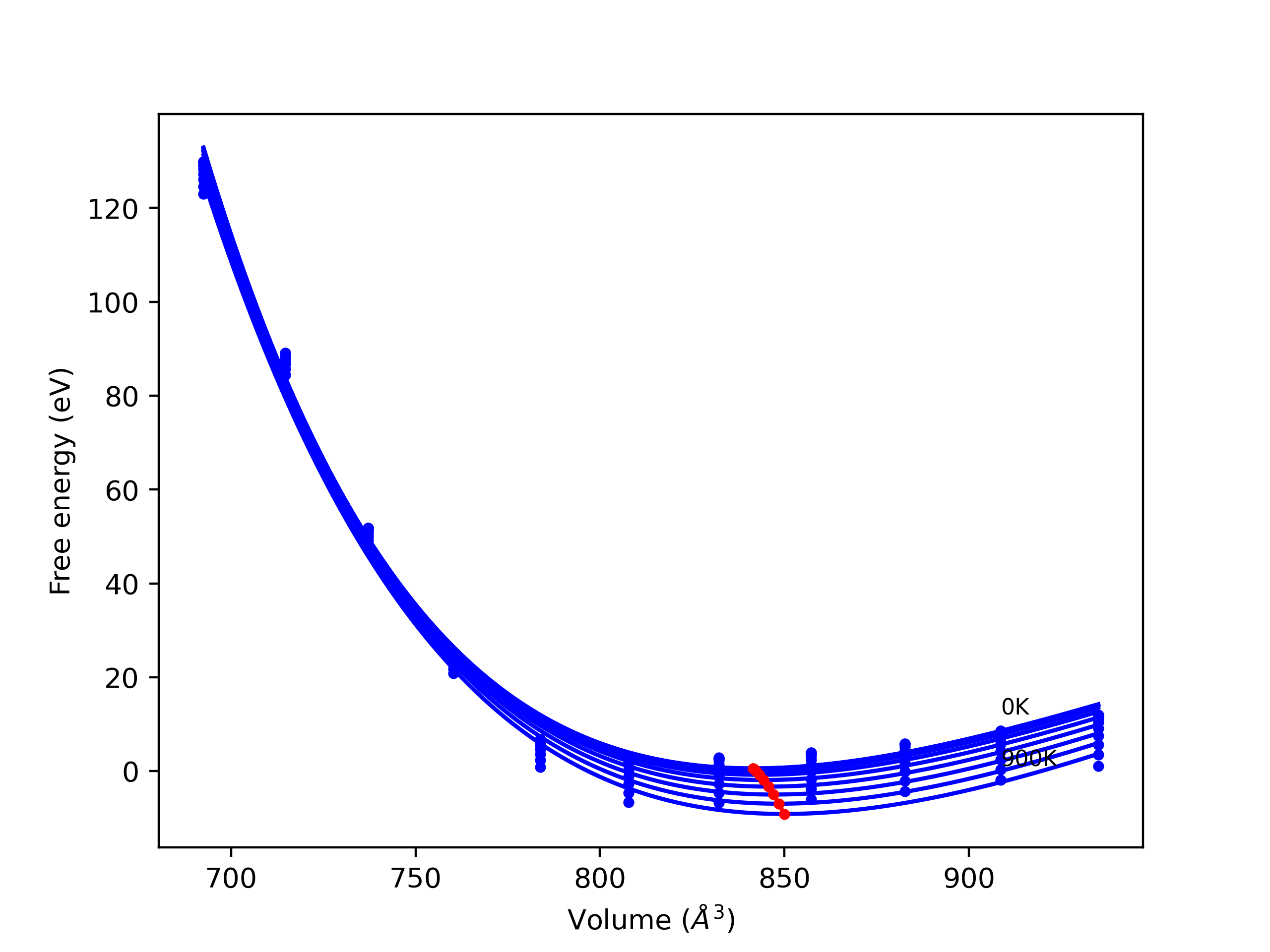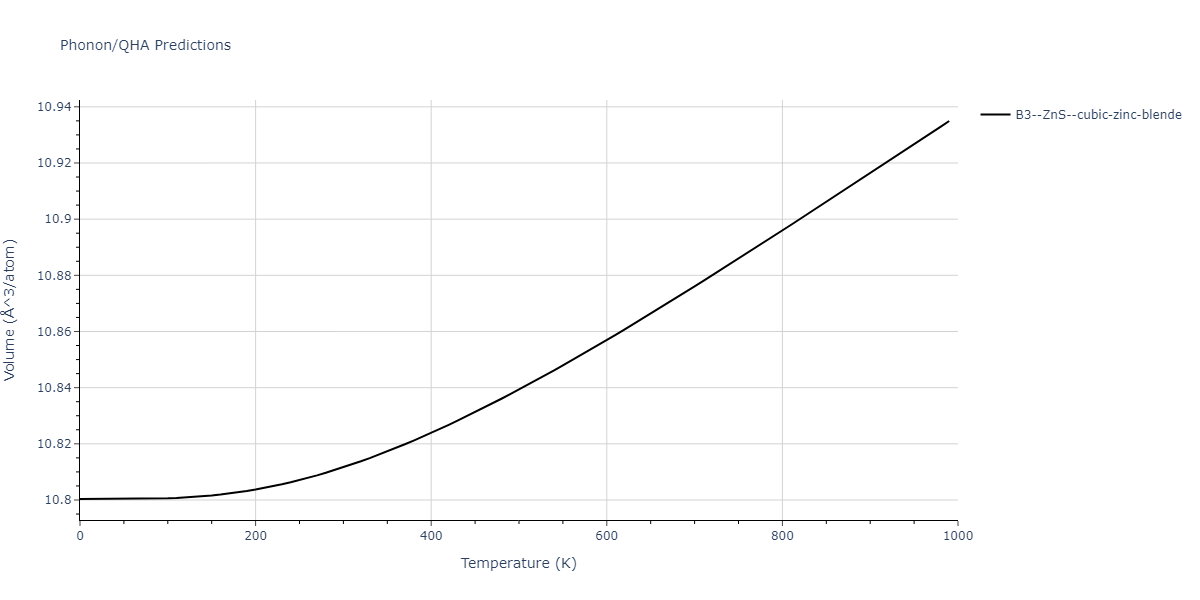 Plots of lattice and elastic constants are shown as a function of temperature. The 0K points were taken from the Crystal Structure Predictions and the Elastic Constants Predictions sections above for the unique crystal structures relaxed with the "dynamic" method. Starting from the 0 K relaxed crystal unit cells, supercell systems are created by replicating all three dimensions by the same multiplier to achieve at least 4000 atoms. The systems are then relaxed at 50 K and zero pressure using 1 million NPT steps. Lattice constants are estimated by averaging the measured box dimensions. Temperatures are iteratively increased by 50 K, with each subsequent relaxation calculation starting from the final atomic configuration at the previous temperature and relaxing for another 1 million steps.
