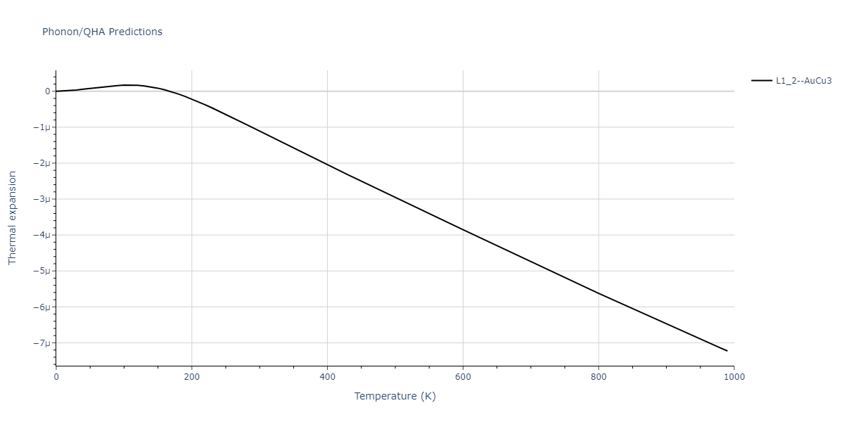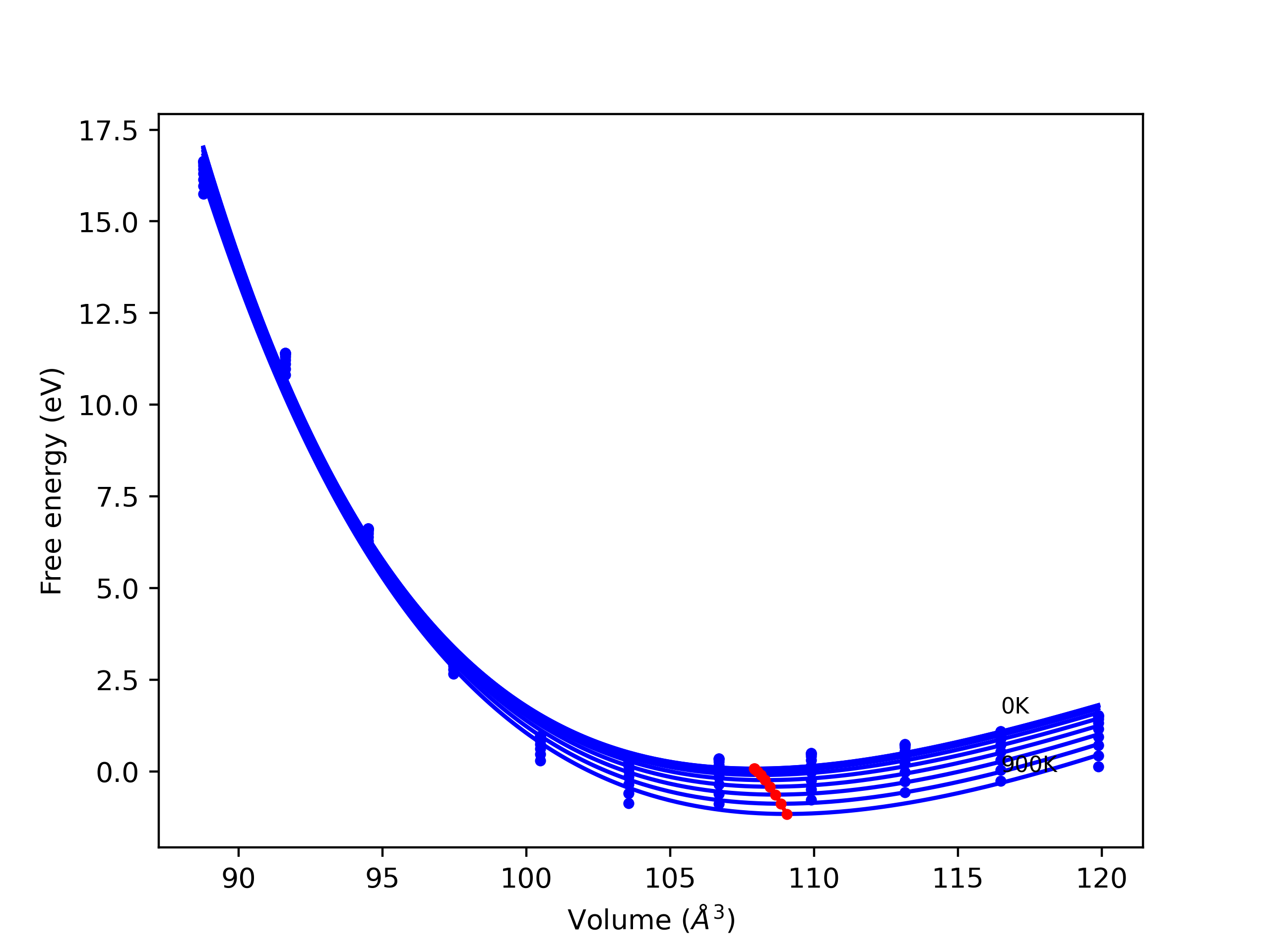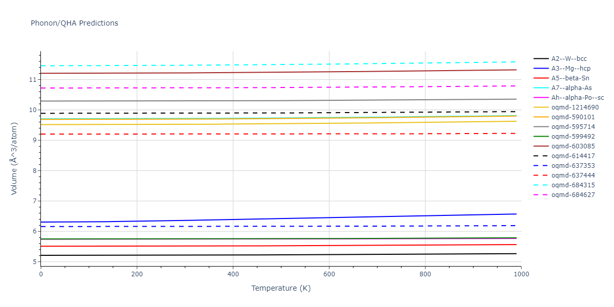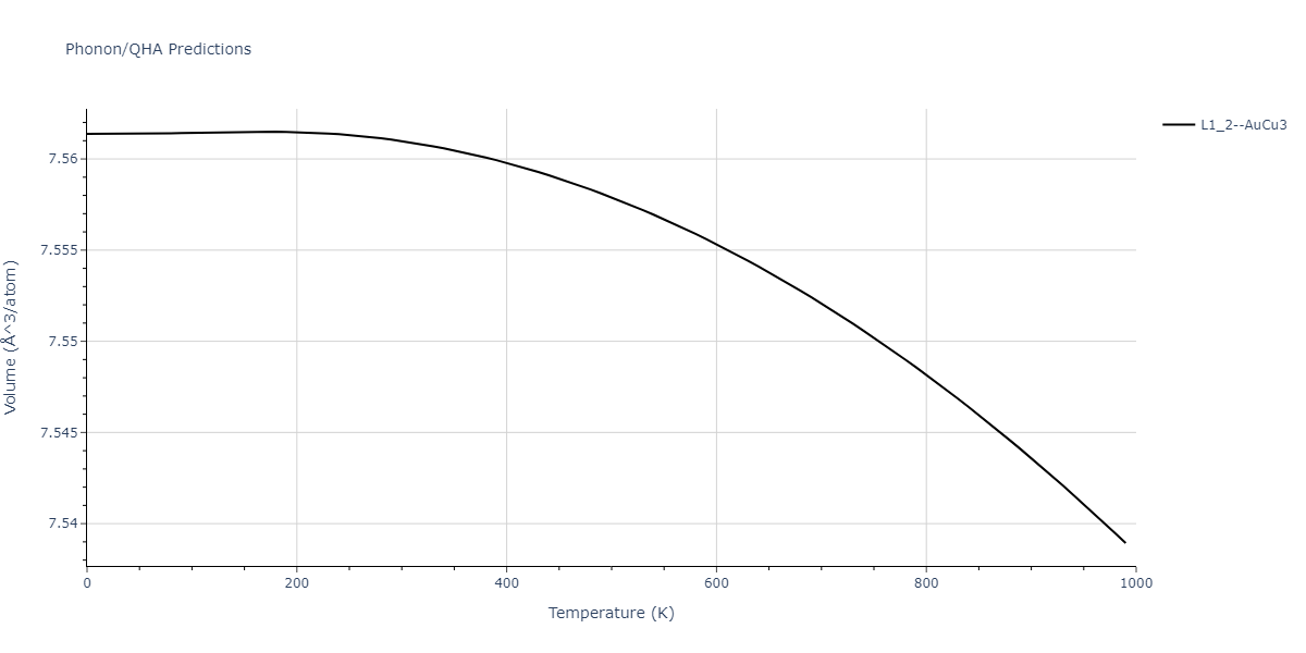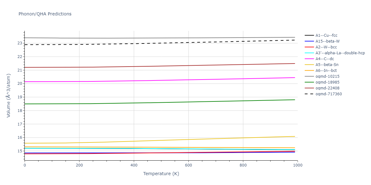 Plots of internal energy, Gibbs free energy, entropy, heat capacity and volume are shown here as a function of temperature for various crystal structures and liquid phases. The included crystal structures correspond to those in the Solid Structures vs. Temperature section, and the liquid phases to those in the Liquid Properties section. Internal energy and volume are taken from the associated structure relaxations mentioned in those previous sections. Constant pressure heat capacity is estimated using 3-point numerical derivatives of enthalpy versus temperature. Note that since all simulations done here are at 0 pressure, internal energy and enthalpy are equivalent.