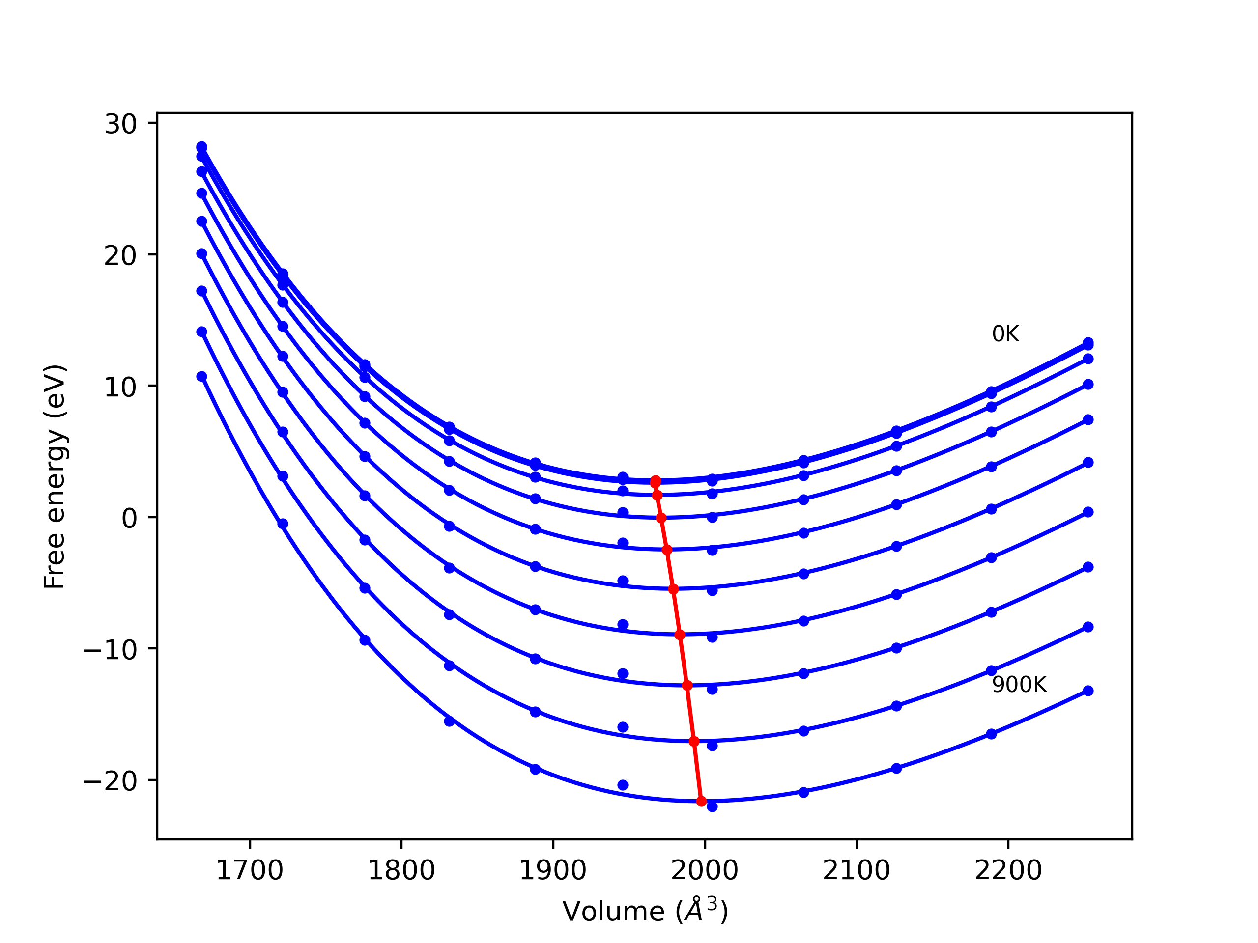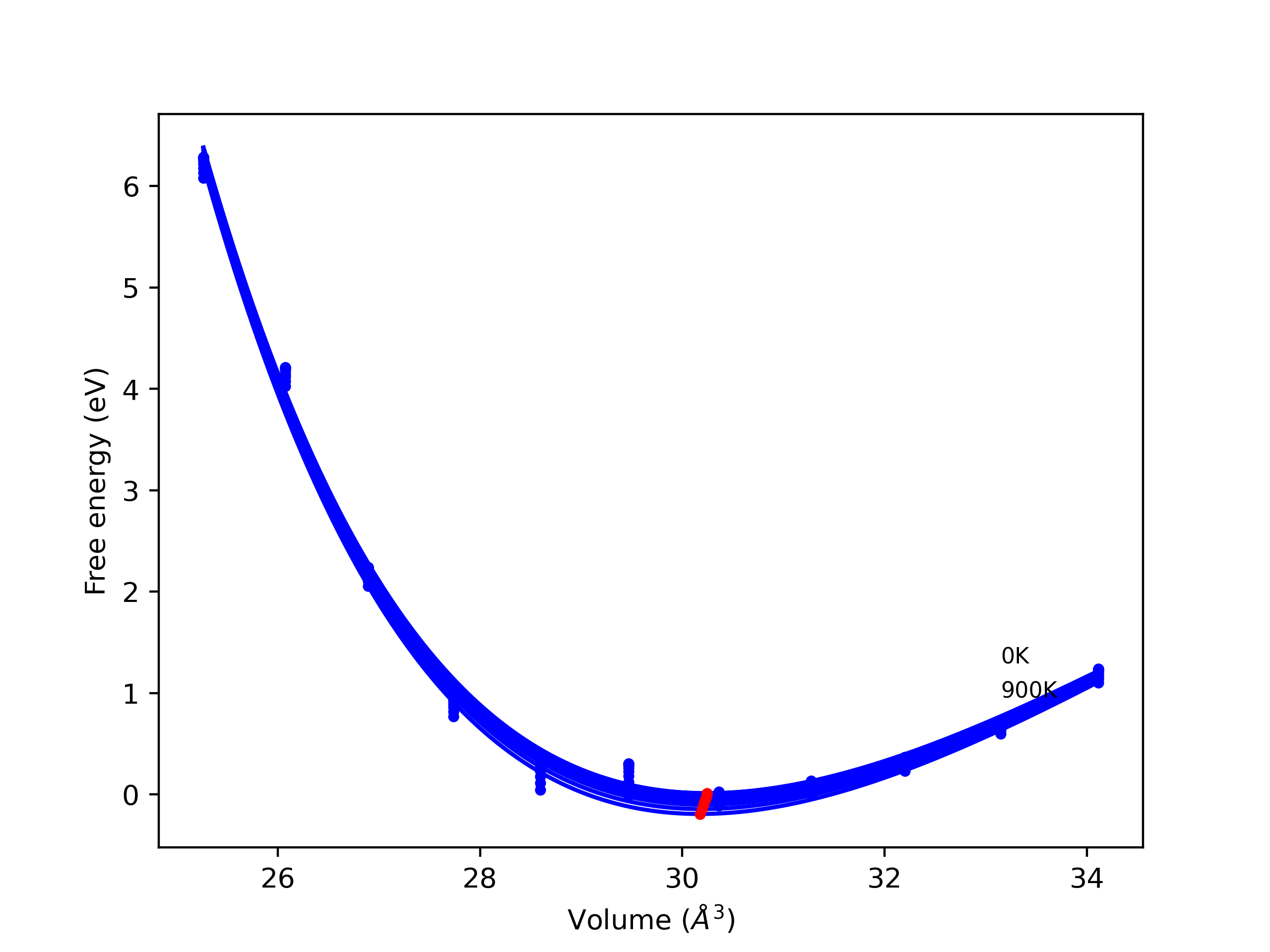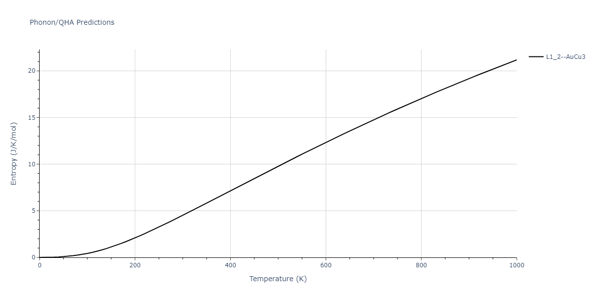 The Gibbs energies of the phases are estimated using thermodynamic integration between the interatomic potential in question and a simpler model with known Gibbs free energy values. For solids, the reference model is an Einstein solid, while for liquids it is the Uhlenbeck-Ford potential. Besides a short run at the start of the solid calculations to estimate Einstein model spring constants, the two calculations proceed similarly. Starting with the final relaxation configurations, the systems are stabilized for 25,000 steps. Then, over the next 50,000 steps the potential is swapped out for the reference potential. The system is then stabilized for another 25,000 steps with the reference model before a reverse swap of 50,000 steps is performed. The simulation ends with one final 25,000 step stabilization period. From the simulation, the irreversible work of transformation is estimated and used to compute the absolute Gibbs free energy of the target phase and potential relative to the reference potential. Entropy is estimated as the difference in enthalpy and Gibbs free energy and divided by temperature.