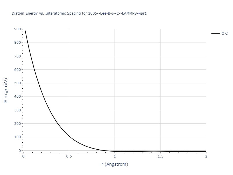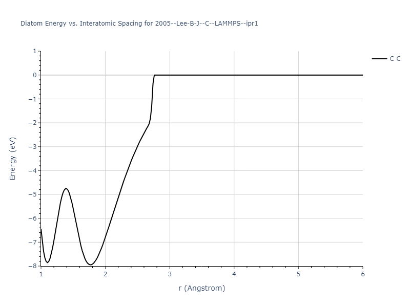 Plots of the potential energy vs interatomic spacing, r, are shown below for all diatom sets associated with the interatomic potential. This calculation provides insights into the functional form of the potential's two-body interactions. A system consisting of only two atoms is created, and the potential energy is evaluated for the atoms separated by 0.02 Å <= r <= 6.0> Å in intervals of 0.02 Å. Two plots are shown: one for the "standard" interaction distance range, and one for small values of r. The small r plot is useful for determining whether the potential is suitable for radiation studies.