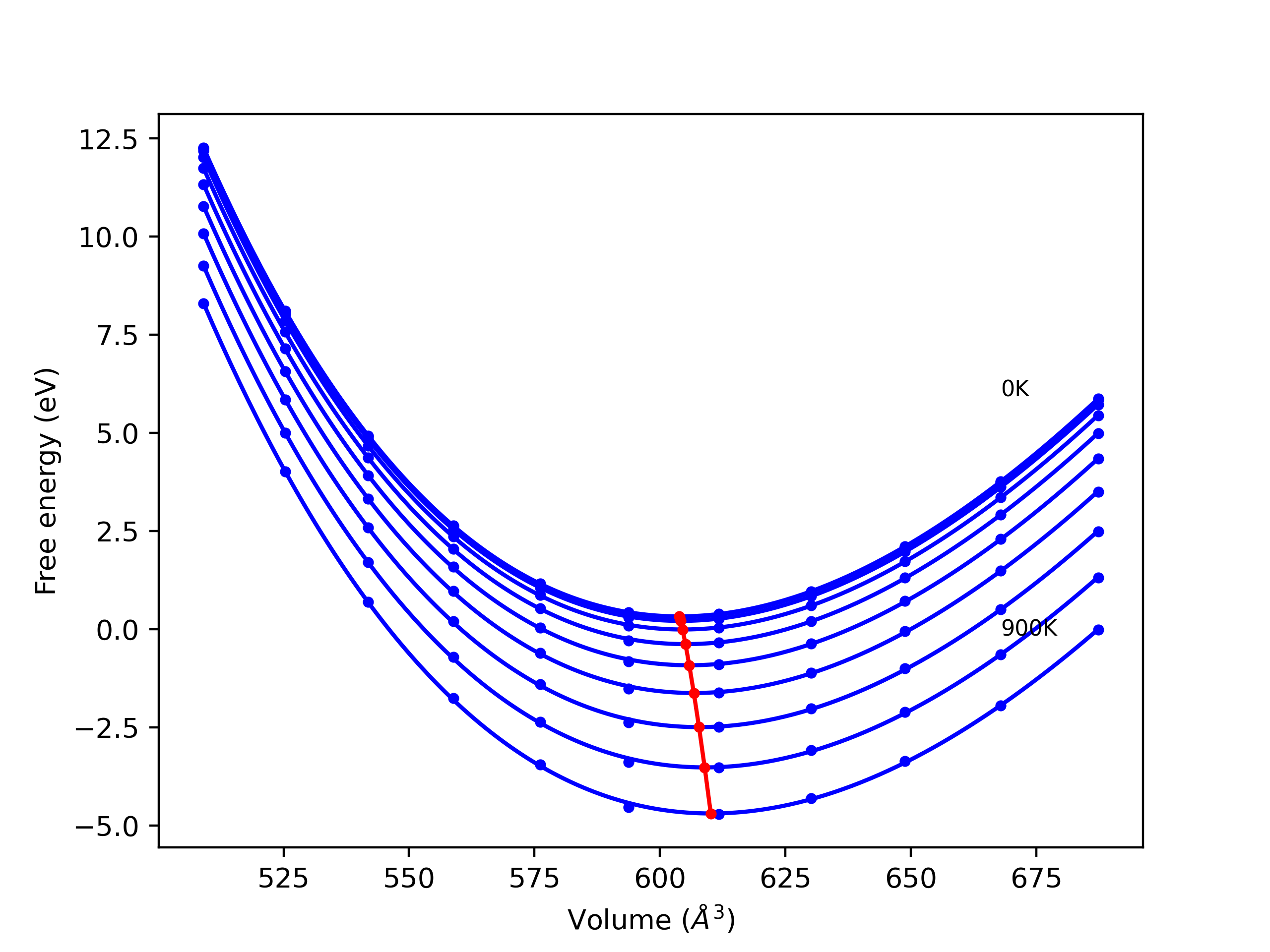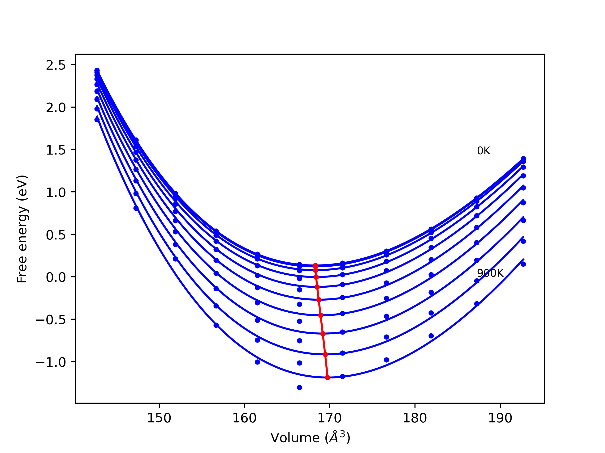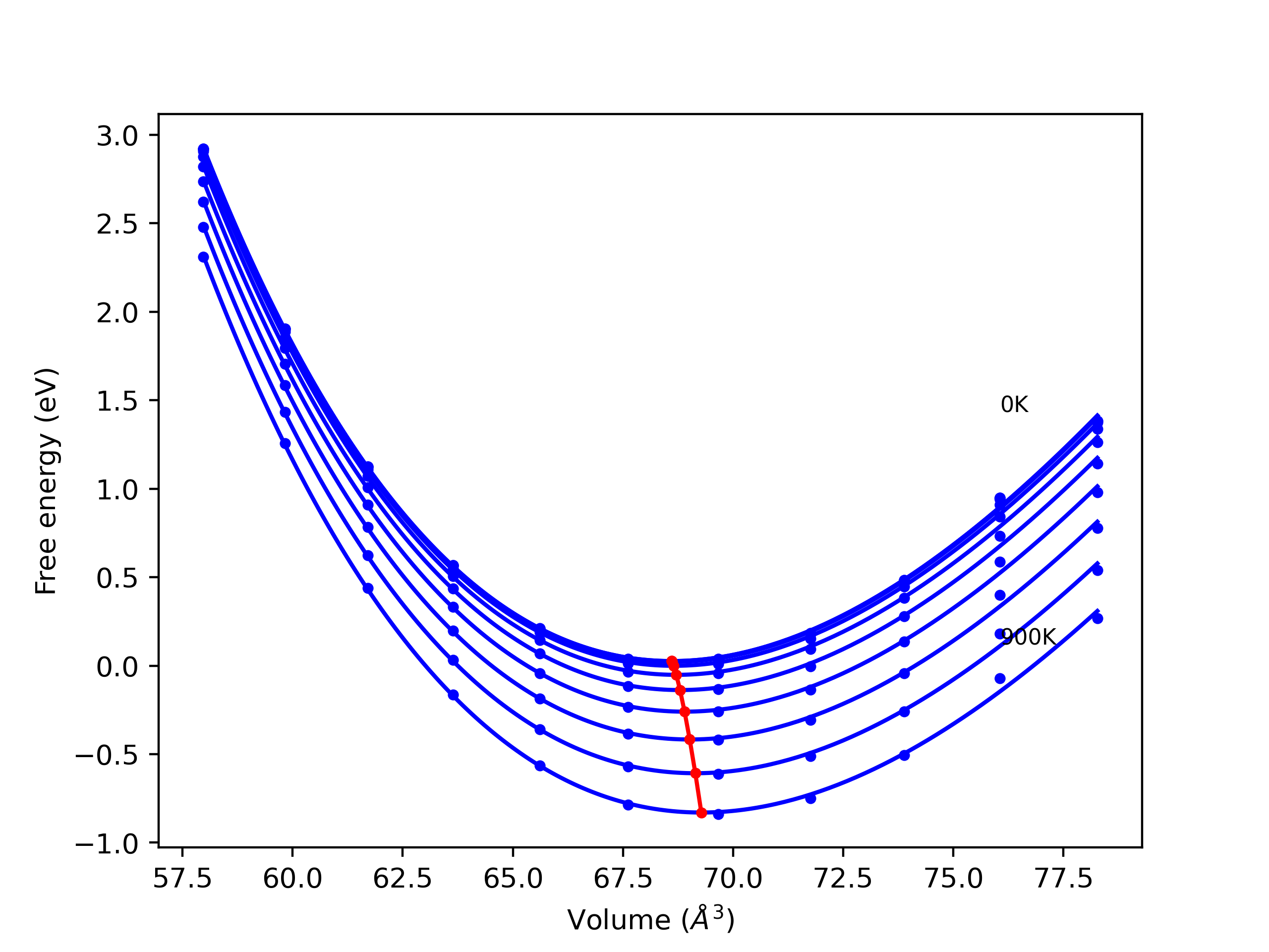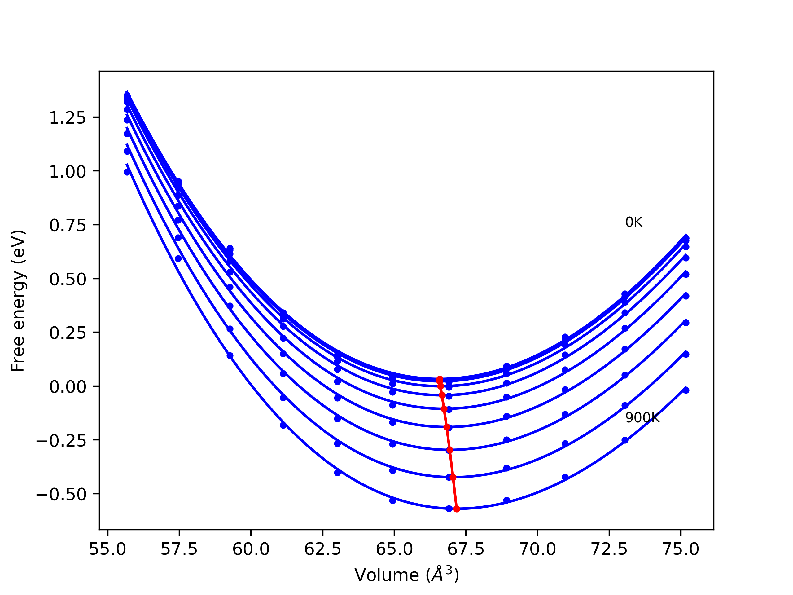Phonon band structures and crystal properties estimated from quasi-harmonic approximation (QHA) calculations are displayed for select crystals. The calculations were performed using phonopy and LAMMPS. For the phonon calculations, 3x3 supercells of the potential-specific relaxed crystals were used. The QHA calculations were based on 11 strain states ranging from -0.05 to 0.05.