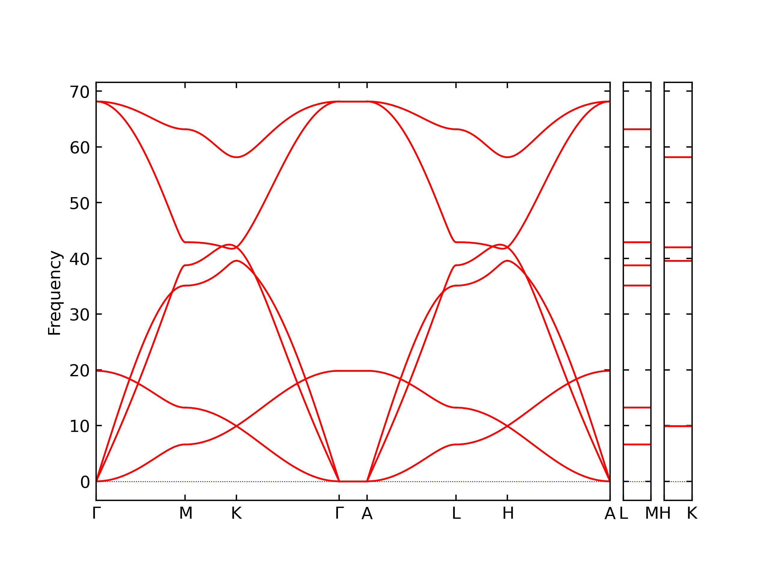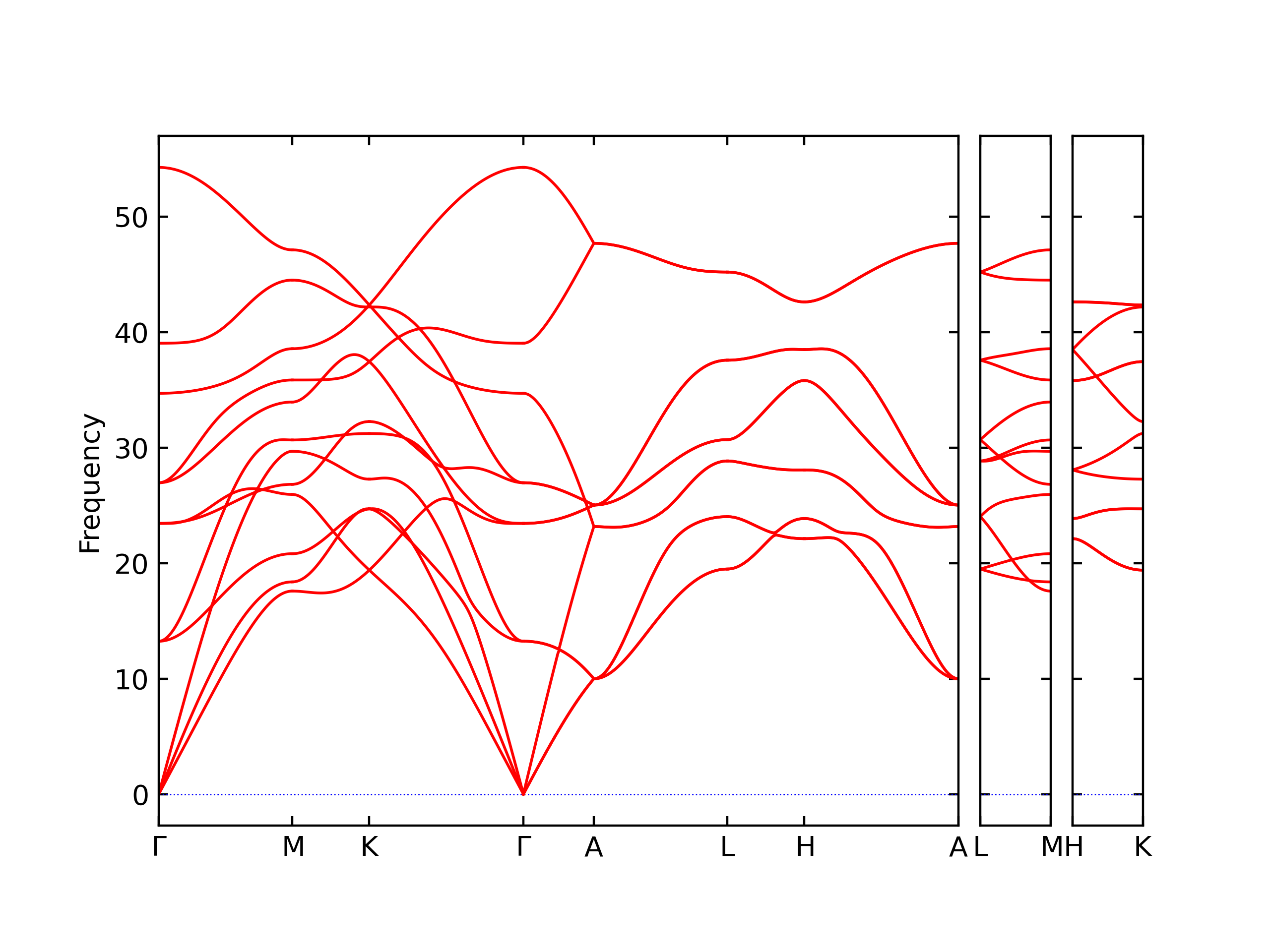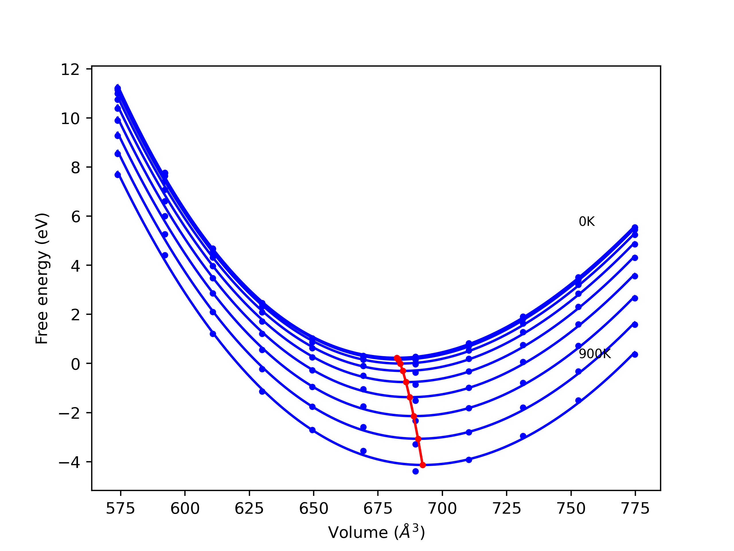 Phonon band structures and crystal properties estimated from quasi-harmonic approximation (QHA) calculations are displayed for select crystals. The calculations were performed using phonopy and LAMMPS. For the phonon calculations, 3x3 supercells of the potential-specific relaxed crystals were used. The QHA calculations were based on 11 strain states ranging from -0.05 to 0.05.