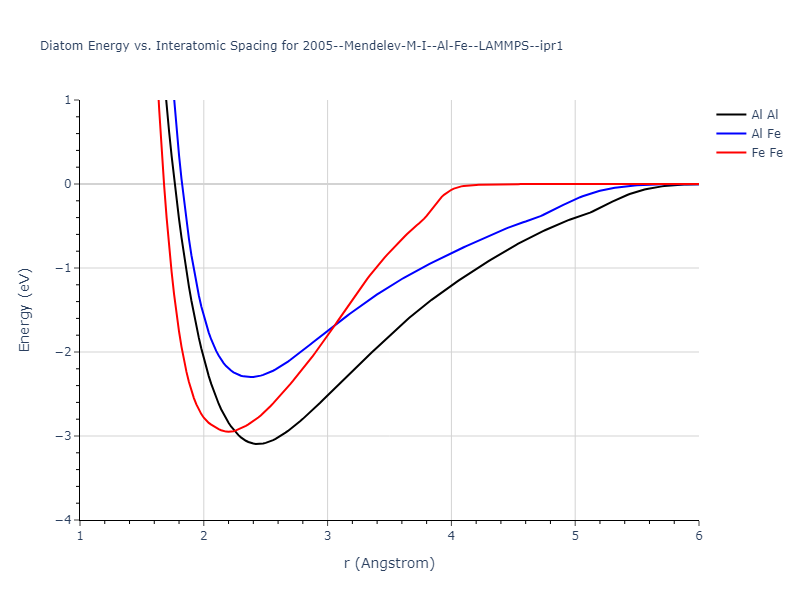 Plots of the potential energy vs interatomic spacing, r, are shown below for all diatom sets associated with the interatomic potential. This calculation provides insights into the functional form of the potential's two-body interactions. A system consisting of only two atoms is created, and the potential energy is evaluated for the atoms separated by 0.02 Å <= r <= 6.0> Å in intervals of 0.02 Å. Two plots are shown: one for the "standard" interaction distance range, and one for small values of r. The small r plot is useful for determining whether the potential is suitable for radiation studies.