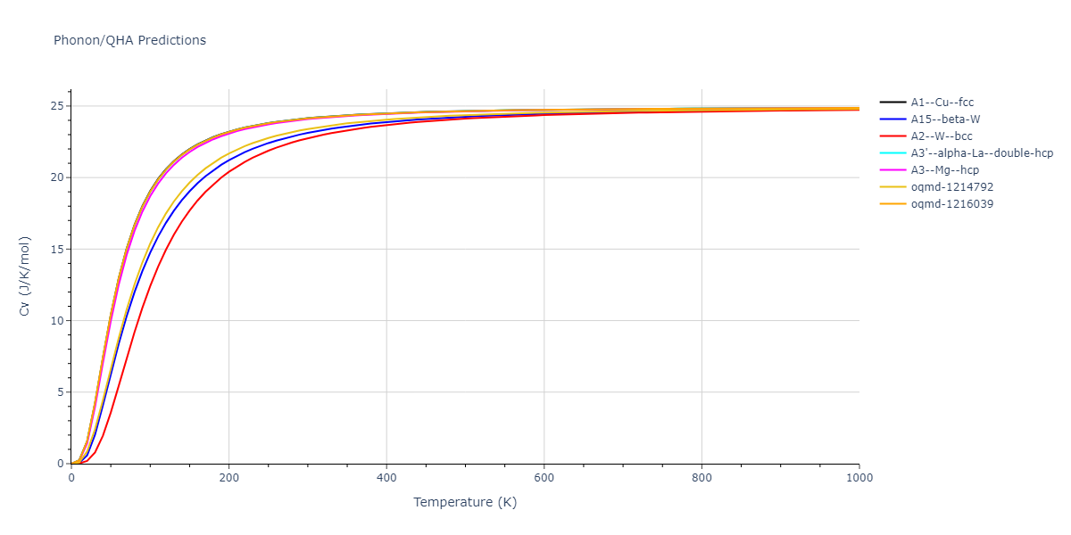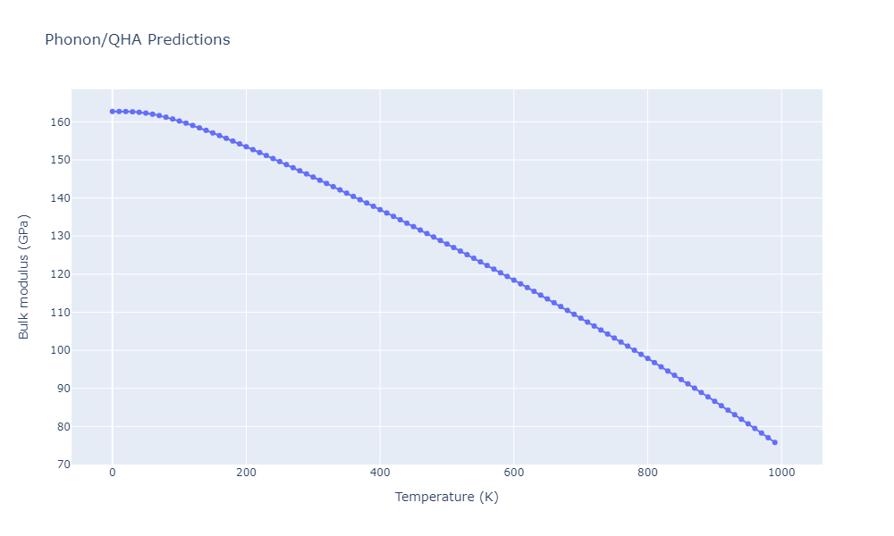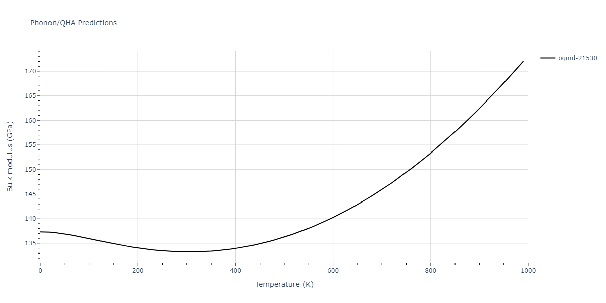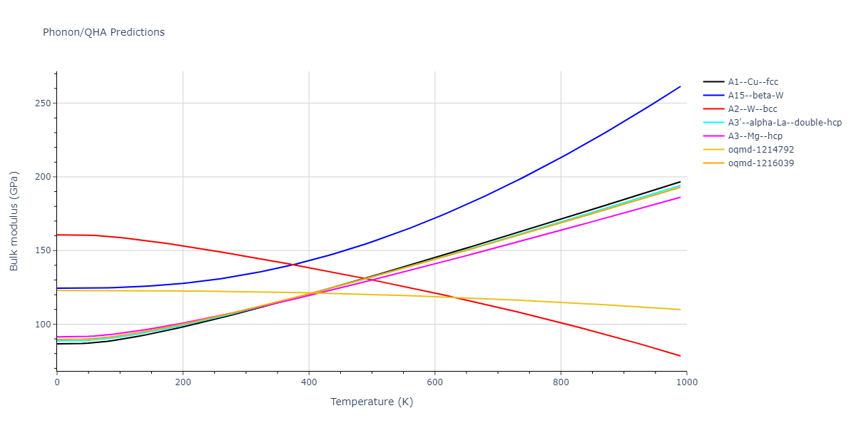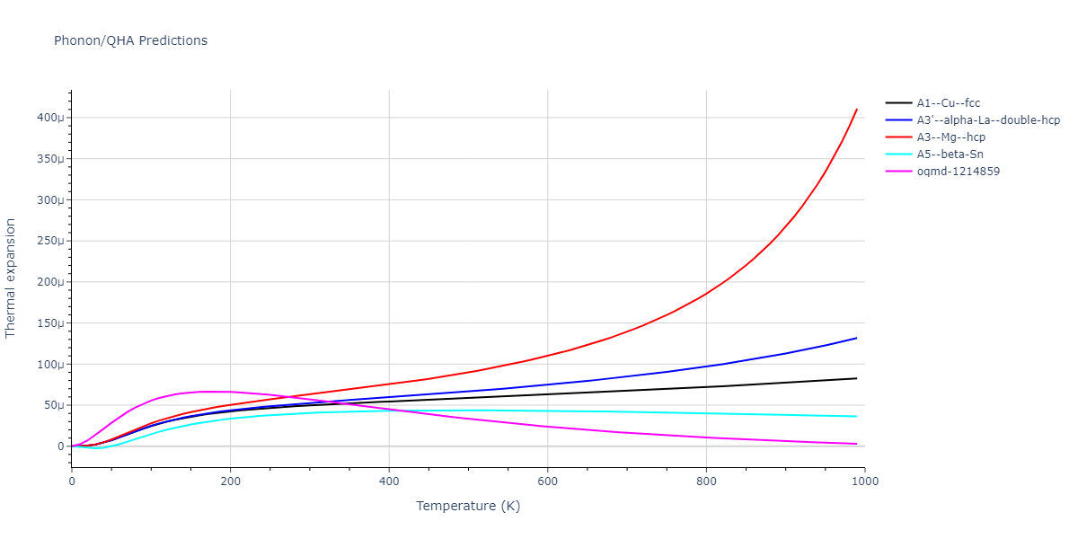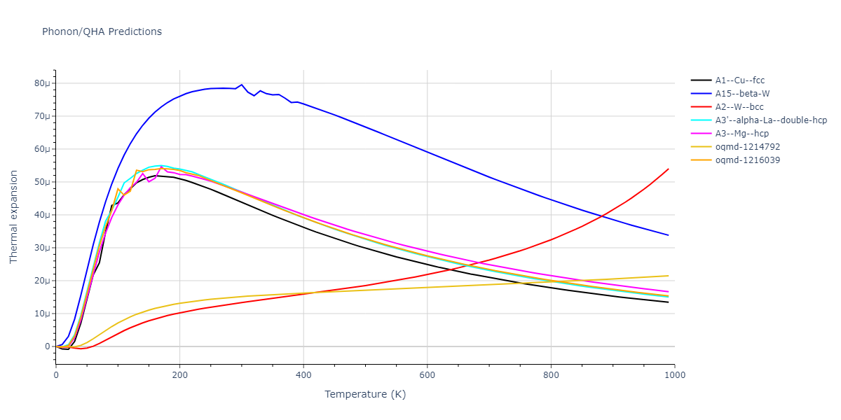 Phonon band structures and crystal properties estimated from quasi-harmonic approximation (QHA) calculations are displayed for select crystals. The calculations were performed using phonopy and LAMMPS. For the phonon calculations, 3x3 supercells of the potential-specific relaxed crystals were used. The QHA calculations were based on 11 strain states ranging from -0.05 to 0.05.