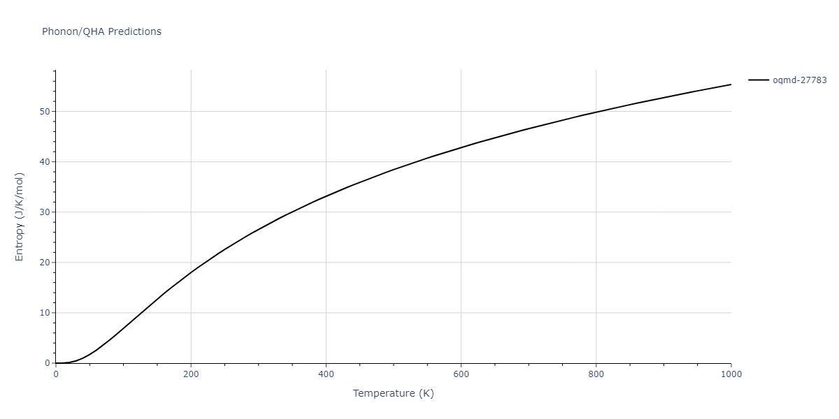 The Gibbs energies of the phases are estimated using thermodynamic integration between the interatomic potential in question and a simpler model with known Gibbs free energy values. For solids, the reference model is an Einstein solid, while for liquids it is the Uhlenbeck-Ford potential. Besides a short run at the start of the solid calculations to estimate Einstein model spring constants, the two calculations proceed similarly. Starting with the final relaxation configurations, the systems are stabilized for 25,000 steps. Then, over the next 50,000 steps the potential is swapped out for the reference potential. The system is then stabilized for another 25,000 steps with the reference model before a reverse swap of 50,000 steps is performed. The simulation ends with one final 25,000 step stabilization period. From the simulation, the irreversible work of transformation is estimated and used to compute the absolute Gibbs free energy of the target phase and potential relative to the reference potential. Entropy is estimated as the difference in enthalpy and Gibbs free energy and divided by temperature.