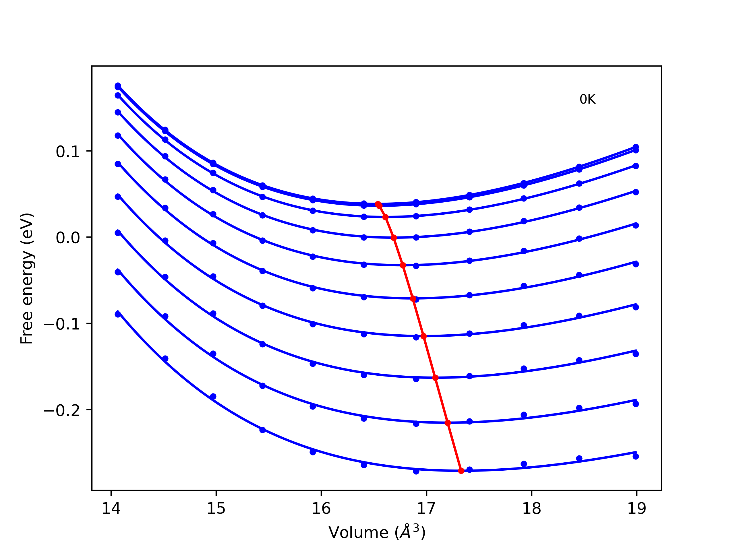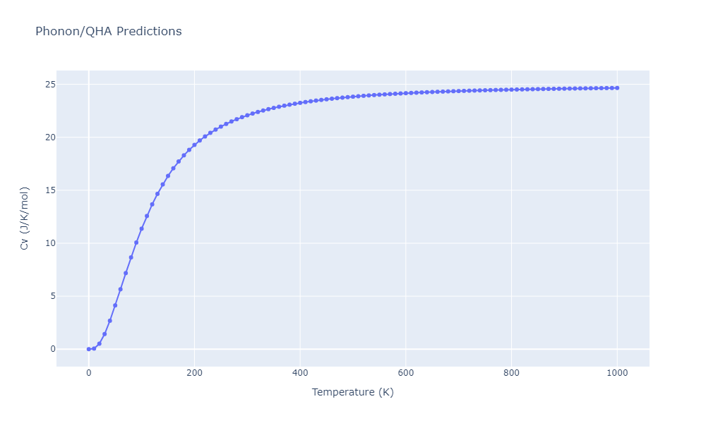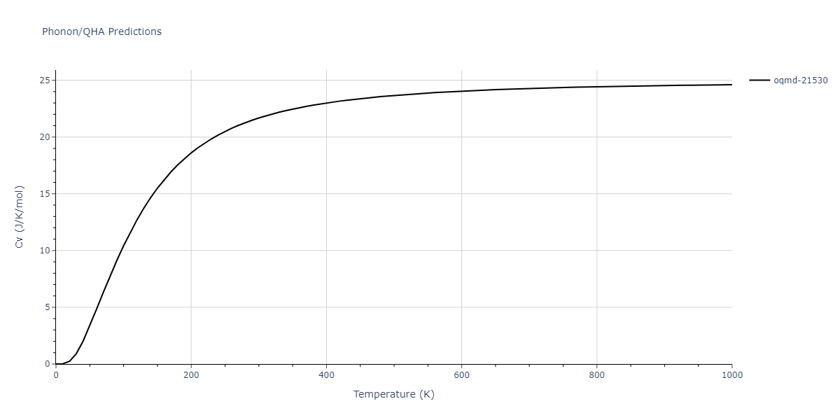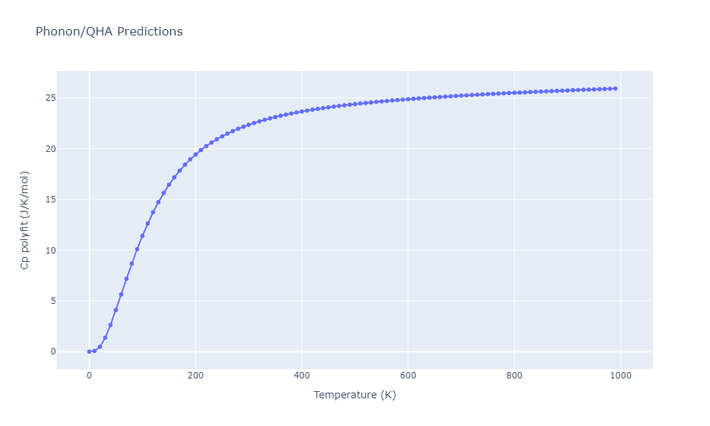 Plots of internal energy, Gibbs free energy, entropy, heat capacity and volume are shown here as a function of temperature for various crystal structures and liquid phases. The included crystal structures correspond to those in the Solid Structures vs. Temperature section, and the liquid phases to those in the Liquid Properties section. Internal energy and volume are taken from the associated structure relaxations mentioned in those previous sections. Constant pressure heat capacity is estimated using 3-point numerical derivatives of enthalpy versus temperature. Note that since all simulations done here are at 0 pressure, internal energy and enthalpy are equivalent.