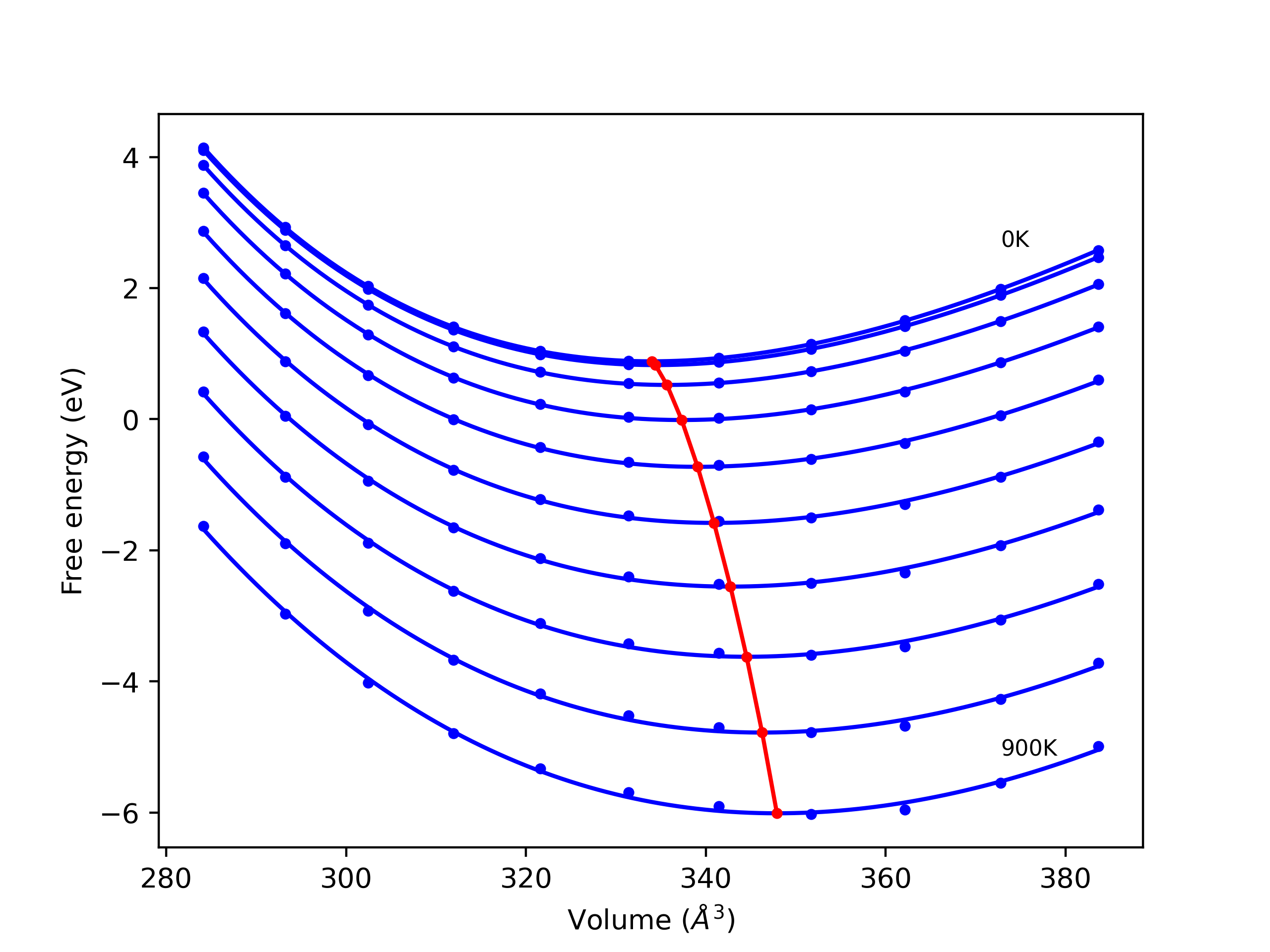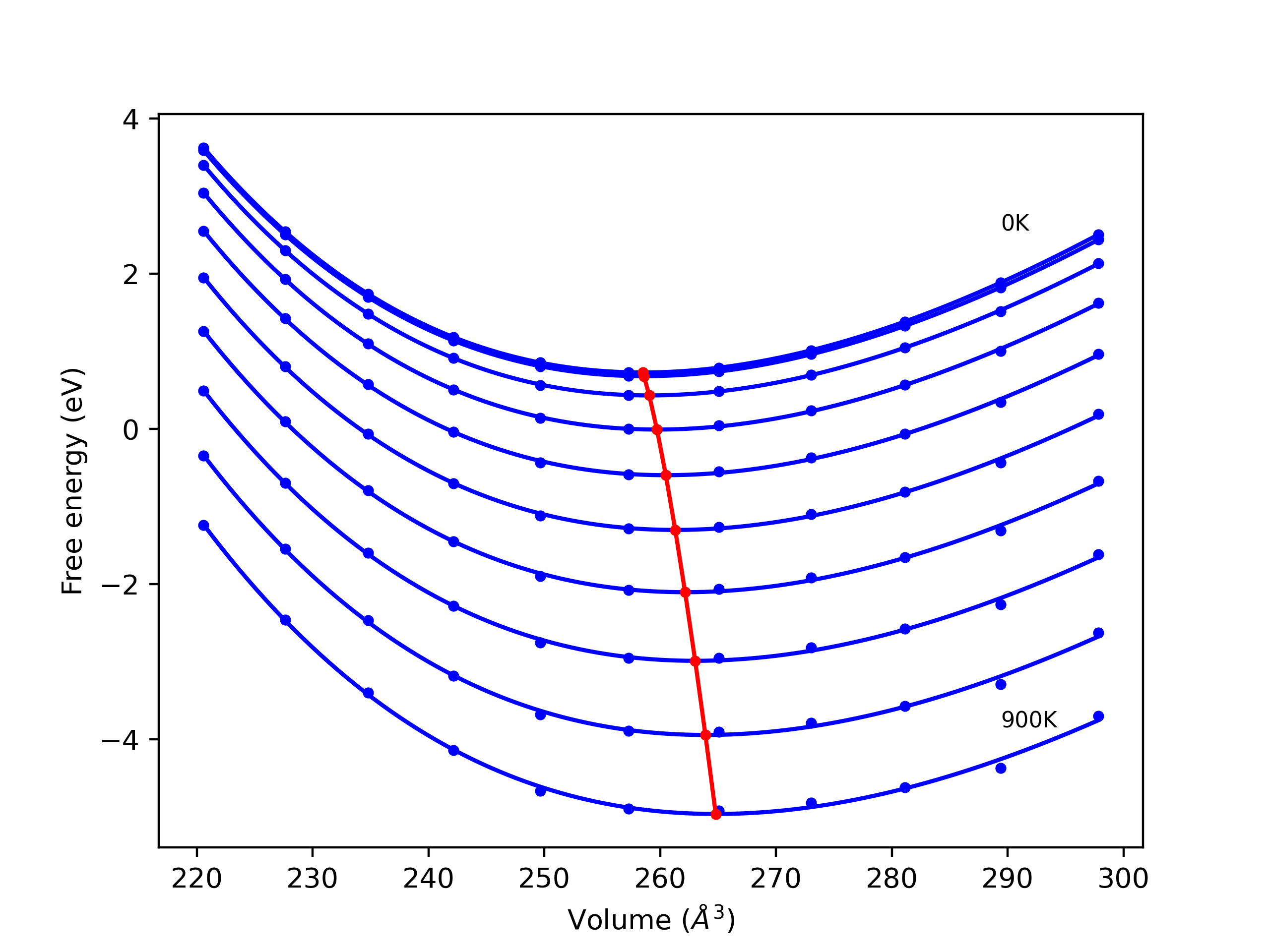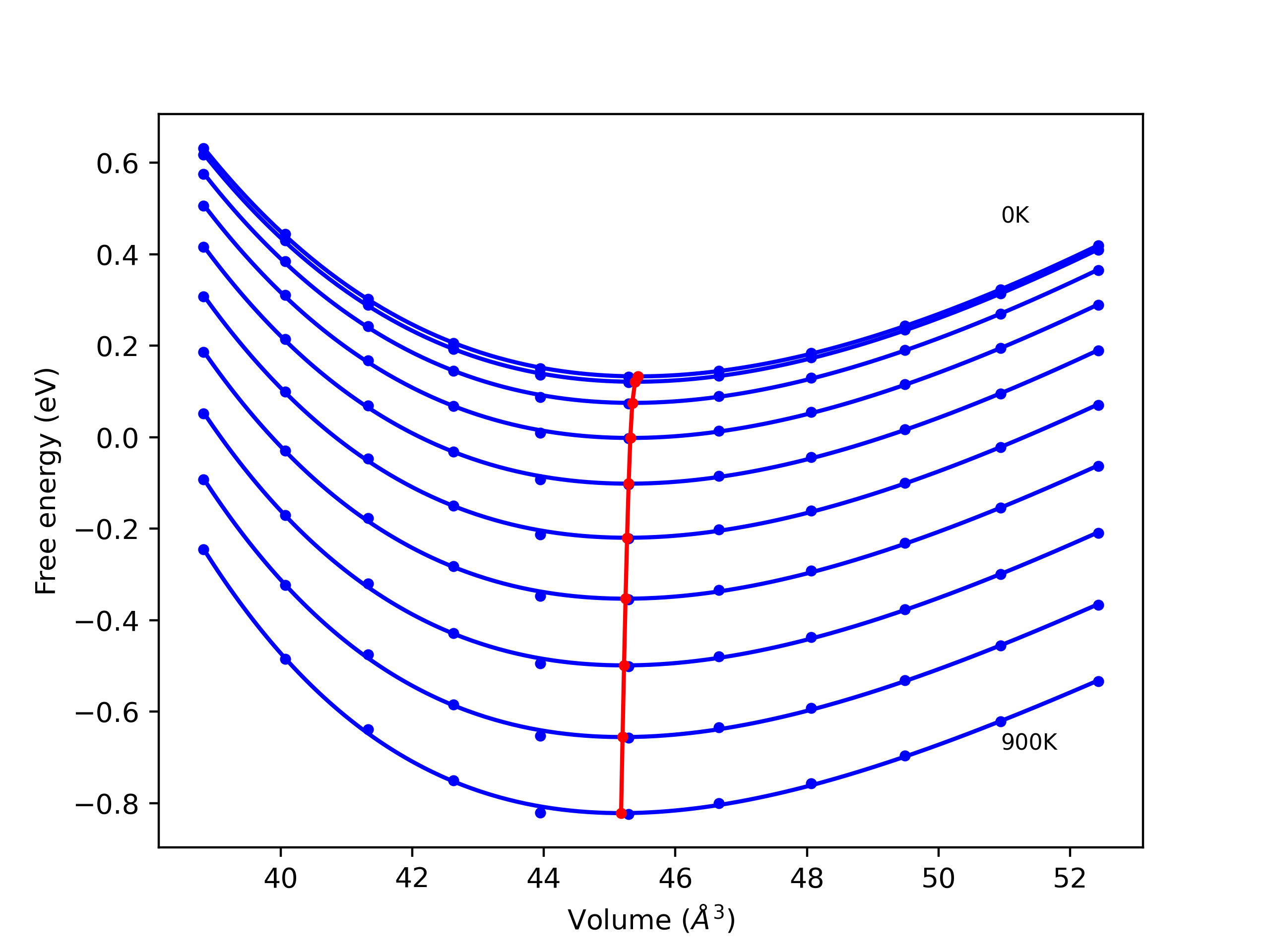 Plots of lattice and elastic constants are shown as a function of temperature. The 0K points were taken from the Crystal Structure Predictions and the Elastic Constants Predictions sections above for the unique crystal structures relaxed with the "dynamic" method. Starting from the 0 K relaxed crystal unit cells, supercell systems are created by replicating all three dimensions by the same multiplier to achieve at least 4000 atoms. The systems are then relaxed at 50 K and zero pressure using 1 million NPT steps. Lattice constants are estimated by averaging the measured box dimensions. Temperatures are iteratively increased by 50 K, with each subsequent relaxation calculation starting from the final atomic configuration at the previous temperature and relaxing for another 1 million steps.