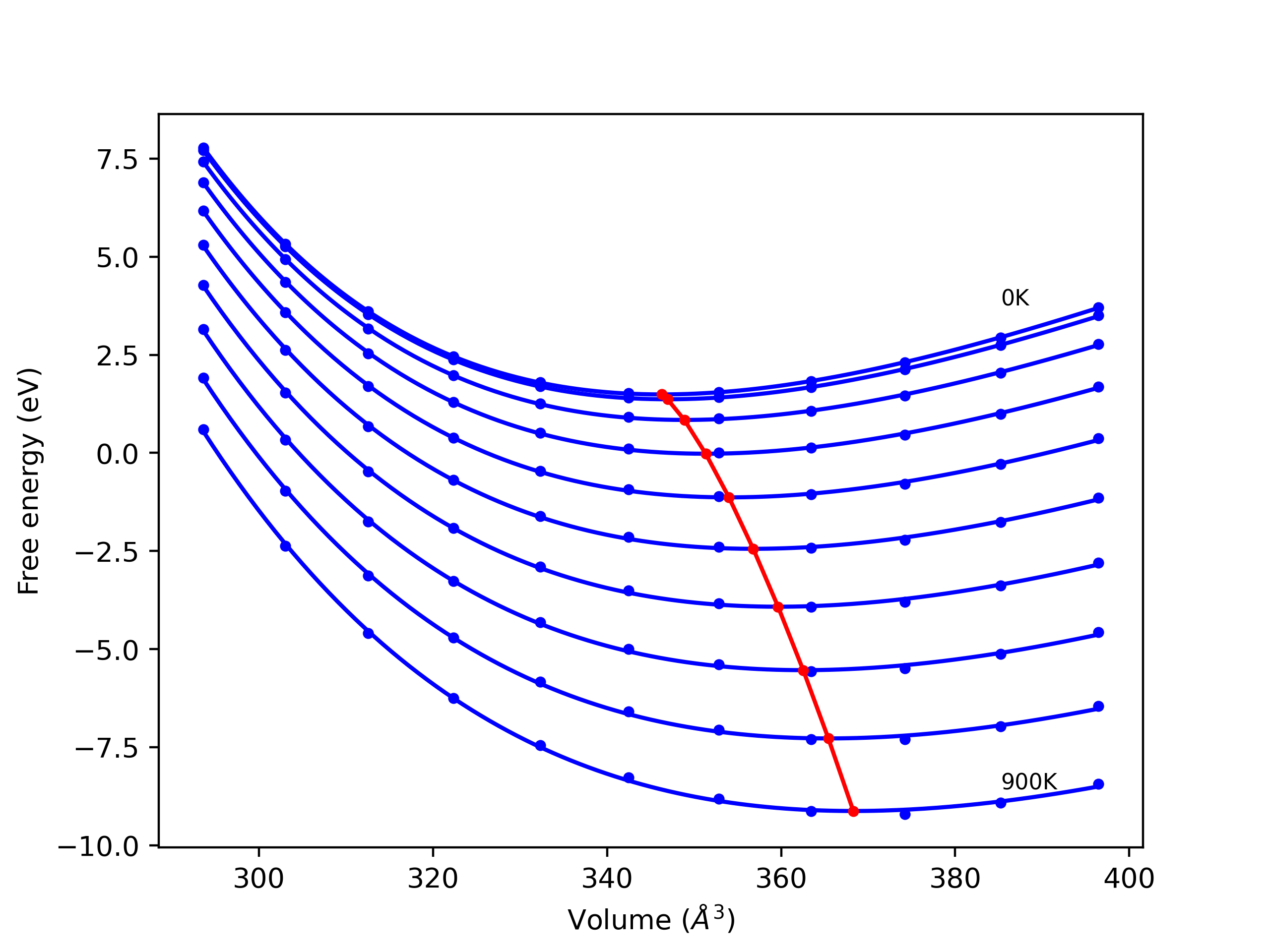 Phonon band structures and crystal properties estimated from quasi-harmonic approximation (QHA) calculations are displayed for select crystals. The calculations were performed using phonopy and LAMMPS. For the phonon calculations, 3x3 supercells of the potential-specific relaxed crystals were used. The QHA calculations were based on 11 strain states ranging from -0.05 to 0.05.