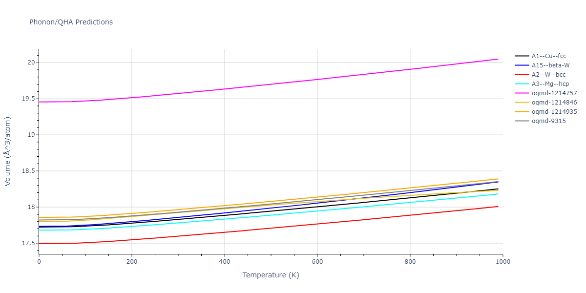 Phonon band structures and crystal properties estimated from quasi-harmonic approximation (QHA) calculations are displayed for select crystals. The calculations were performed using phonopy and LAMMPS. For the phonon calculations, 3x3 supercells of the potential-specific relaxed crystals were used. The QHA calculations were based on 11 strain states ranging from -0.05 to 0.05.