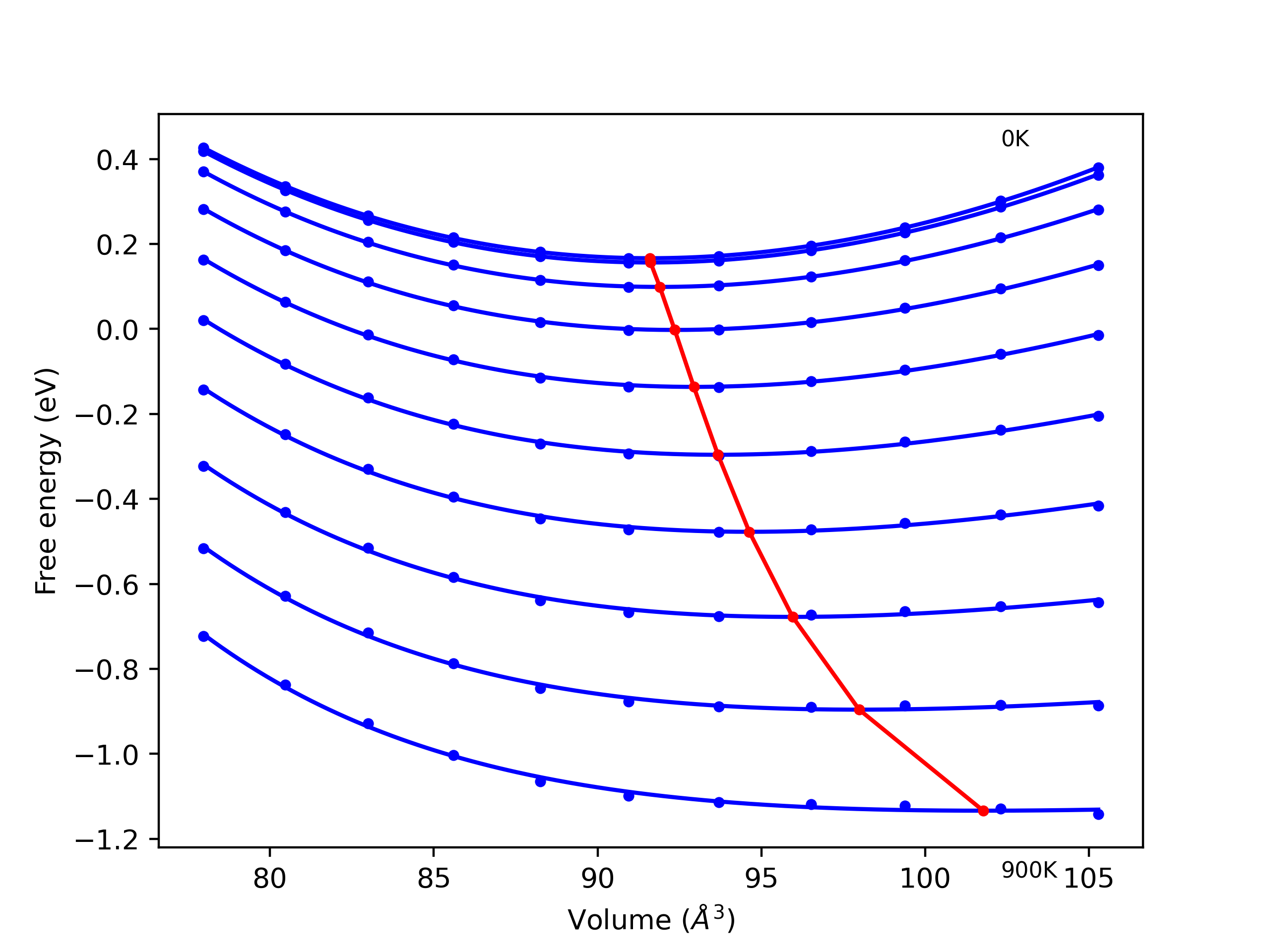 Plots of internal energy, Gibbs free energy, entropy, heat capacity and volume are shown here as a function of temperature for various crystal structures and liquid phases. The included crystal structures correspond to those in the Solid Structures vs. Temperature section, and the liquid phases to those in the Liquid Properties section. Internal energy and volume are taken from the associated structure relaxations mentioned in those previous sections. Constant pressure heat capacity is estimated using 3-point numerical derivatives of enthalpy versus temperature. Note that since all simulations done here are at 0 pressure, internal energy and enthalpy are equivalent.