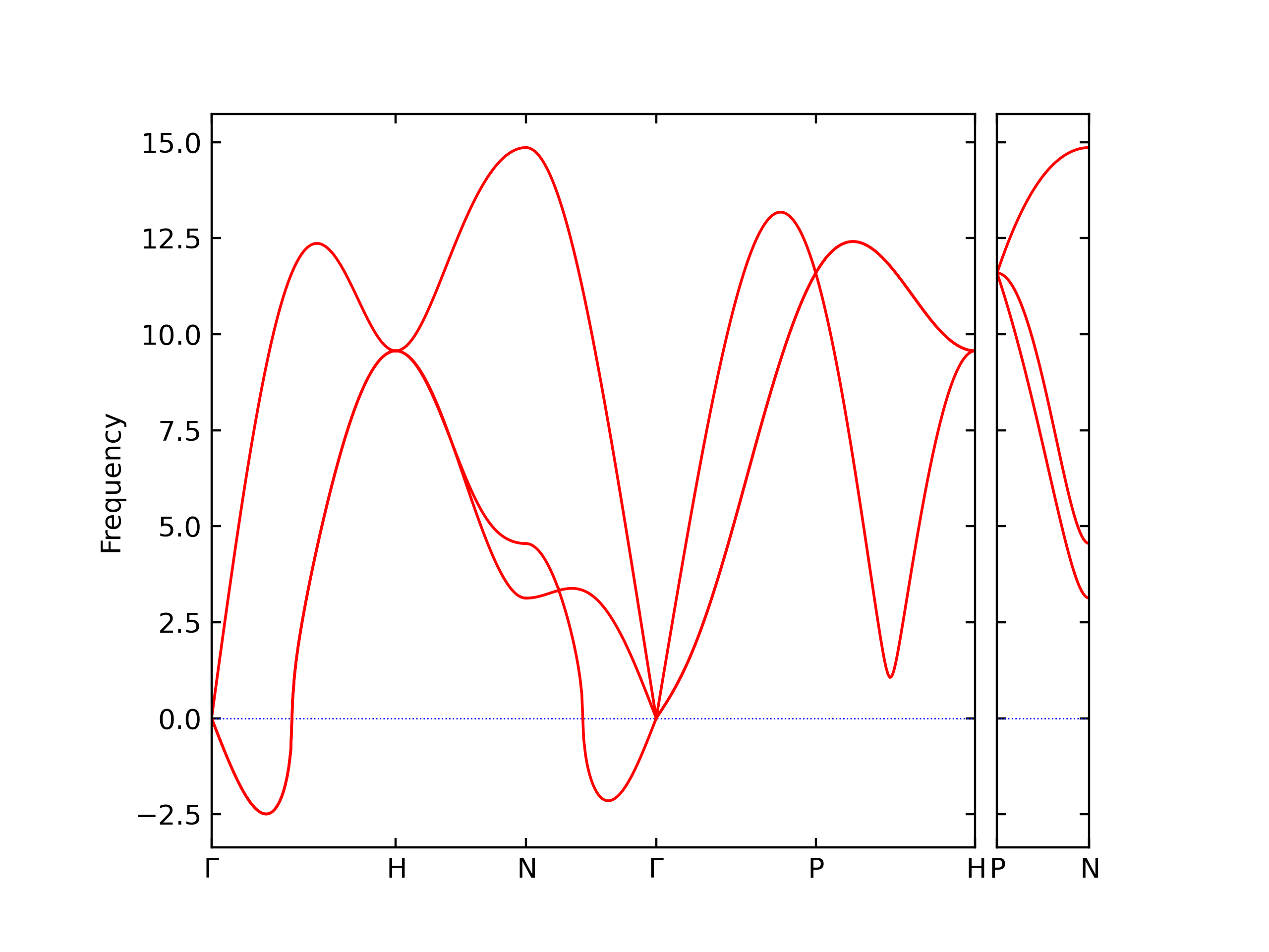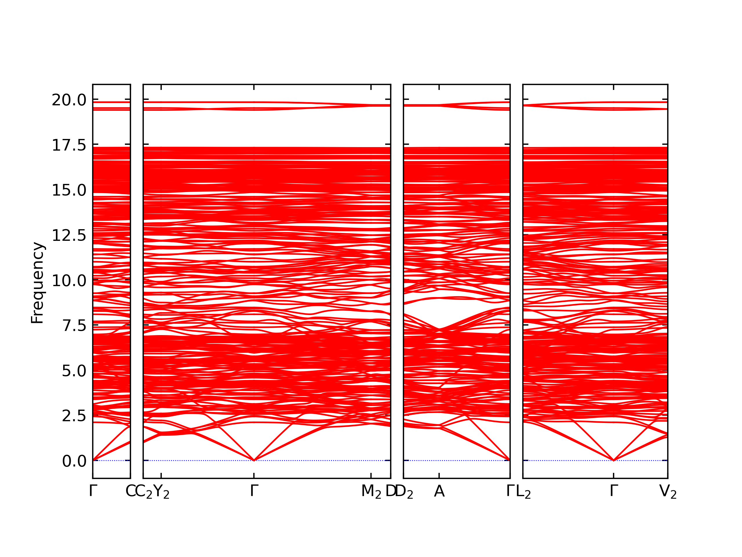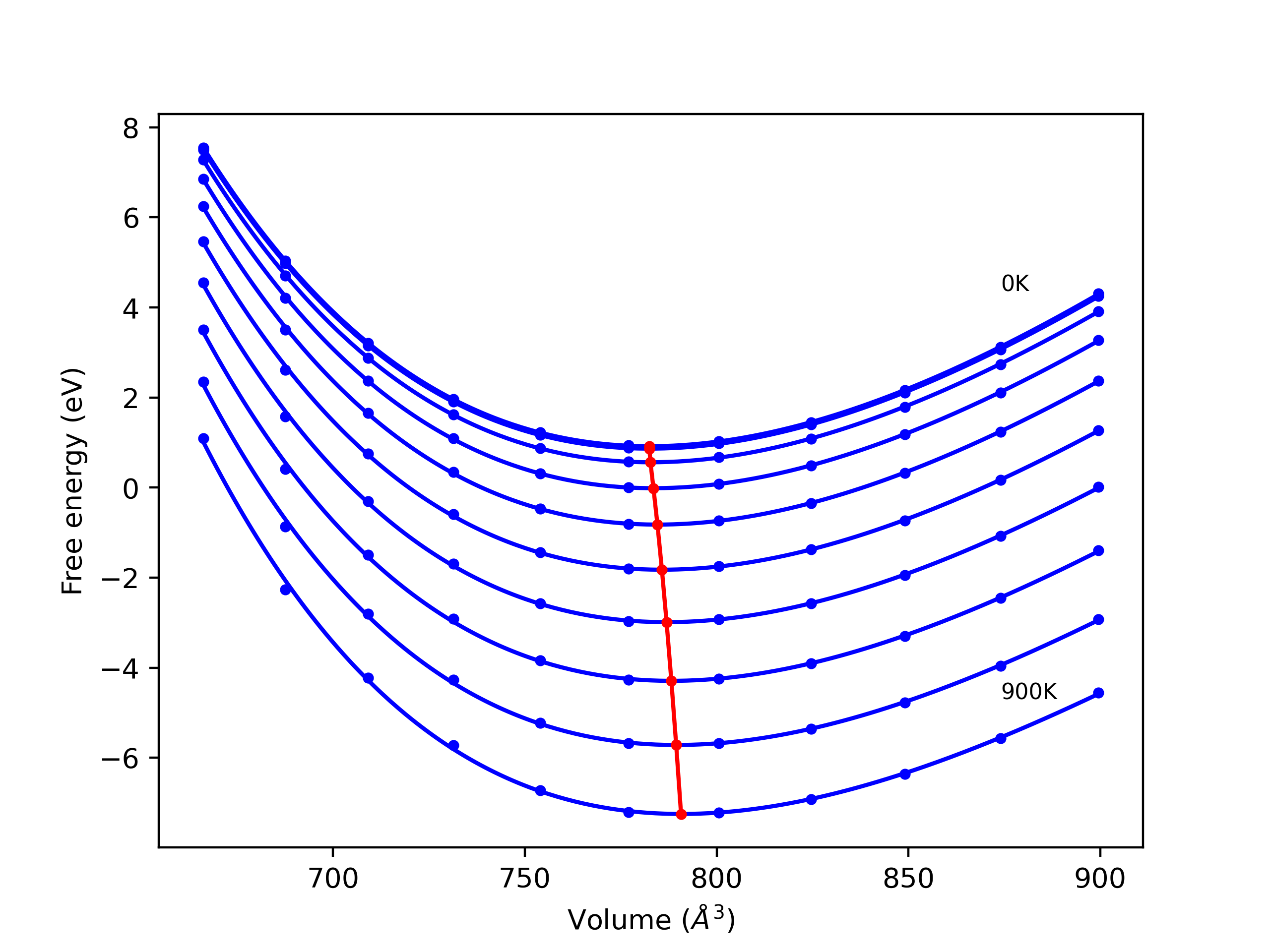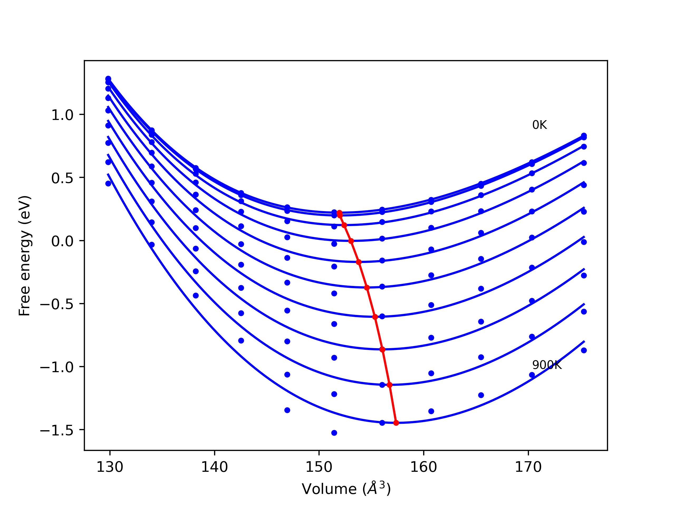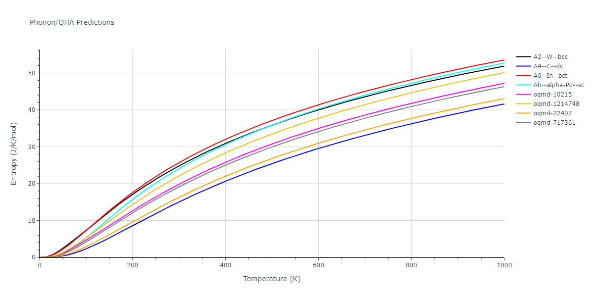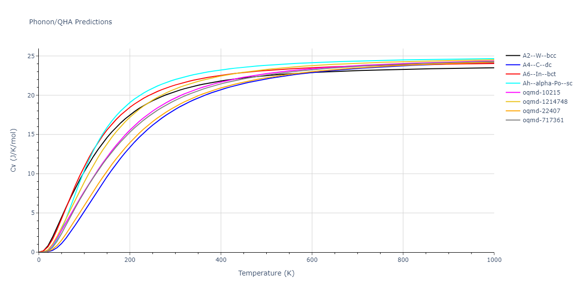 Phonon band structures and crystal properties estimated from quasi-harmonic approximation (QHA) calculations are displayed for select crystals. The calculations were performed using phonopy and LAMMPS. For the phonon calculations, 3x3 supercells of the potential-specific relaxed crystals were used. The QHA calculations were based on 11 strain states ranging from -0.05 to 0.05.