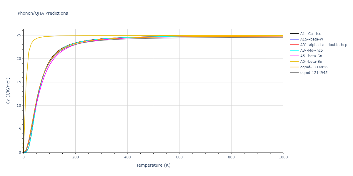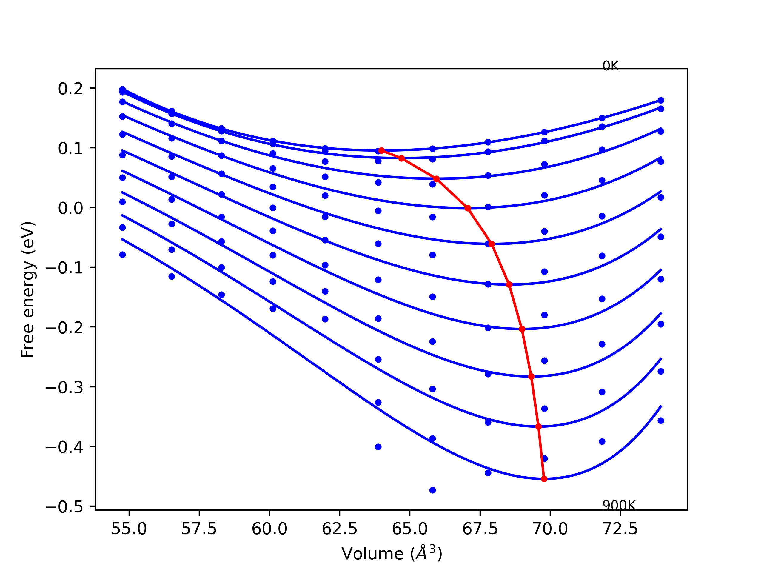 Phonon band structures and crystal properties estimated from quasi-harmonic approximation (QHA) calculations are displayed for select crystals. The calculations were performed using phonopy and LAMMPS. For the phonon calculations, 3x3 supercells of the potential-specific relaxed crystals were used. The QHA calculations were based on 11 strain states ranging from -0.05 to 0.05.