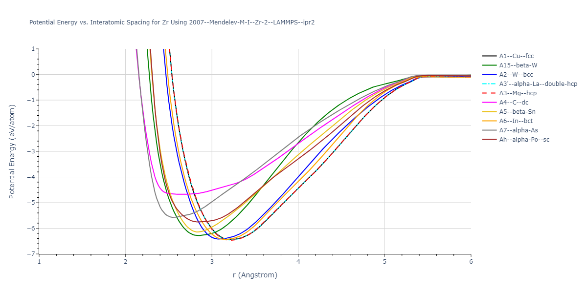 Plots of potential energy vs interatomic spacing, r, are shown below for a number of crystal structures. The structures are generated based on the ideal atomic positions and b/a and c/a lattice parameter ratios for a given crystal prototype. The size of the system is then uniformly scaled, and the energy calculated without relaxing the system. To obtain these plots, values of r are evaluated every 0.02 Å up to 6 Å.
