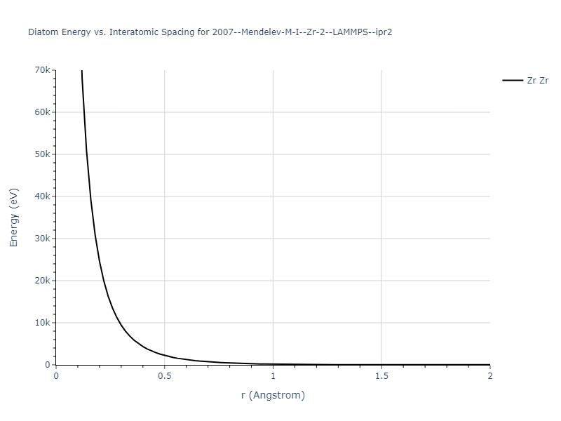Plots of the potential energy vs interatomic spacing, r, are shown below for all diatom sets associated with the interatomic potential. This calculation provides insights into the functional form of the potential's two-body interactions. A system consisting of only two atoms is created, and the potential energy is evaluated for the atoms separated by 0.02 Å <= r <= 6.0> Å in intervals of 0.02 Å. Two plots are shown: one for the "standard" interaction distance range, and one for small values of r. The small r plot is useful for determining whether the potential is suitable for radiation studies.