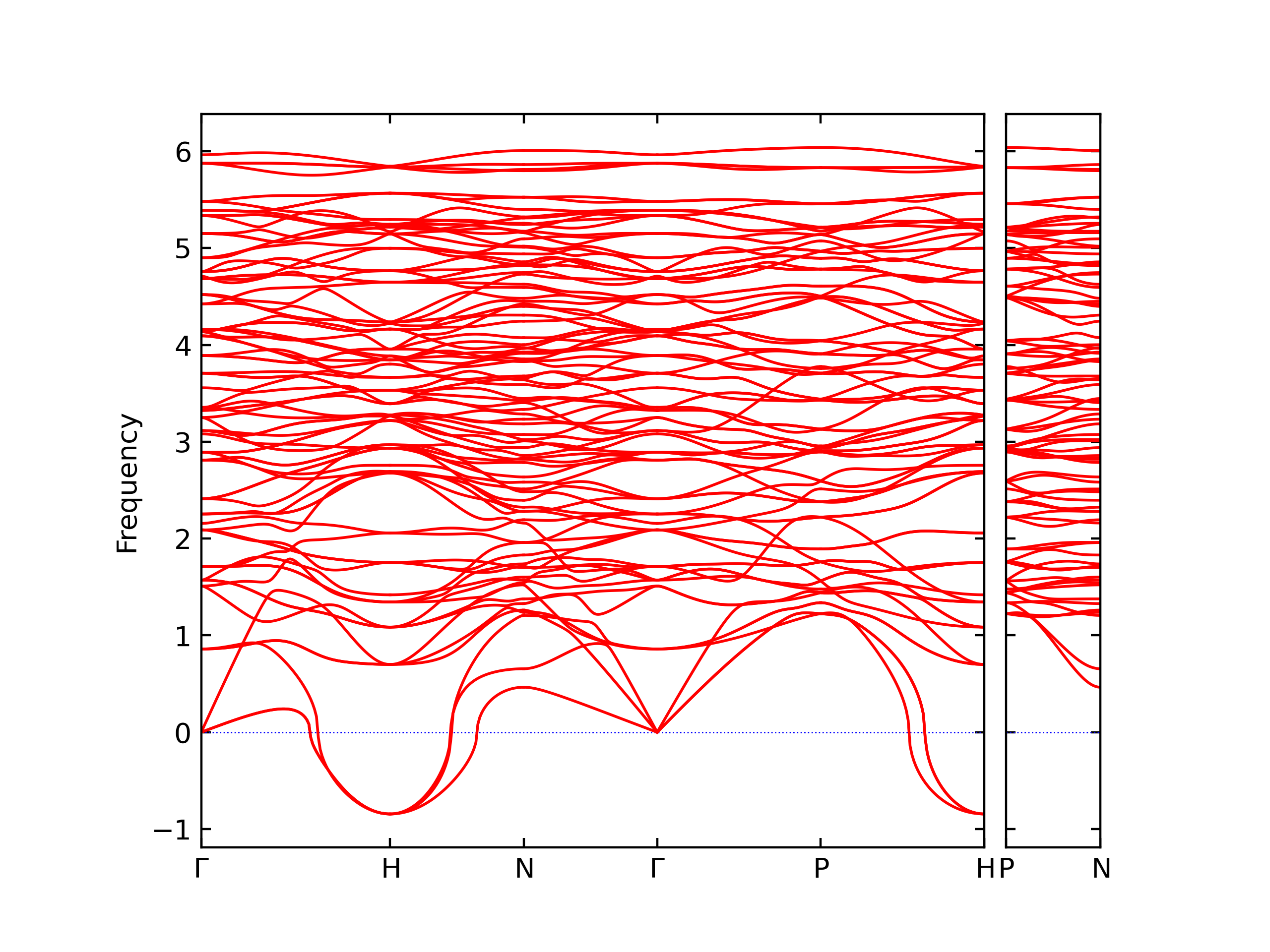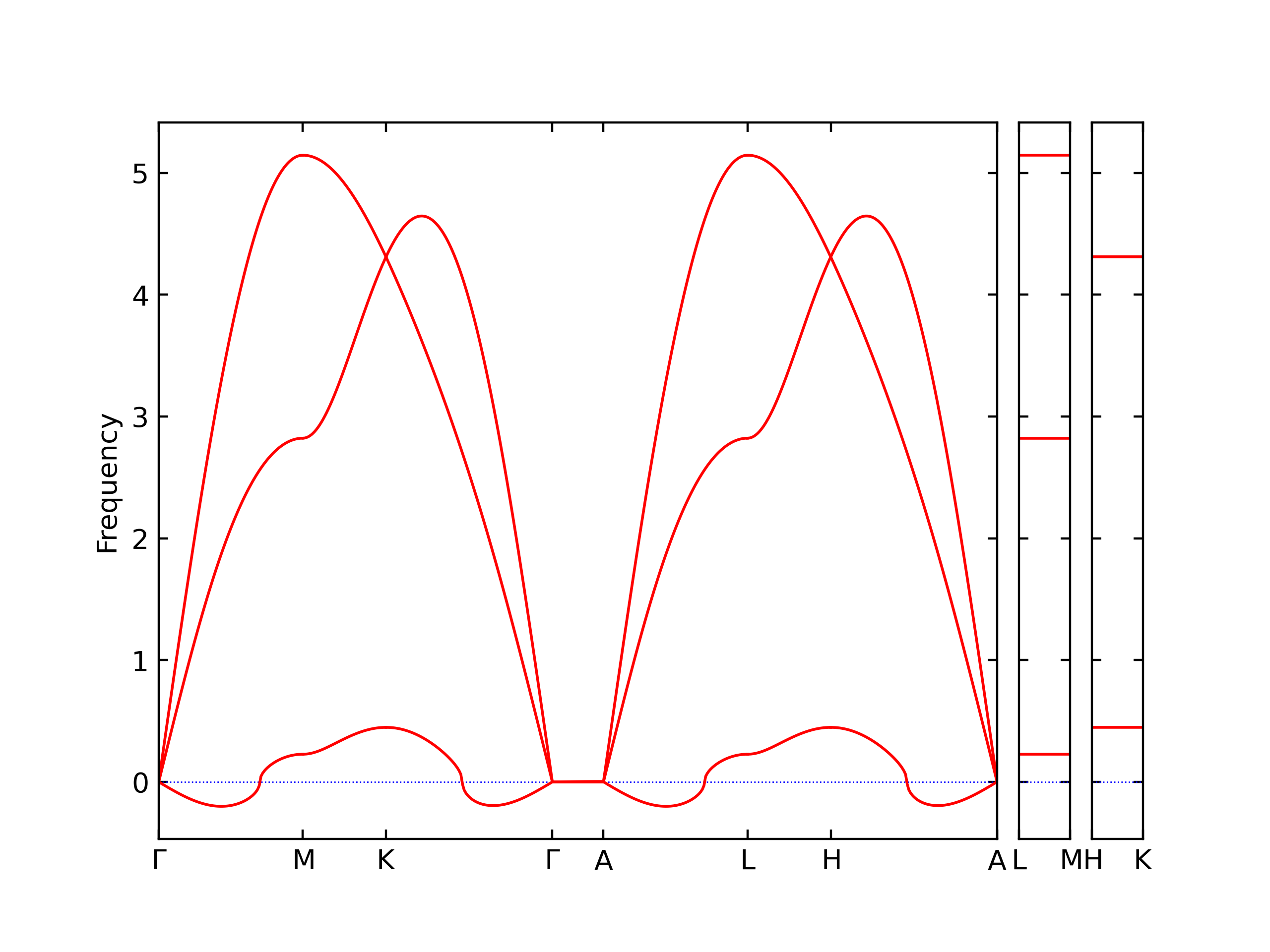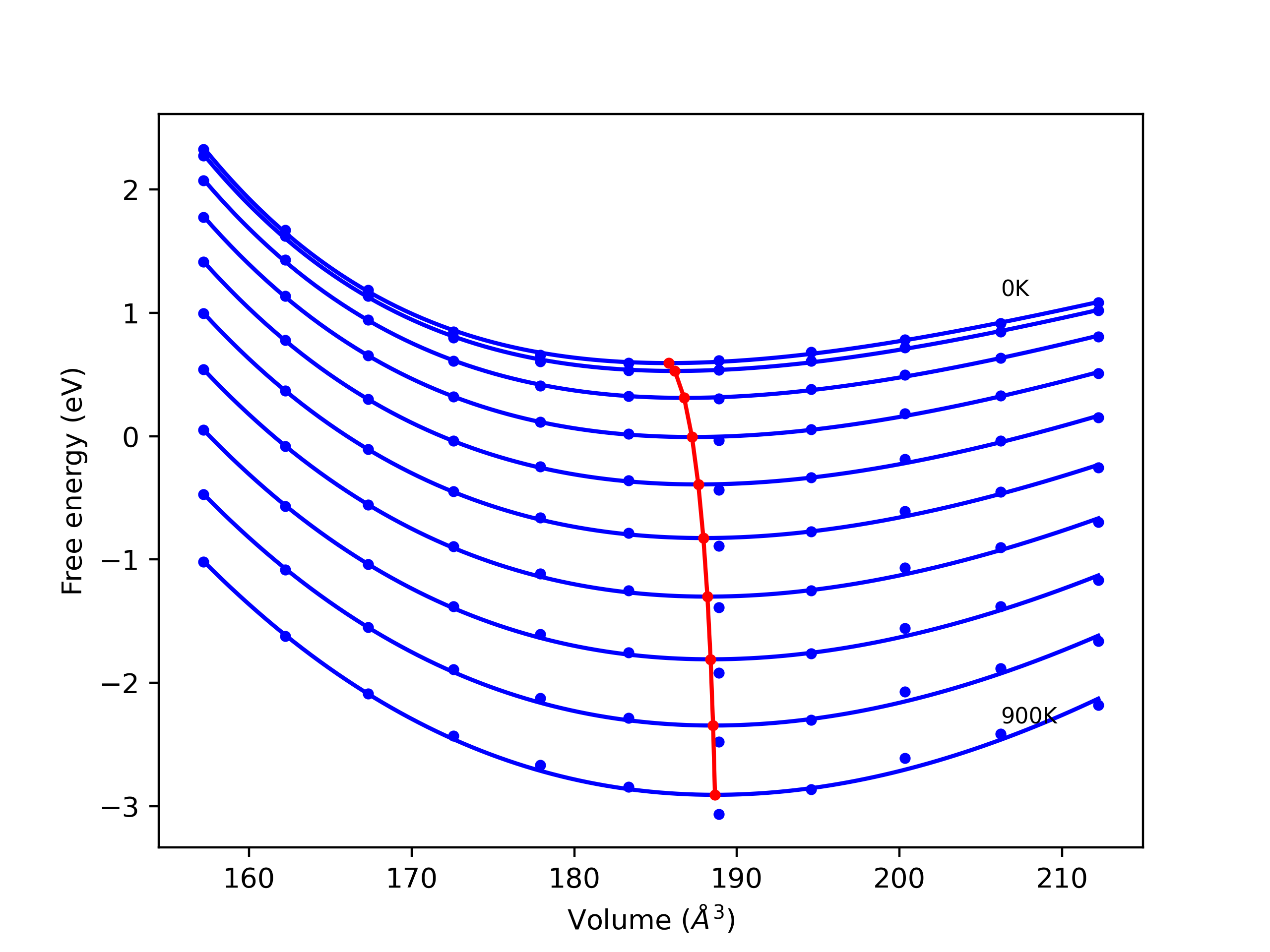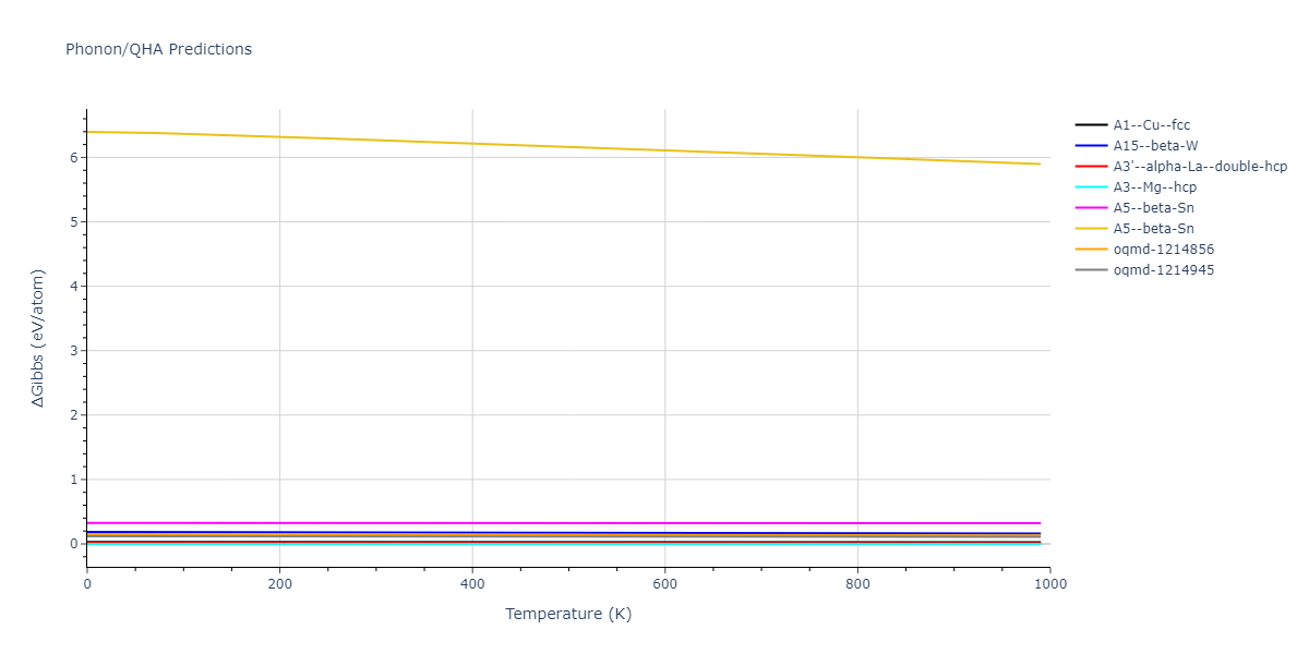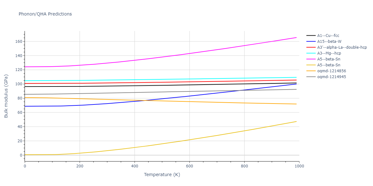 Phonon band structures and crystal properties estimated from quasi-harmonic approximation (QHA) calculations are displayed for select crystals. The calculations were performed using phonopy and LAMMPS. For the phonon calculations, 3x3 supercells of the potential-specific relaxed crystals were used. The QHA calculations were based on 11 strain states ranging from -0.05 to 0.05.