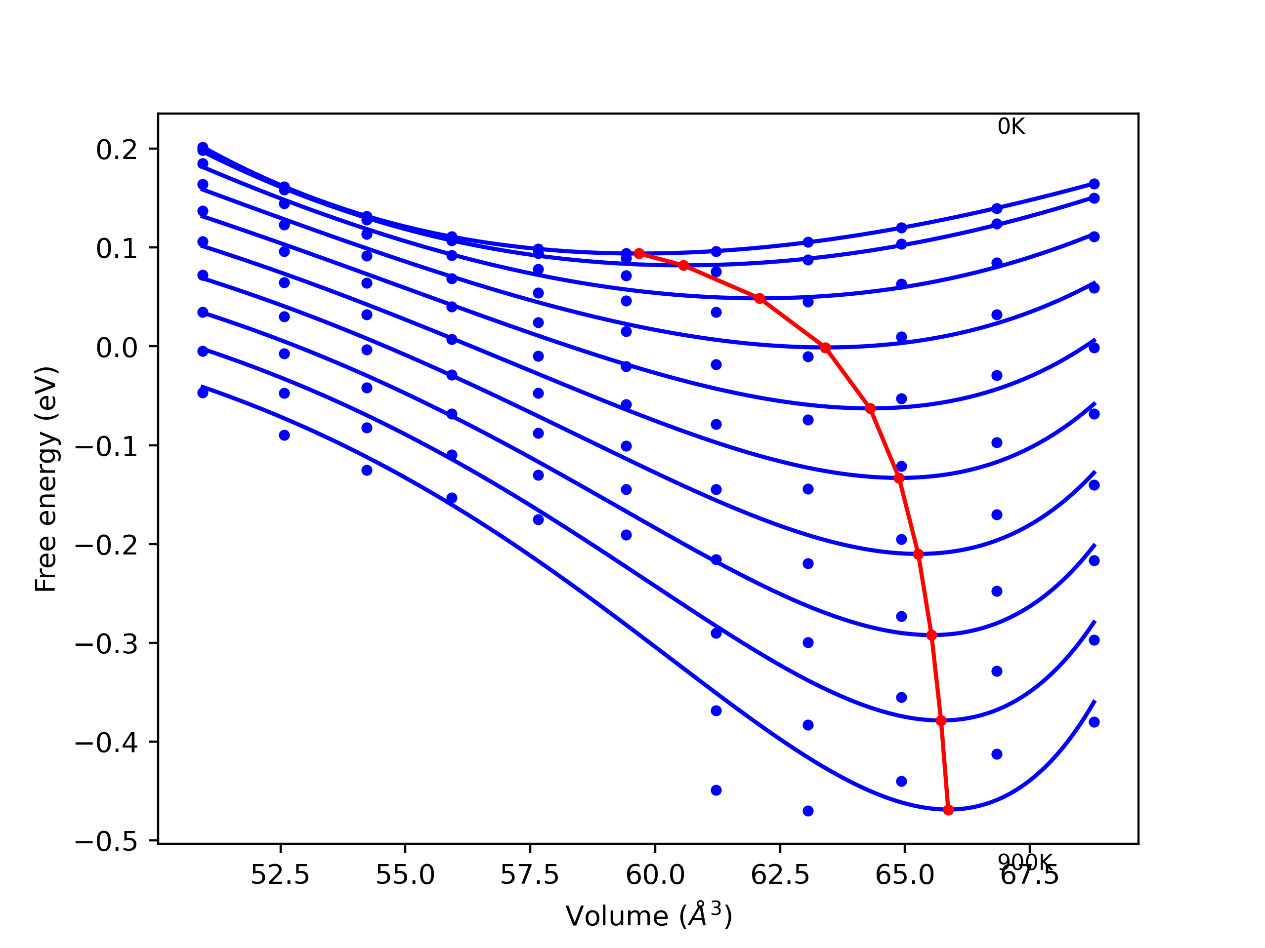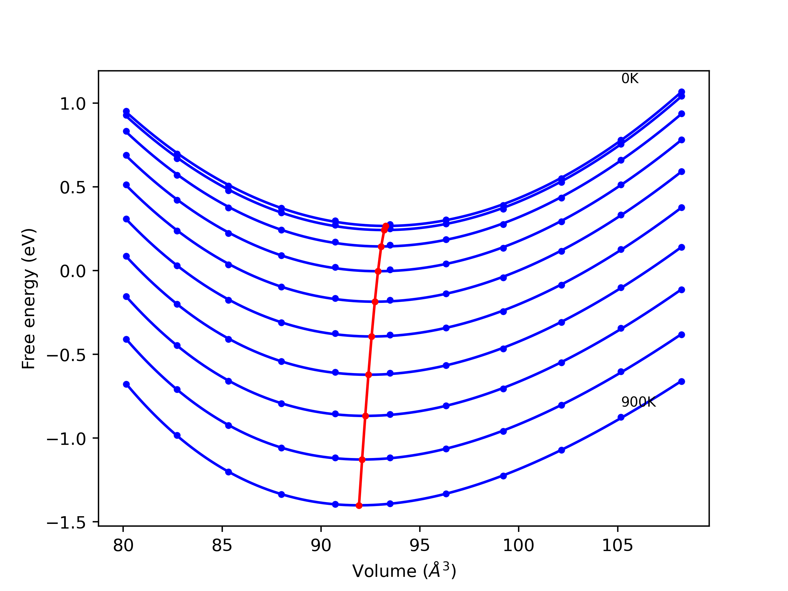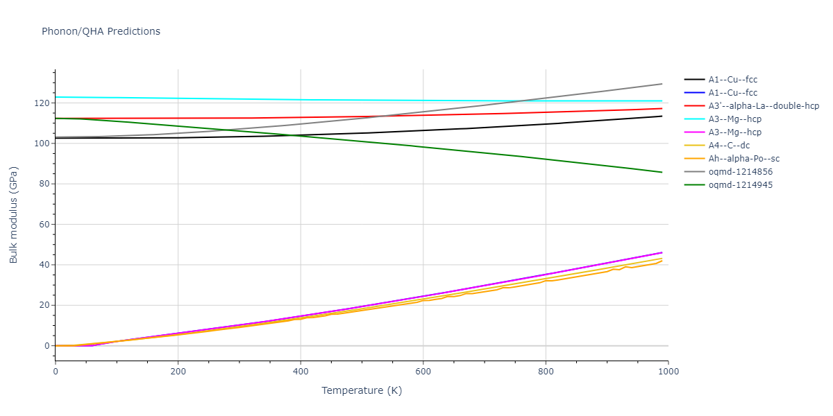 Phonon band structures and crystal properties estimated from quasi-harmonic approximation (QHA) calculations are displayed for select crystals. The calculations were performed using phonopy and LAMMPS. For the phonon calculations, 3x3 supercells of the potential-specific relaxed crystals were used. The QHA calculations were based on 11 strain states ranging from -0.05 to 0.05.