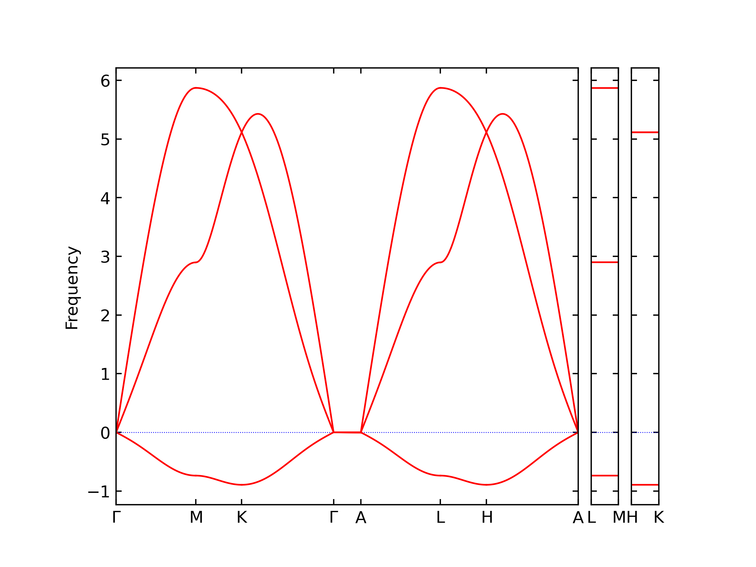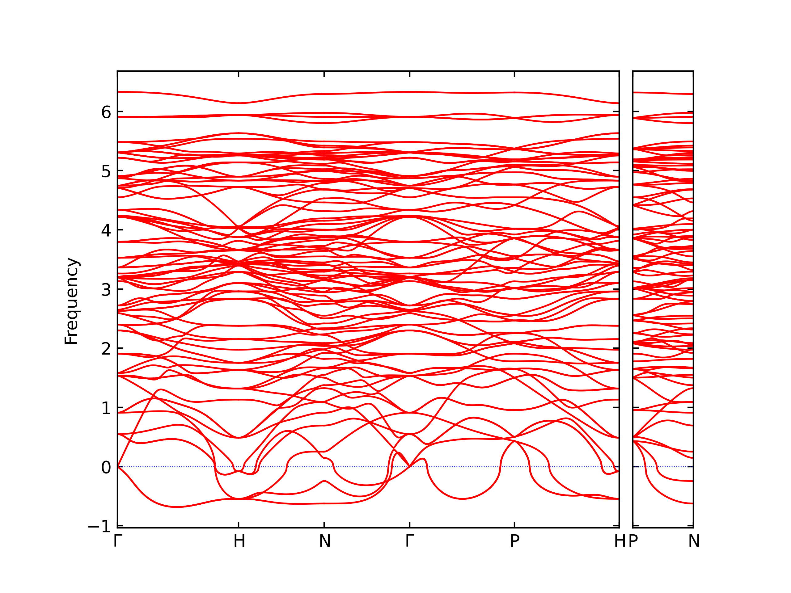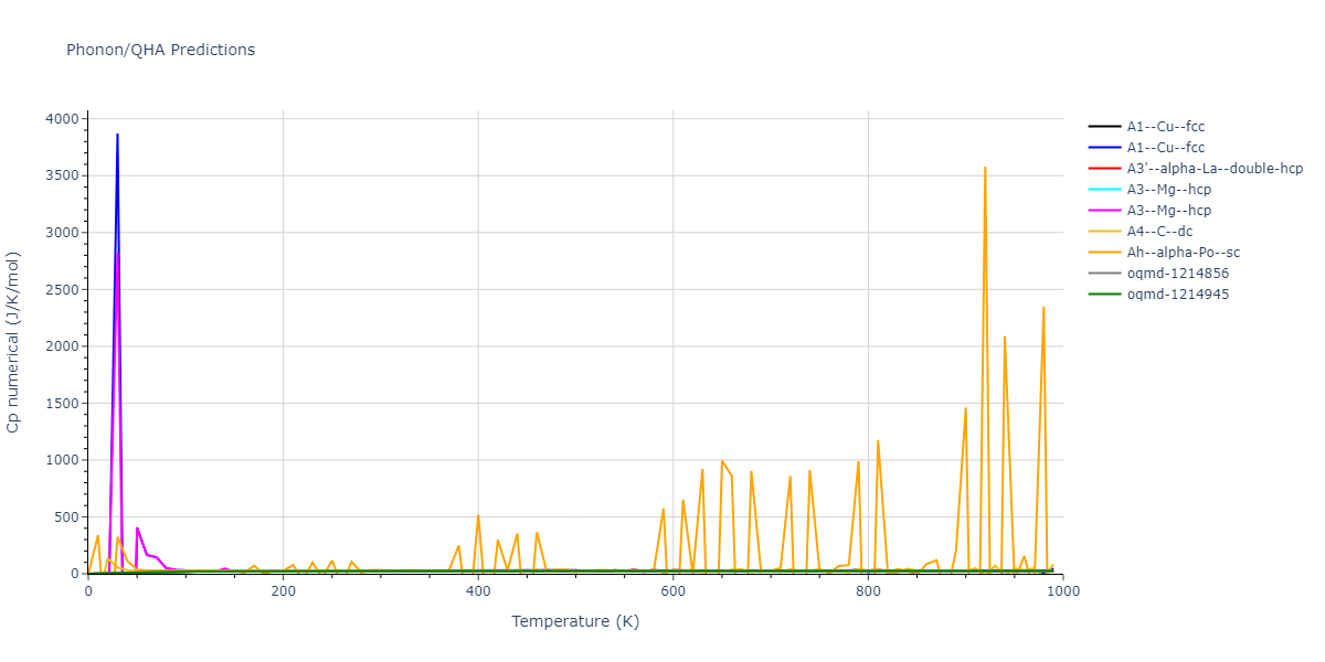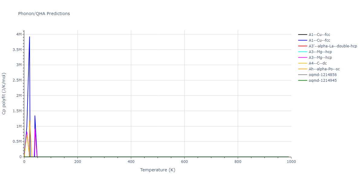 Phonon band structures and crystal properties estimated from quasi-harmonic approximation (QHA) calculations are displayed for select crystals. The calculations were performed using phonopy and LAMMPS. For the phonon calculations, 3x3 supercells of the potential-specific relaxed crystals were used. The QHA calculations were based on 11 strain states ranging from -0.05 to 0.05.