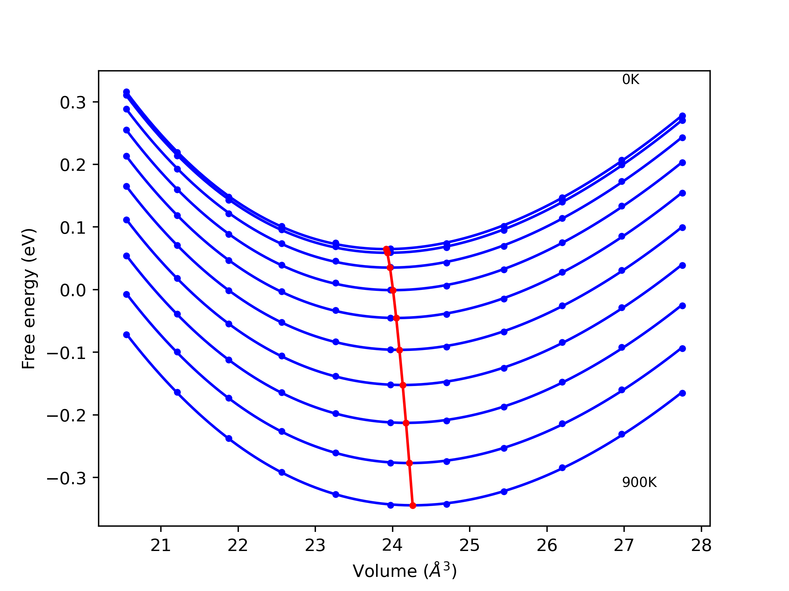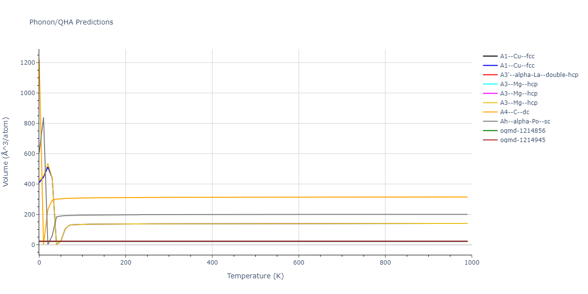 Phonon band structures and crystal properties estimated from quasi-harmonic approximation (QHA) calculations are displayed for select crystals. The calculations were performed using phonopy and LAMMPS. For the phonon calculations, 3x3 supercells of the potential-specific relaxed crystals were used. The QHA calculations were based on 11 strain states ranging from -0.05 to 0.05.