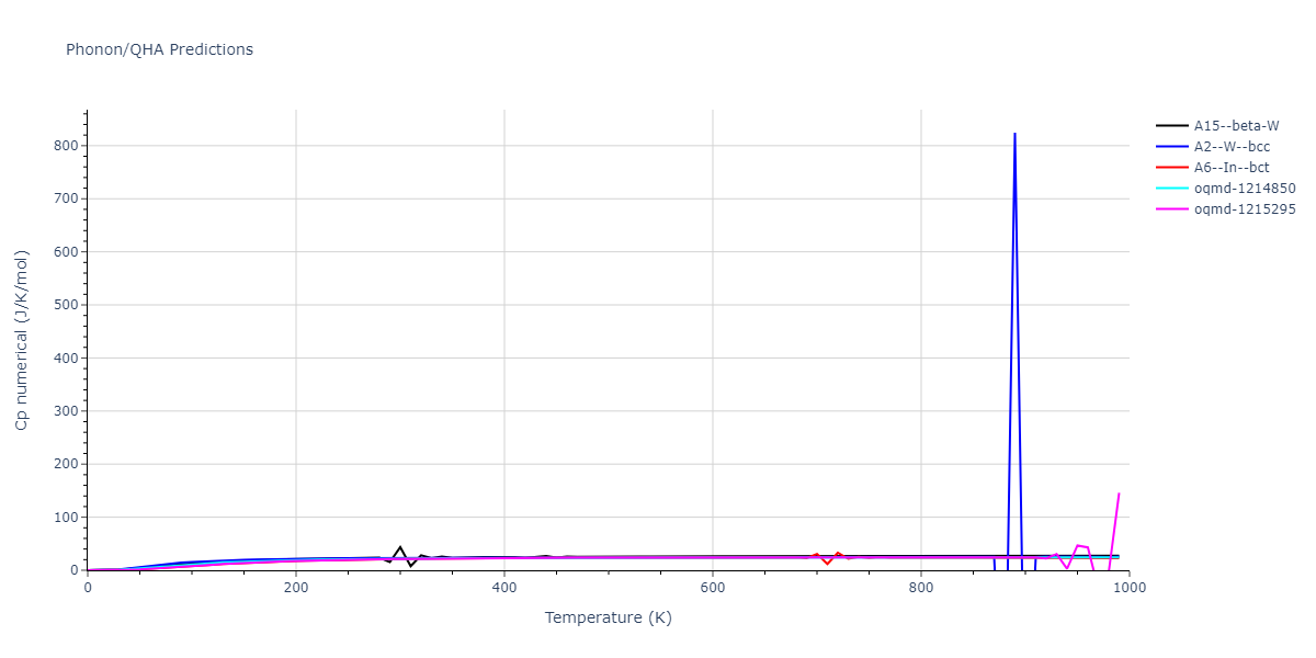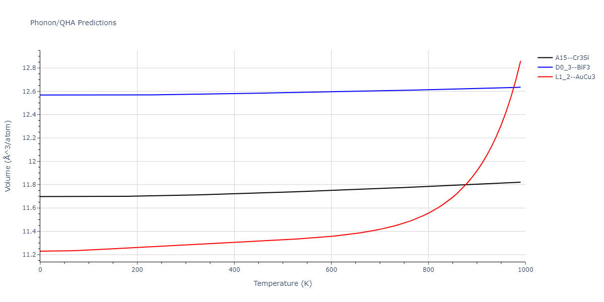 Plots of internal energy, Gibbs free energy, entropy, heat capacity and volume are shown here as a function of temperature for various crystal structures and liquid phases. The included crystal structures correspond to those in the Solid Structures vs. Temperature section, and the liquid phases to those in the Liquid Properties section. Internal energy and volume are taken from the associated structure relaxations mentioned in those previous sections. Constant pressure heat capacity is estimated using 3-point numerical derivatives of enthalpy versus temperature. Note that since all simulations done here are at 0 pressure, internal energy and enthalpy are equivalent.