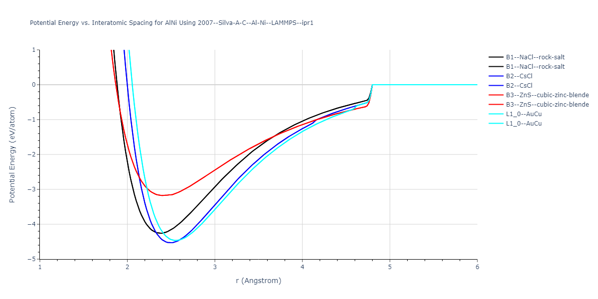 Plots of potential energy vs interatomic spacing, r, are shown below for a number of crystal structures. The structures are generated based on the ideal atomic positions and b/a and c/a lattice parameter ratios for a given crystal prototype. The size of the system is then uniformly scaled, and the energy calculated without relaxing the system. To obtain these plots, values of r are evaluated every 0.02 Å up to 6 Å.