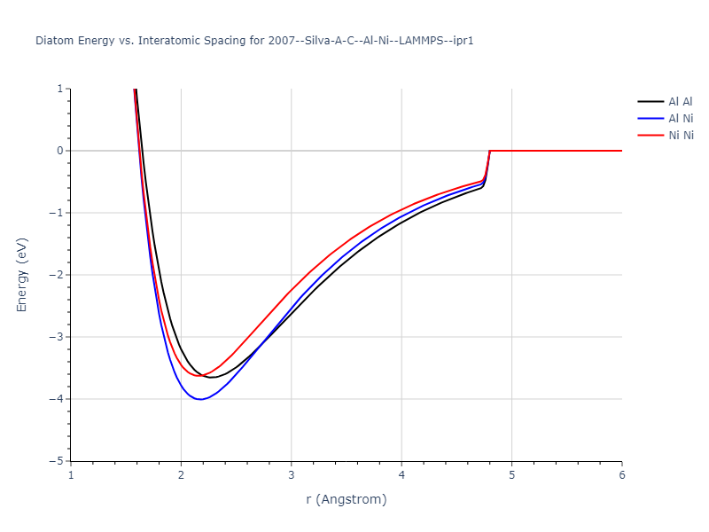 Plots of the potential energy vs interatomic spacing, r, are shown below for all diatom sets associated with the interatomic potential. This calculation provides insights into the functional form of the potential's two-body interactions. A system consisting of only two atoms is created, and the potential energy is evaluated for the atoms separated by 0.02 Å <= r <= 6.0> Å in intervals of 0.02 Å. Two plots are shown: one for the "standard" interaction distance range, and one for small values of r. The small r plot is useful for determining whether the potential is suitable for radiation studies.