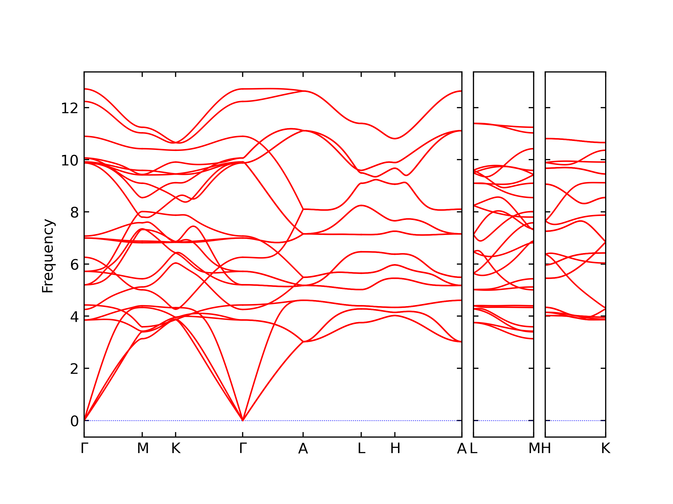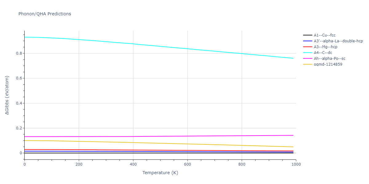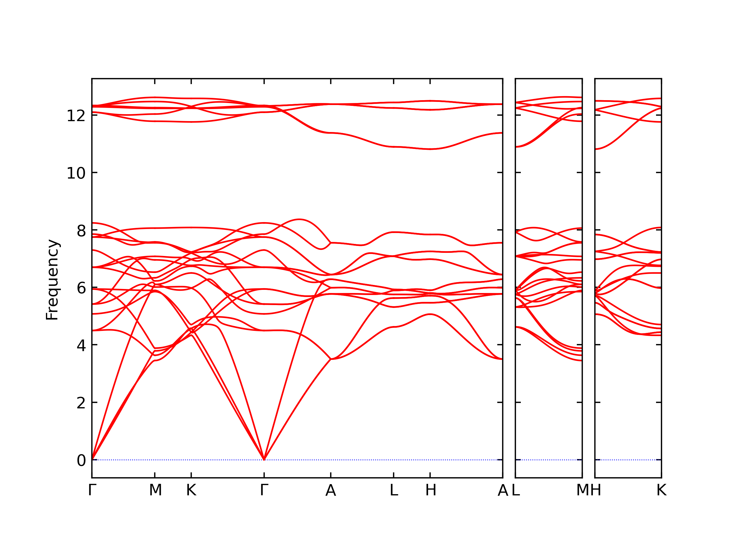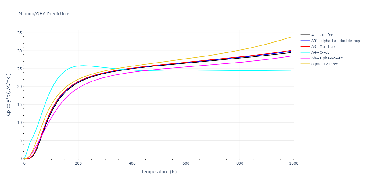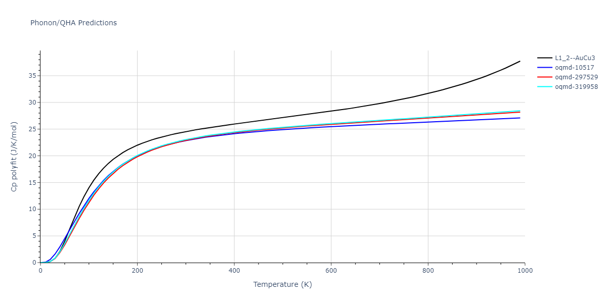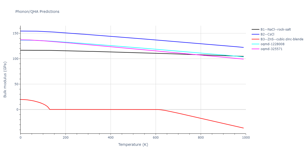 Phonon band structures and crystal properties estimated from quasi-harmonic approximation (QHA) calculations are displayed for select crystals. The calculations were performed using phonopy and LAMMPS. For the phonon calculations, 3x3 supercells of the potential-specific relaxed crystals were used. The QHA calculations were based on 11 strain states ranging from -0.05 to 0.05.