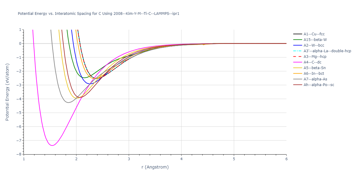 Plots of potential energy vs interatomic spacing, r, are shown below for a number of crystal structures. The structures are generated based on the ideal atomic positions and b/a and c/a lattice parameter ratios for a given crystal prototype. The size of the system is then uniformly scaled, and the energy calculated without relaxing the system. To obtain these plots, values of r are evaluated every 0.02 Å up to 6 Å.