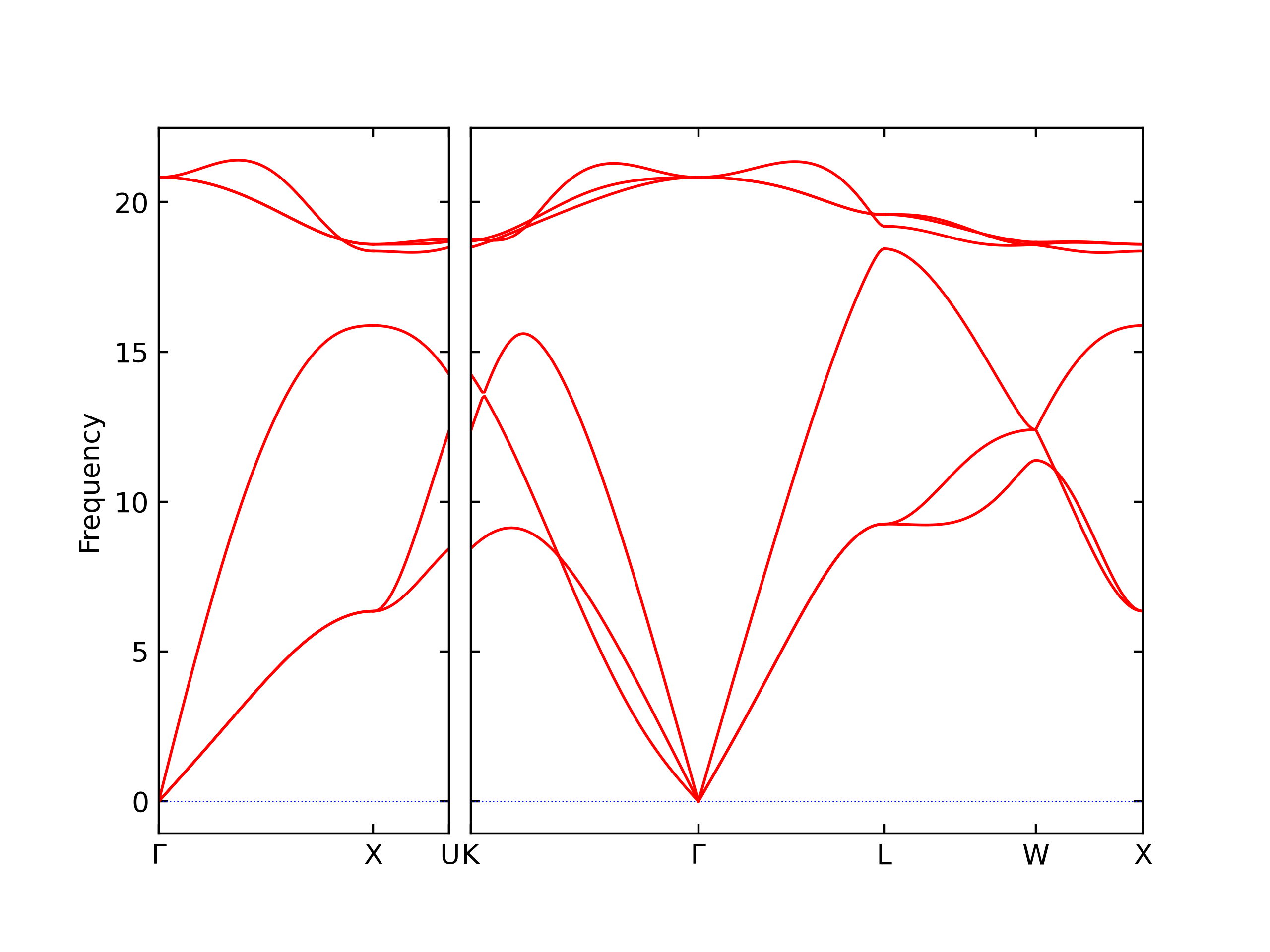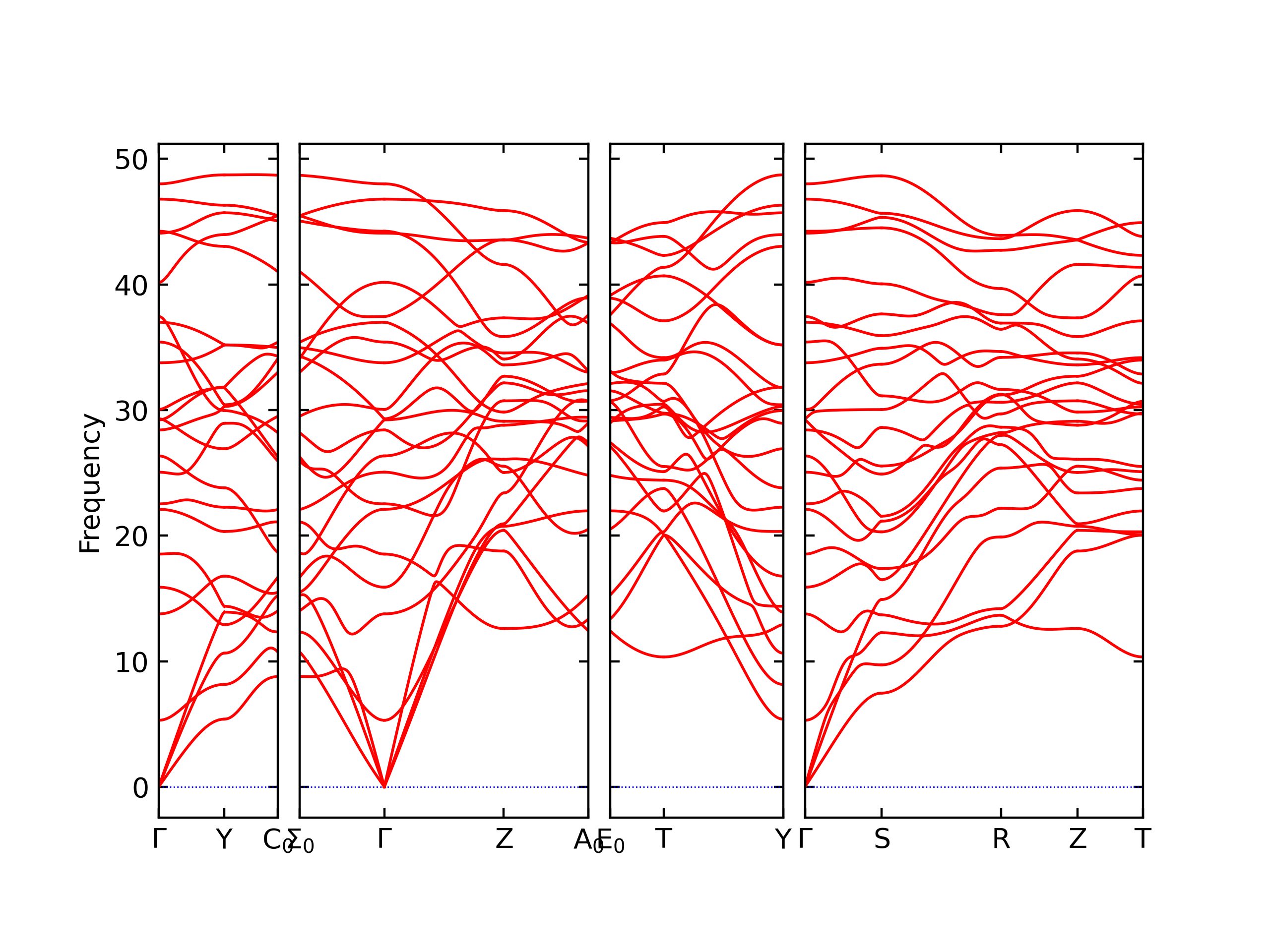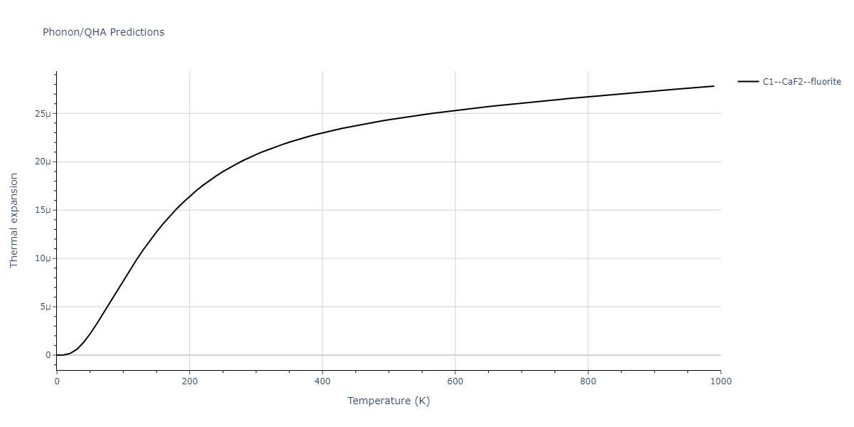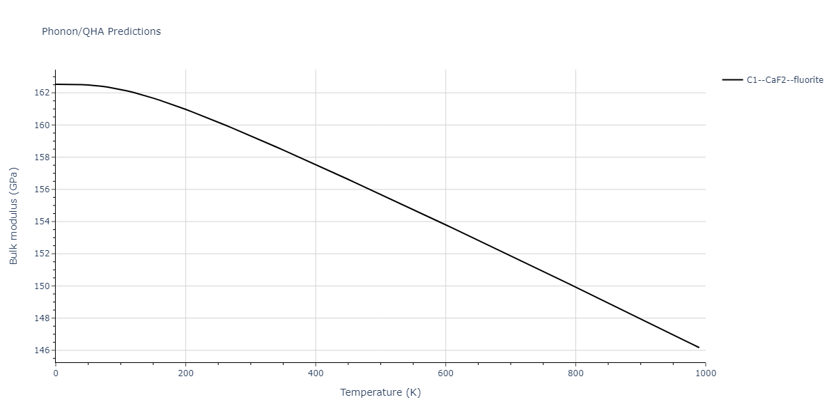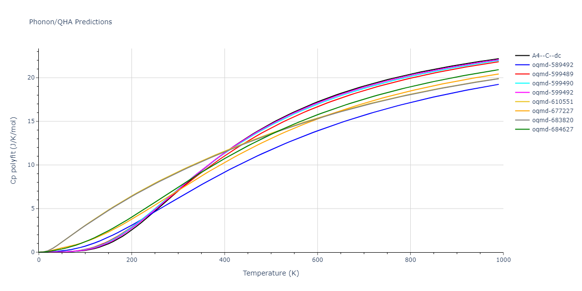 Plots of lattice and elastic constants are shown as a function of temperature. The 0K points were taken from the Crystal Structure Predictions and the Elastic Constants Predictions sections above for the unique crystal structures relaxed with the "dynamic" method. Starting from the 0 K relaxed crystal unit cells, supercell systems are created by replicating all three dimensions by the same multiplier to achieve at least 4000 atoms. The systems are then relaxed at 50 K and zero pressure using 1 million NPT steps. Lattice constants are estimated by averaging the measured box dimensions. Temperatures are iteratively increased by 50 K, with each subsequent relaxation calculation starting from the final atomic configuration at the previous temperature and relaxing for another 1 million steps.