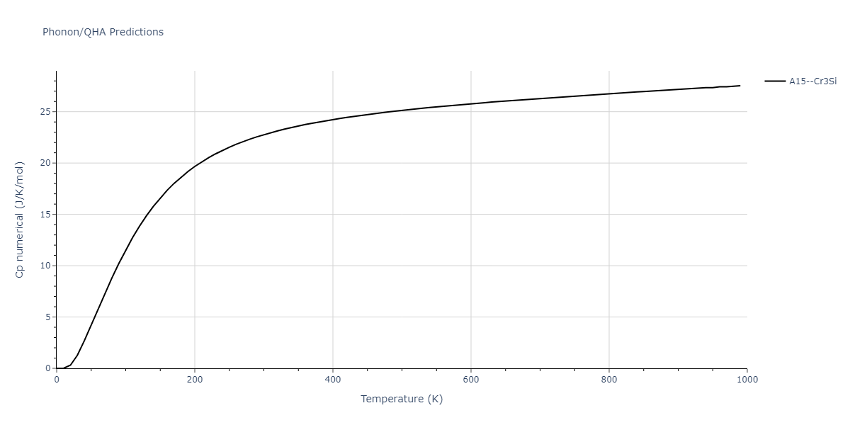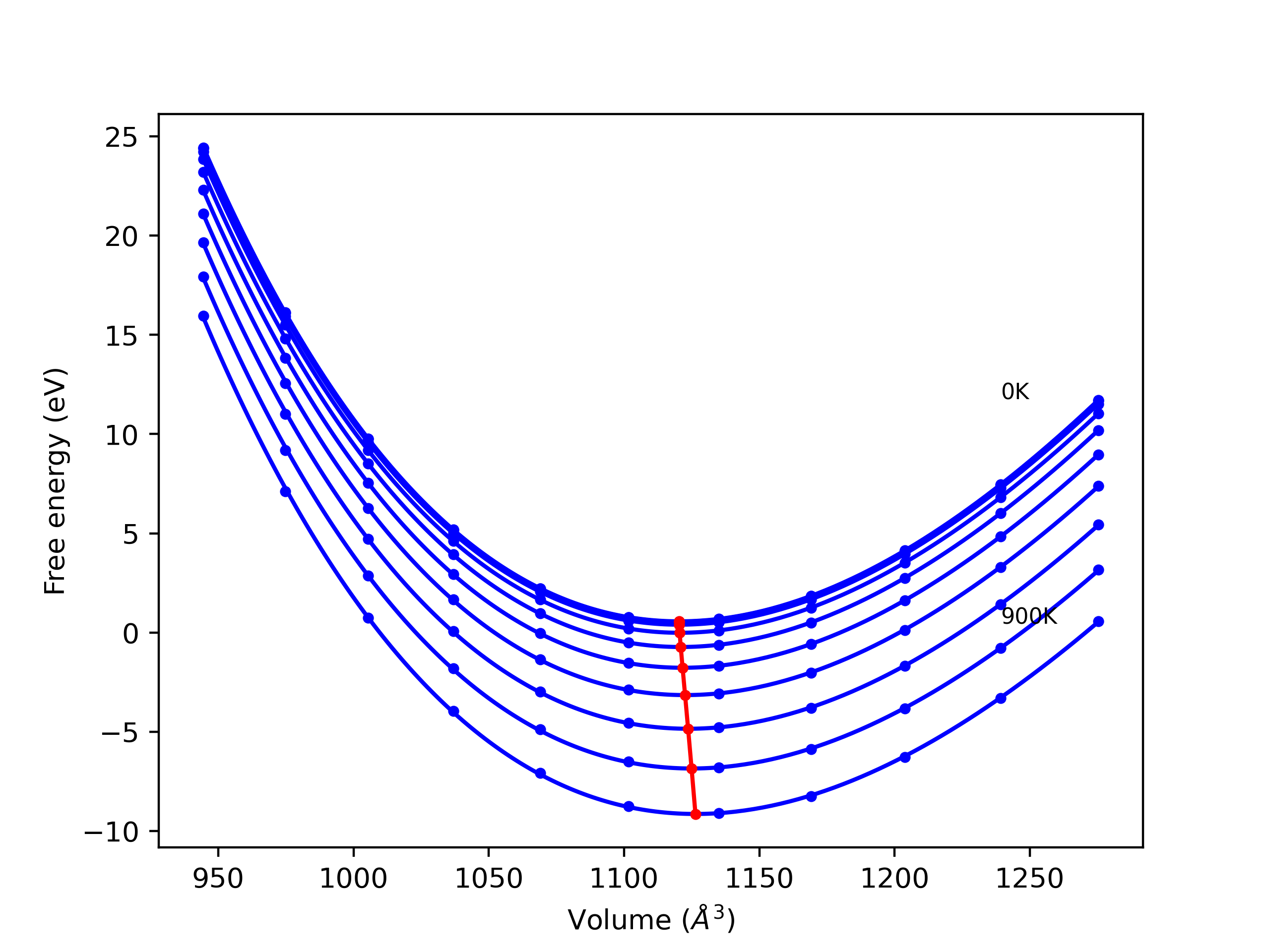 Plots of internal energy, Gibbs free energy, entropy, heat capacity and volume are shown here as a function of temperature for various crystal structures and liquid phases. The included crystal structures correspond to those in the Solid Structures vs. Temperature section, and the liquid phases to those in the Liquid Properties section. Internal energy and volume are taken from the associated structure relaxations mentioned in those previous sections. Constant pressure heat capacity is estimated using 3-point numerical derivatives of enthalpy versus temperature. Note that since all simulations done here are at 0 pressure, internal energy and enthalpy are equivalent.