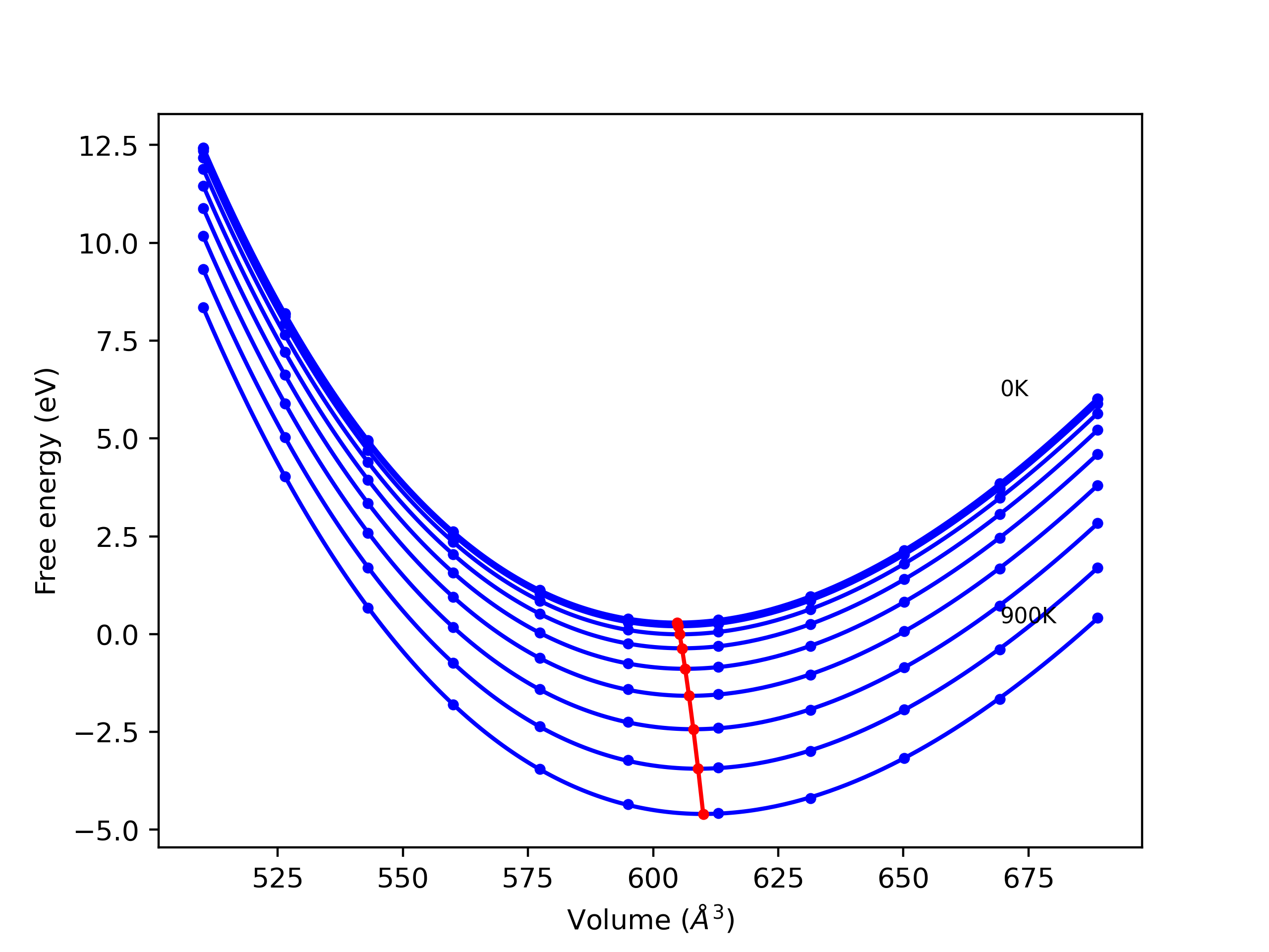 The Gibbs energies of the phases are estimated using thermodynamic integration between the interatomic potential in question and a simpler model with known Gibbs free energy values. For solids, the reference model is an Einstein solid, while for liquids it is the Uhlenbeck-Ford potential. Besides a short run at the start of the solid calculations to estimate Einstein model spring constants, the two calculations proceed similarly. Starting with the final relaxation configurations, the systems are stabilized for 25,000 steps. Then, over the next 50,000 steps the potential is swapped out for the reference potential. The system is then stabilized for another 25,000 steps with the reference model before a reverse swap of 50,000 steps is performed. The simulation ends with one final 25,000 step stabilization period. From the simulation, the irreversible work of transformation is estimated and used to compute the absolute Gibbs free energy of the target phase and potential relative to the reference potential. Entropy is estimated as the difference in enthalpy and Gibbs free energy and divided by temperature.