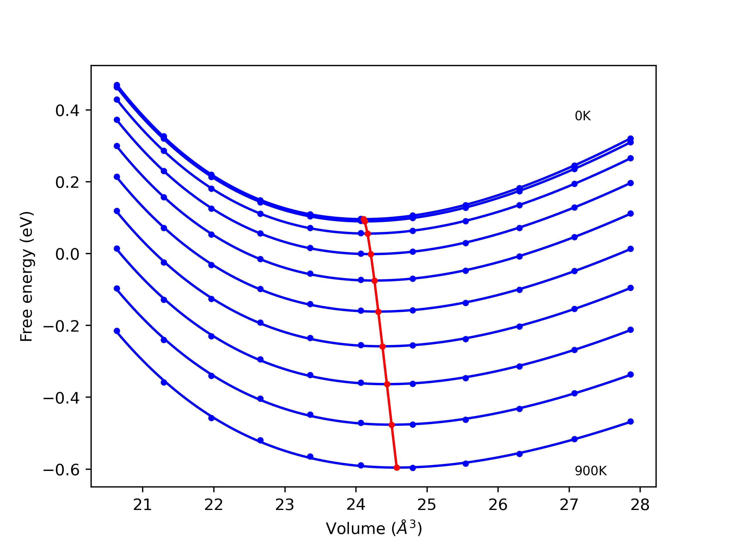 The Gibbs energies of the phases are estimated using thermodynamic integration between the interatomic potential in question and a simpler model with known Gibbs free energy values. For solids, the reference model is an Einstein solid, while for liquids it is the Uhlenbeck-Ford potential. Besides a short run at the start of the solid calculations to estimate Einstein model spring constants, the two calculations proceed similarly. Starting with the final relaxation configurations, the systems are stabilized for 25,000 steps. Then, over the next 50,000 steps the potential is swapped out for the reference potential. The system is then stabilized for another 25,000 steps with the reference model before a reverse swap of 50,000 steps is performed. The simulation ends with one final 25,000 step stabilization period. From the simulation, the irreversible work of transformation is estimated and used to compute the absolute Gibbs free energy of the target phase and potential relative to the reference potential. Entropy is estimated as the difference in enthalpy and Gibbs free energy and divided by temperature.
