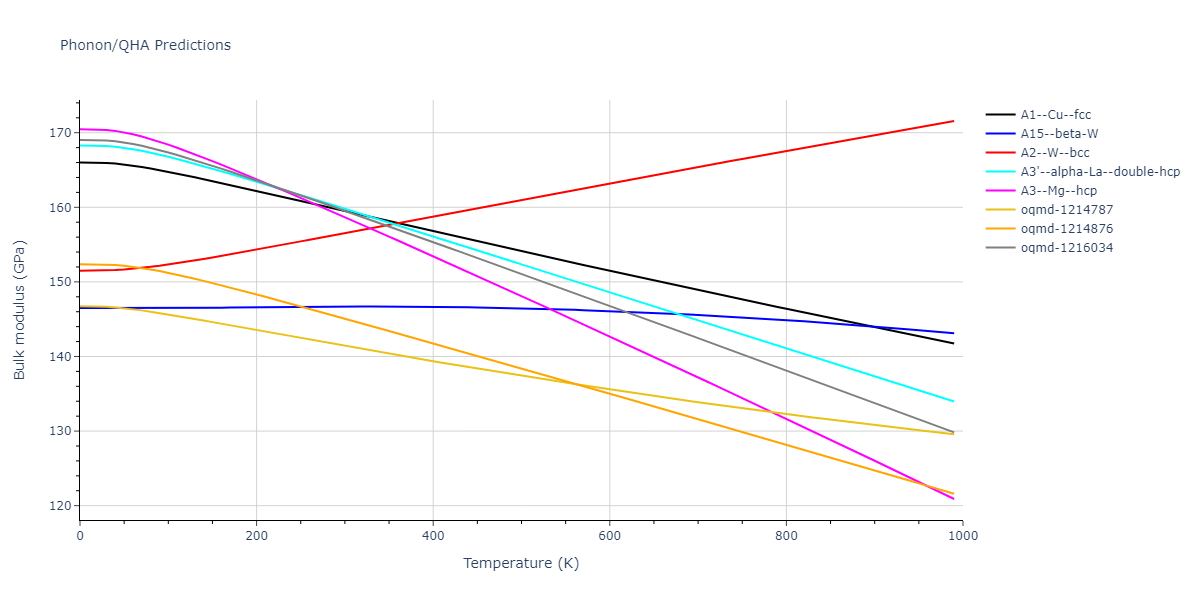 Phonon band structures and crystal properties estimated from quasi-harmonic approximation (QHA) calculations are displayed for select crystals. The calculations were performed using phonopy and LAMMPS. For the phonon calculations, 3x3 supercells of the potential-specific relaxed crystals were used. The QHA calculations were based on 11 strain states ranging from -0.05 to 0.05.