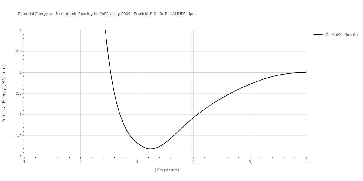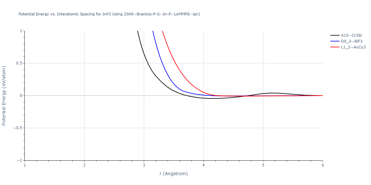 Plots of potential energy vs interatomic spacing, r, are shown below for a number of crystal structures. The structures are generated based on the ideal atomic positions and b/a and c/a lattice parameter ratios for a given crystal prototype. The size of the system is then uniformly scaled, and the energy calculated without relaxing the system. To obtain these plots, values of r are evaluated every 0.02 Å up to 6 Å.