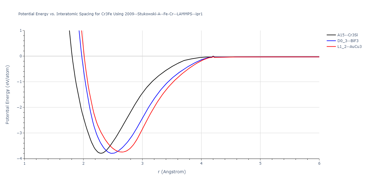 Plots of potential energy vs interatomic spacing, r, are shown below for a number of crystal structures. The structures are generated based on the ideal atomic positions and b/a and c/a lattice parameter ratios for a given crystal prototype. The size of the system is then uniformly scaled, and the energy calculated without relaxing the system. To obtain these plots, values of r are evaluated every 0.02 Å up to 6 Å.