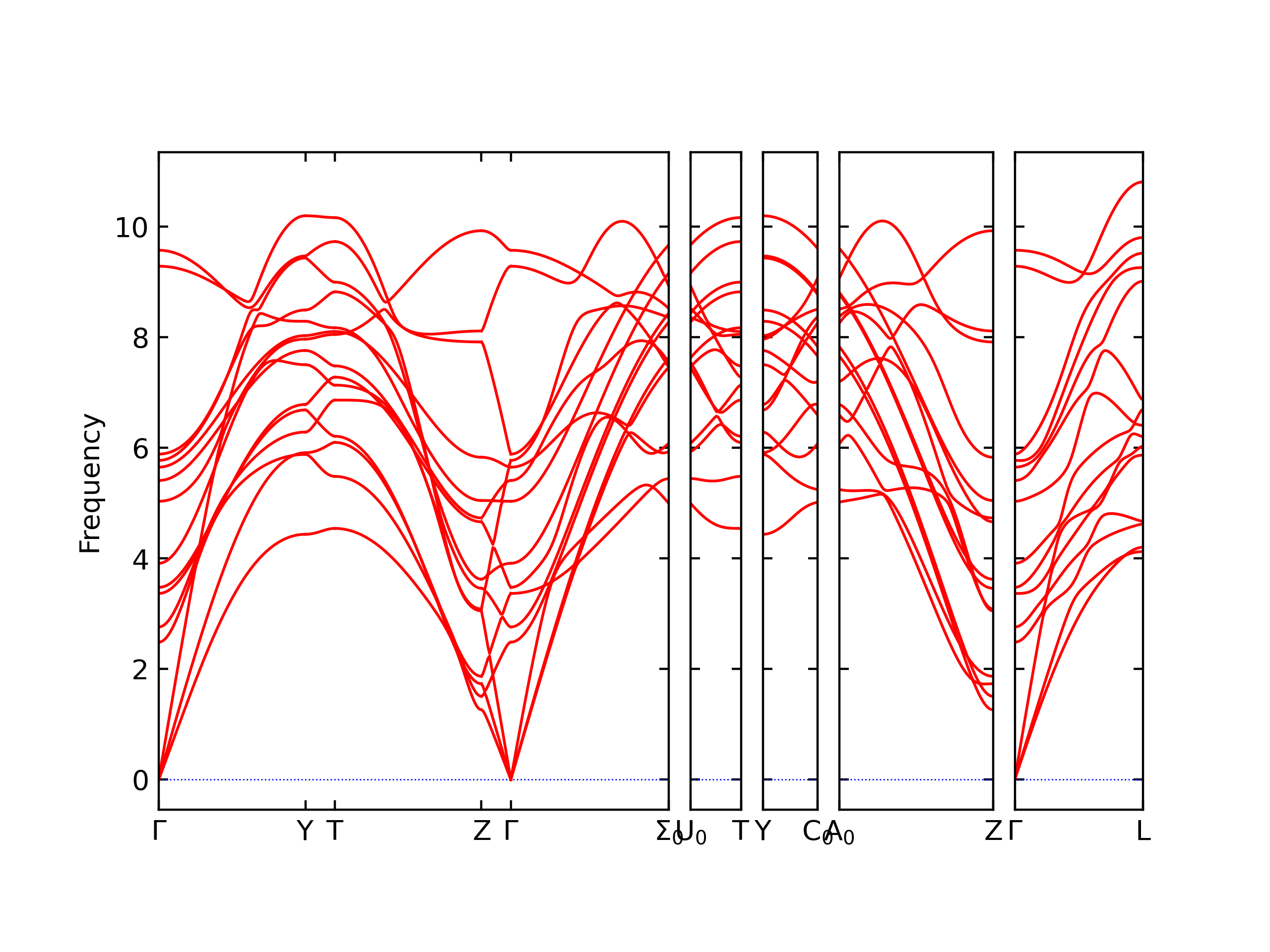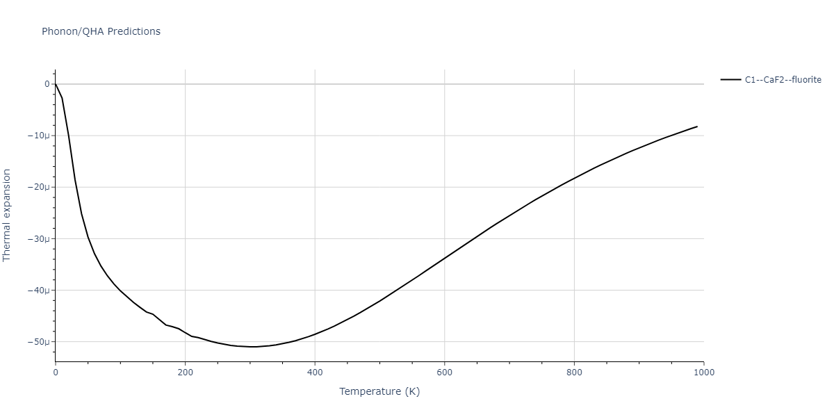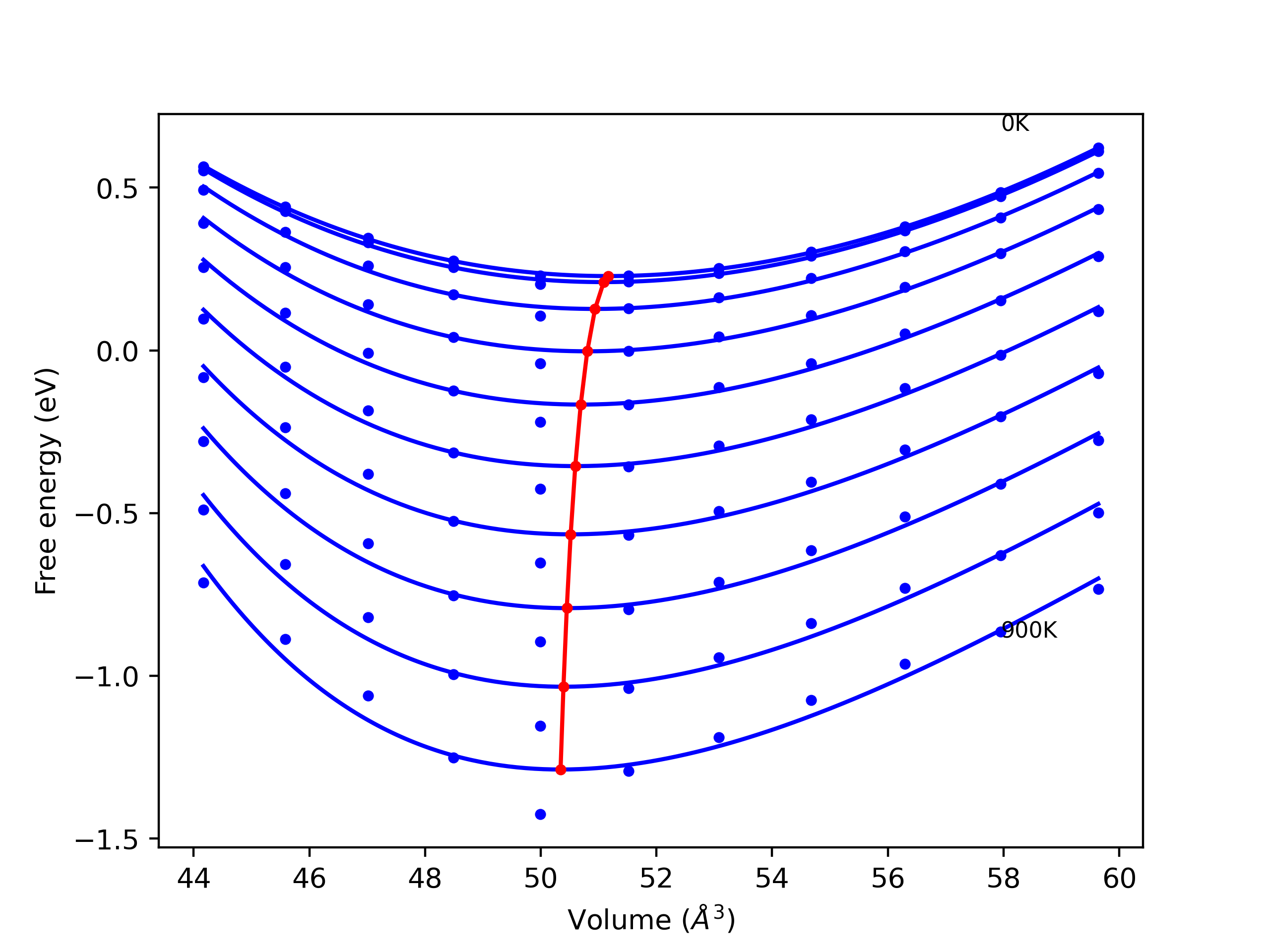 Phonon band structures and crystal properties estimated from quasi-harmonic approximation (QHA) calculations are displayed for select crystals. The calculations were performed using phonopy and LAMMPS. For the phonon calculations, 3x3 supercells of the potential-specific relaxed crystals were used. The QHA calculations were based on 11 strain states ranging from -0.05 to 0.05.
