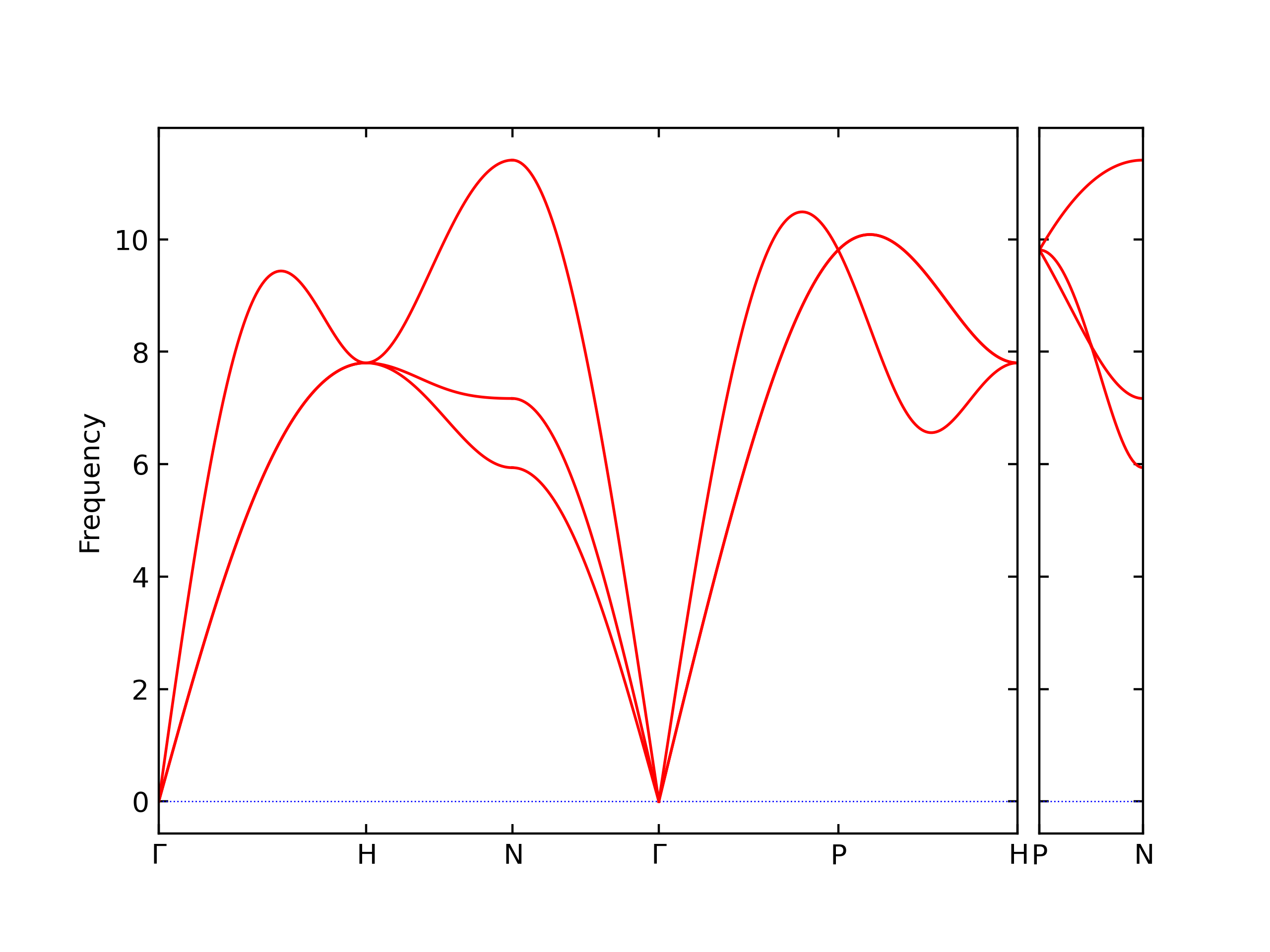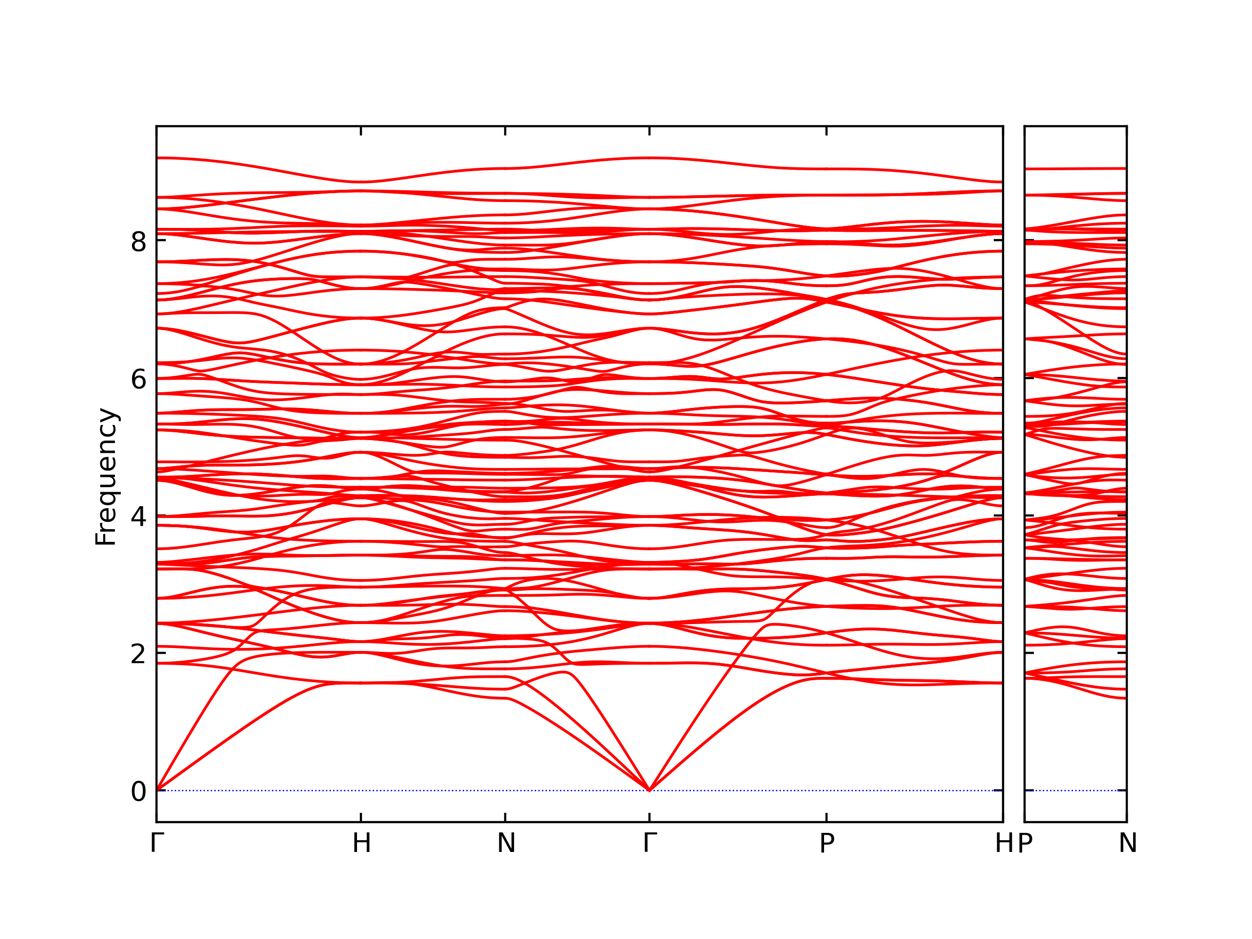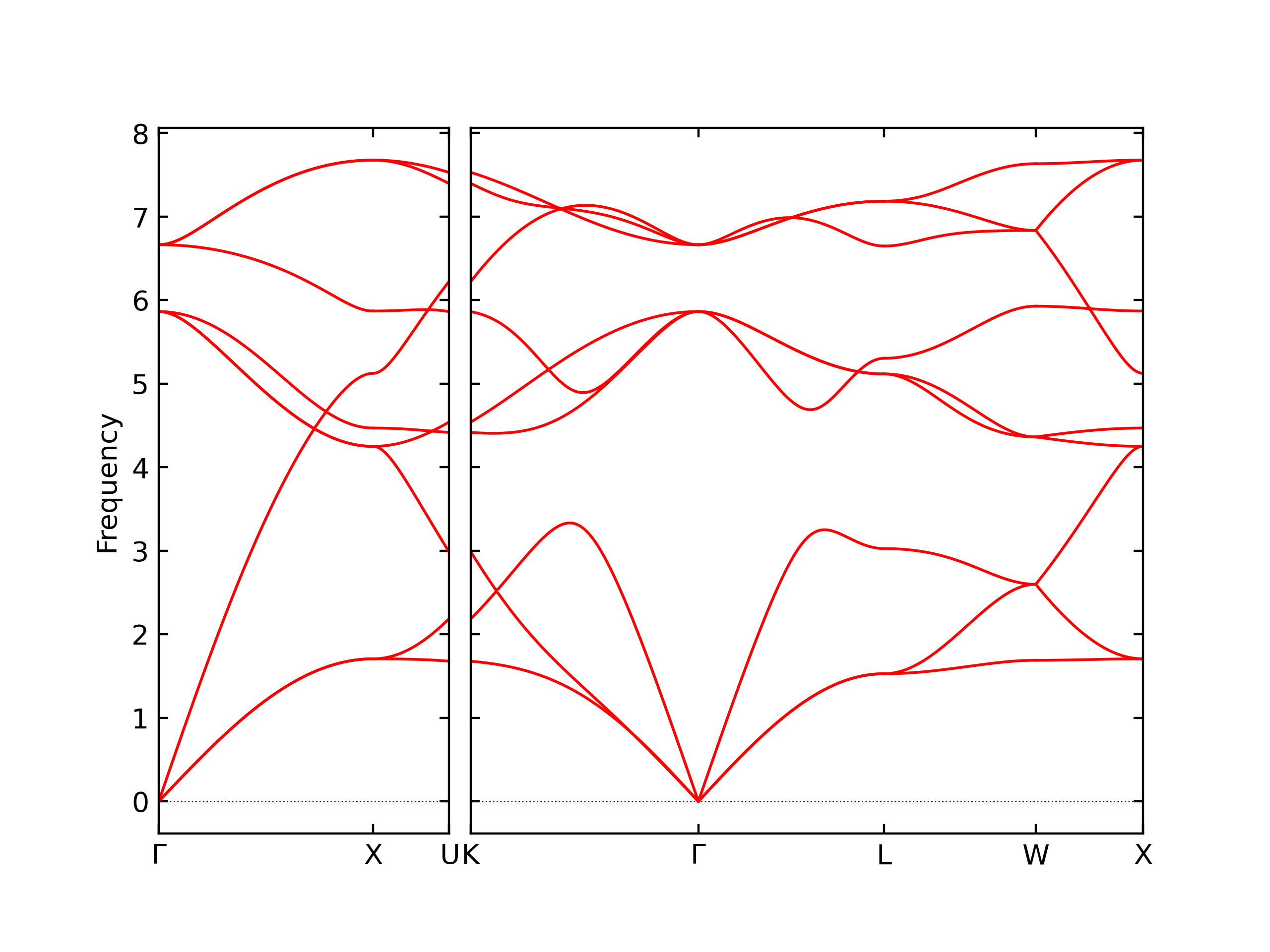Phonon band structures and crystal properties estimated from quasi-harmonic approximation (QHA) calculations are displayed for select crystals. The calculations were performed using phonopy and LAMMPS. For the phonon calculations, 3x3 supercells of the potential-specific relaxed crystals were used. The QHA calculations were based on 11 strain states ranging from -0.05 to 0.05.