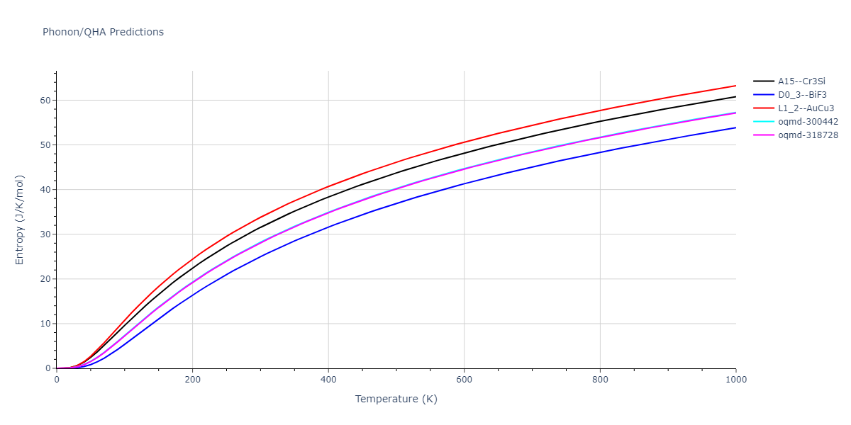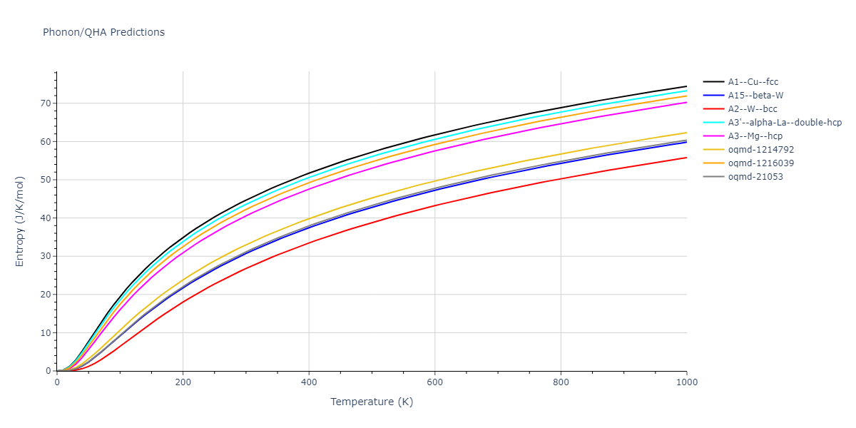 The Gibbs energies of the phases are estimated using thermodynamic integration between the interatomic potential in question and a simpler model with known Gibbs free energy values. For solids, the reference model is an Einstein solid, while for liquids it is the Uhlenbeck-Ford potential. Besides a short run at the start of the solid calculations to estimate Einstein model spring constants, the two calculations proceed similarly. Starting with the final relaxation configurations, the systems are stabilized for 25,000 steps. Then, over the next 50,000 steps the potential is swapped out for the reference potential. The system is then stabilized for another 25,000 steps with the reference model before a reverse swap of 50,000 steps is performed. The simulation ends with one final 25,000 step stabilization period. From the simulation, the irreversible work of transformation is estimated and used to compute the absolute Gibbs free energy of the target phase and potential relative to the reference potential. Entropy is estimated as the difference in enthalpy and Gibbs free energy and divided by temperature.