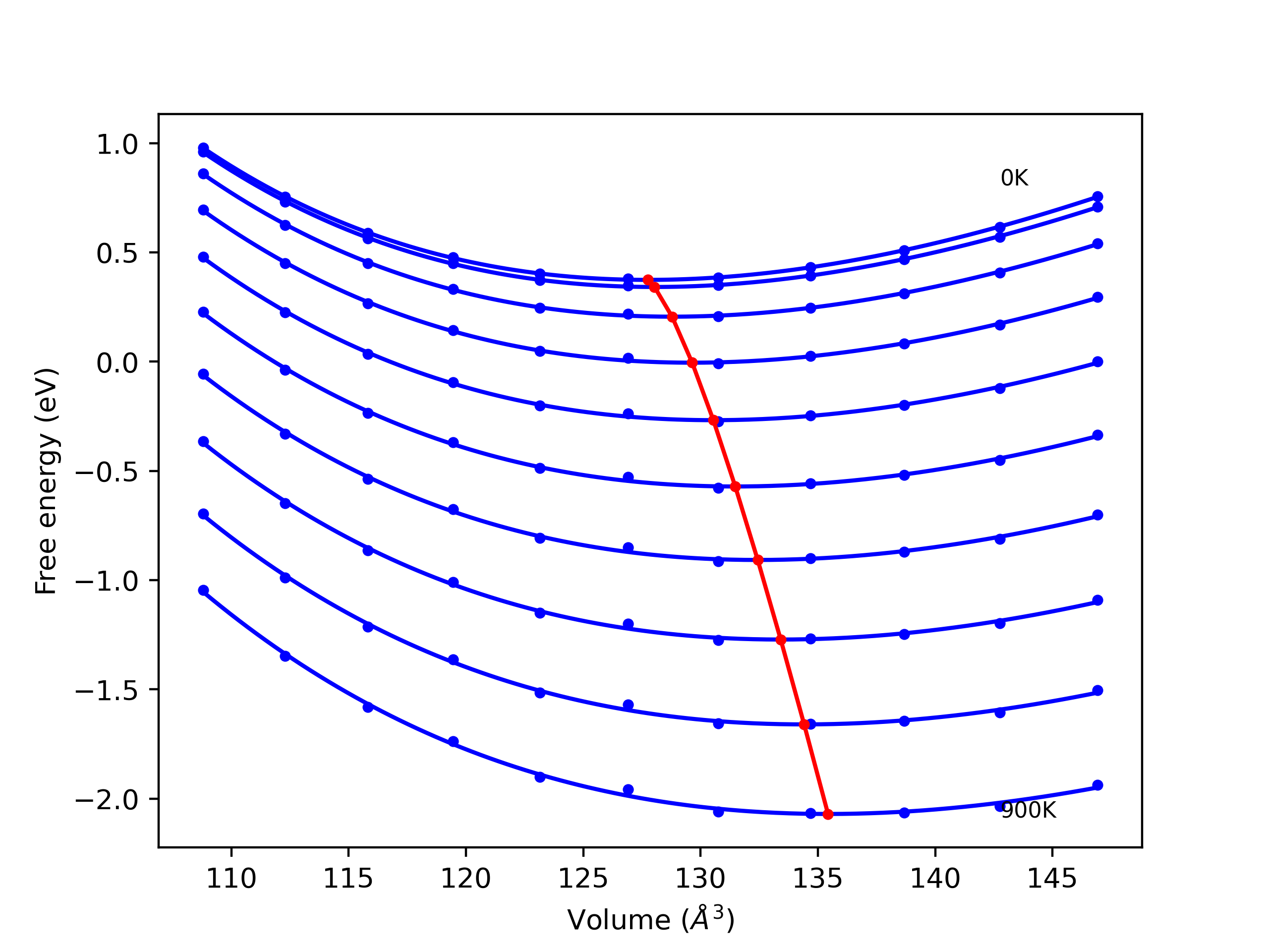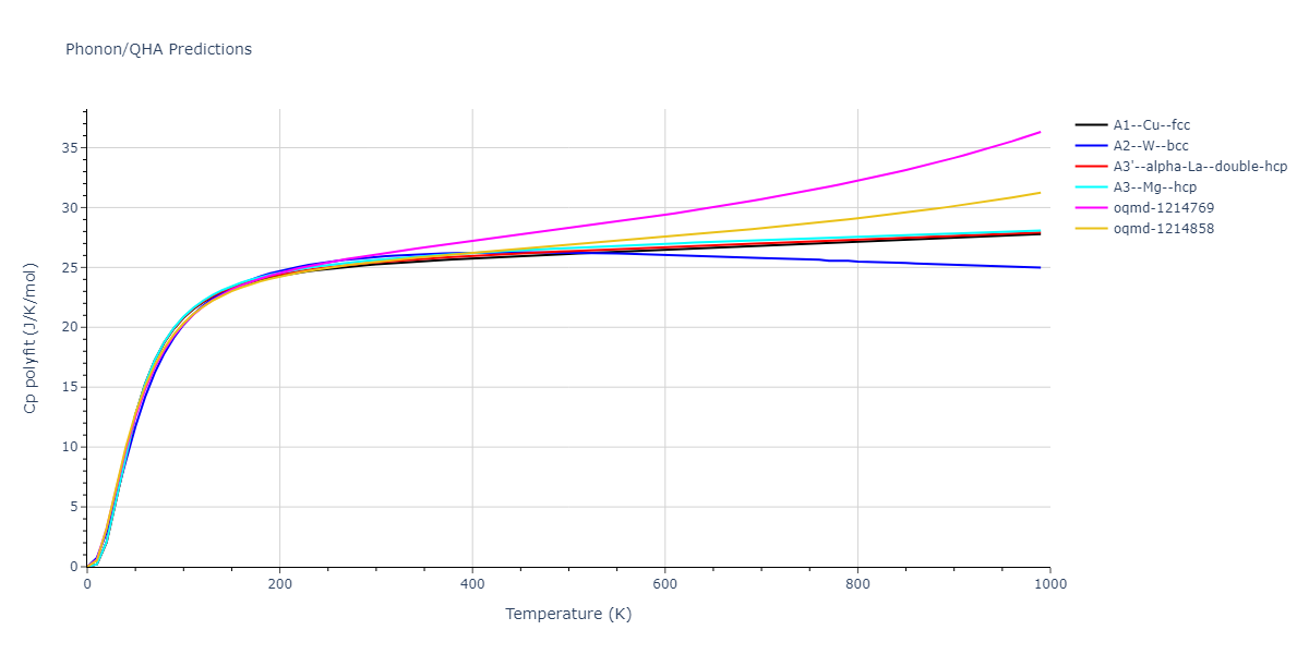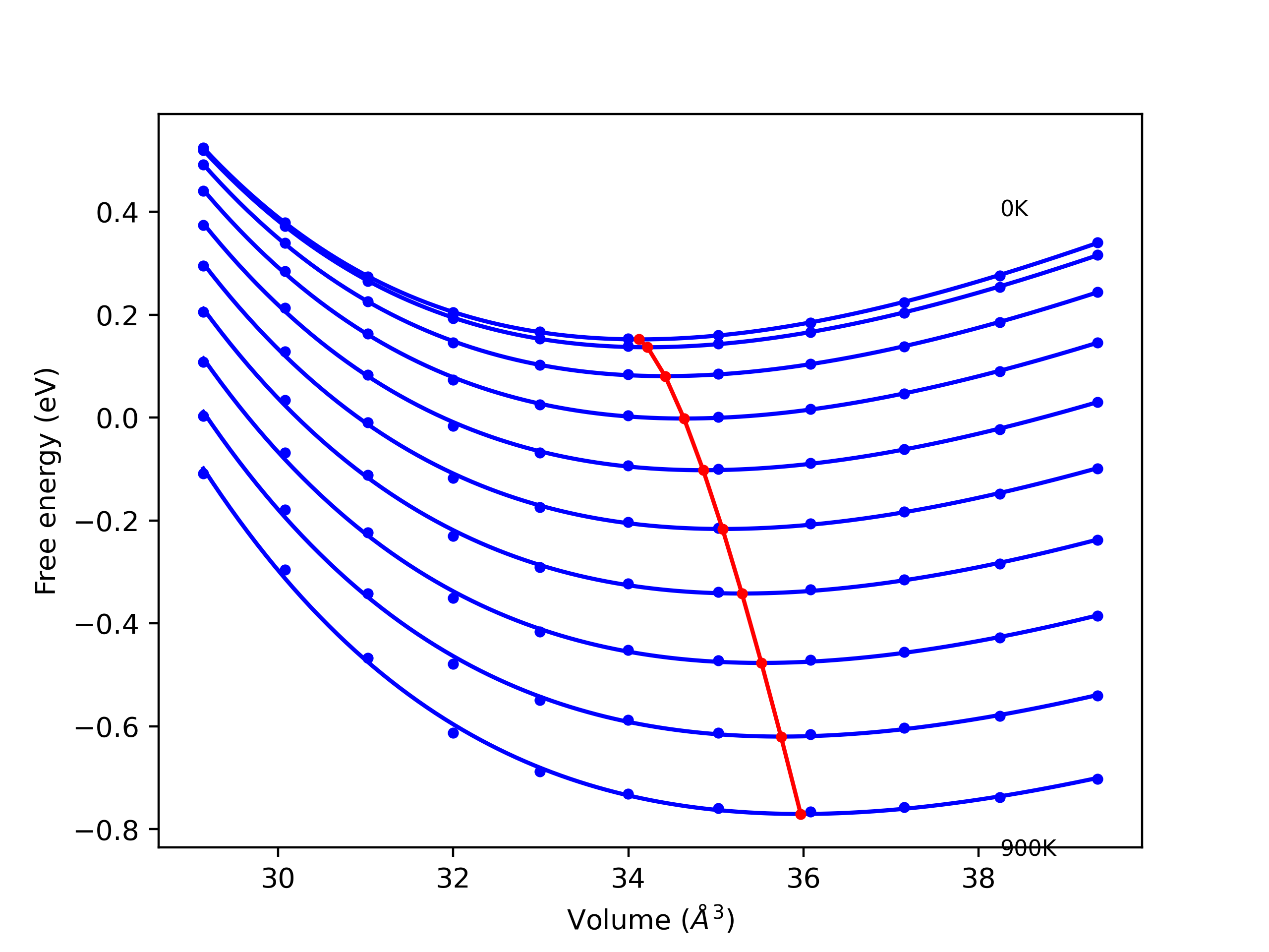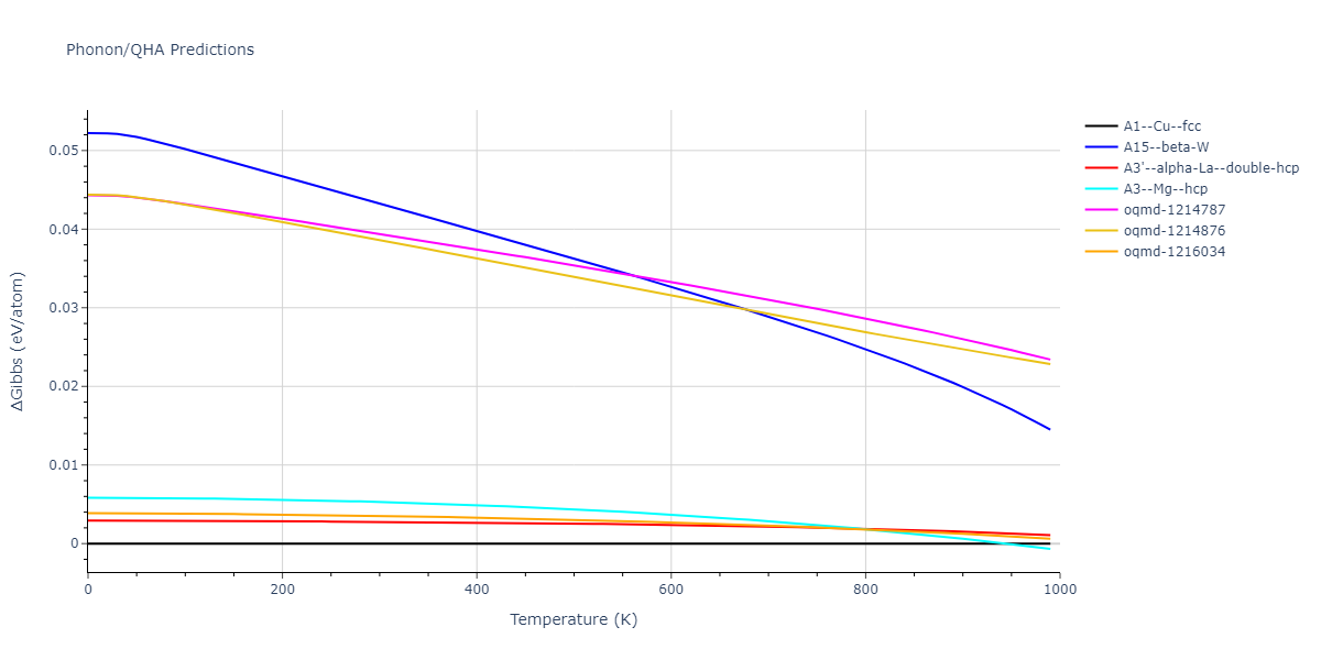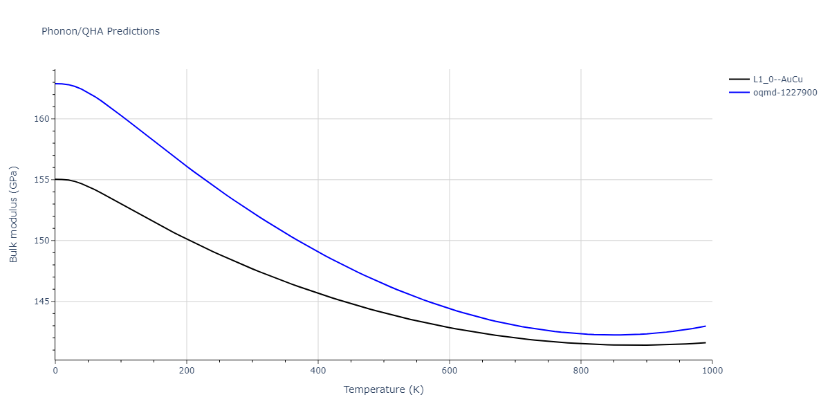 Phonon band structures and crystal properties estimated from quasi-harmonic approximation (QHA) calculations are displayed for select crystals. The calculations were performed using phonopy and LAMMPS. For the phonon calculations, 3x3 supercells of the potential-specific relaxed crystals were used. The QHA calculations were based on 11 strain states ranging from -0.05 to 0.05.