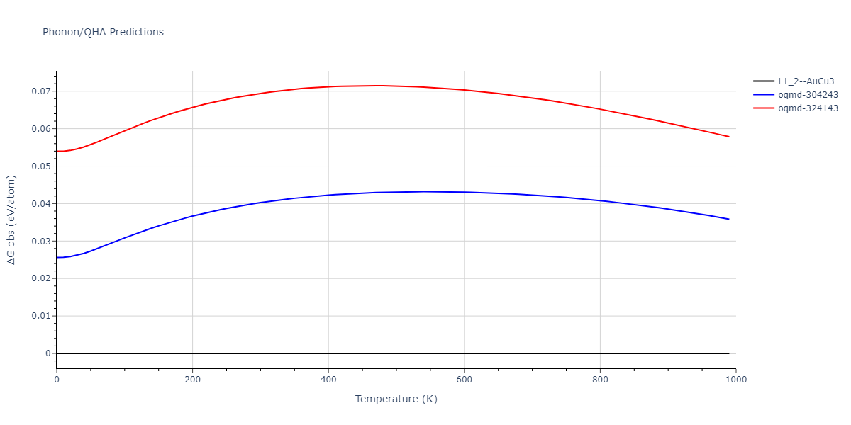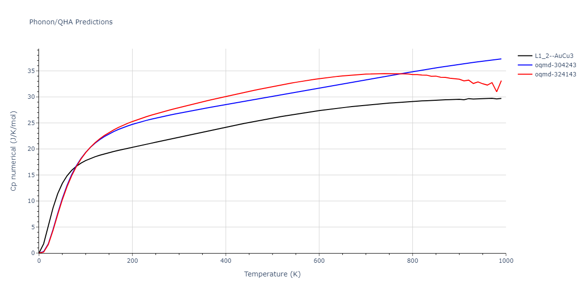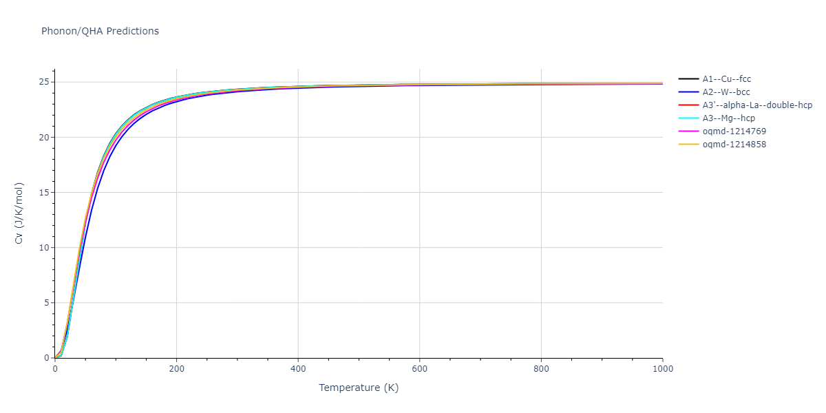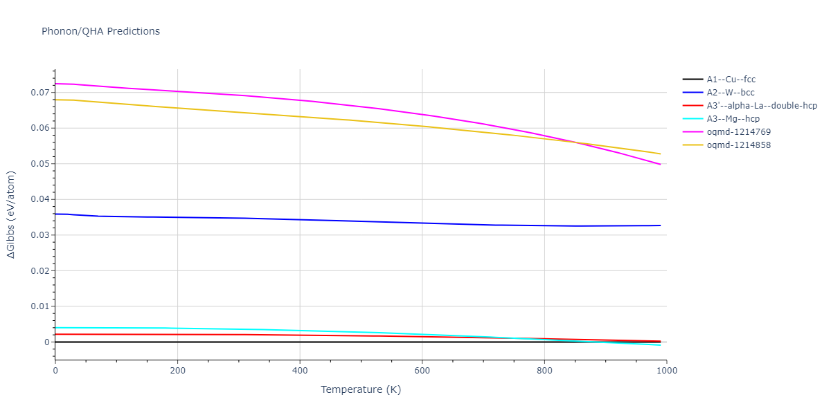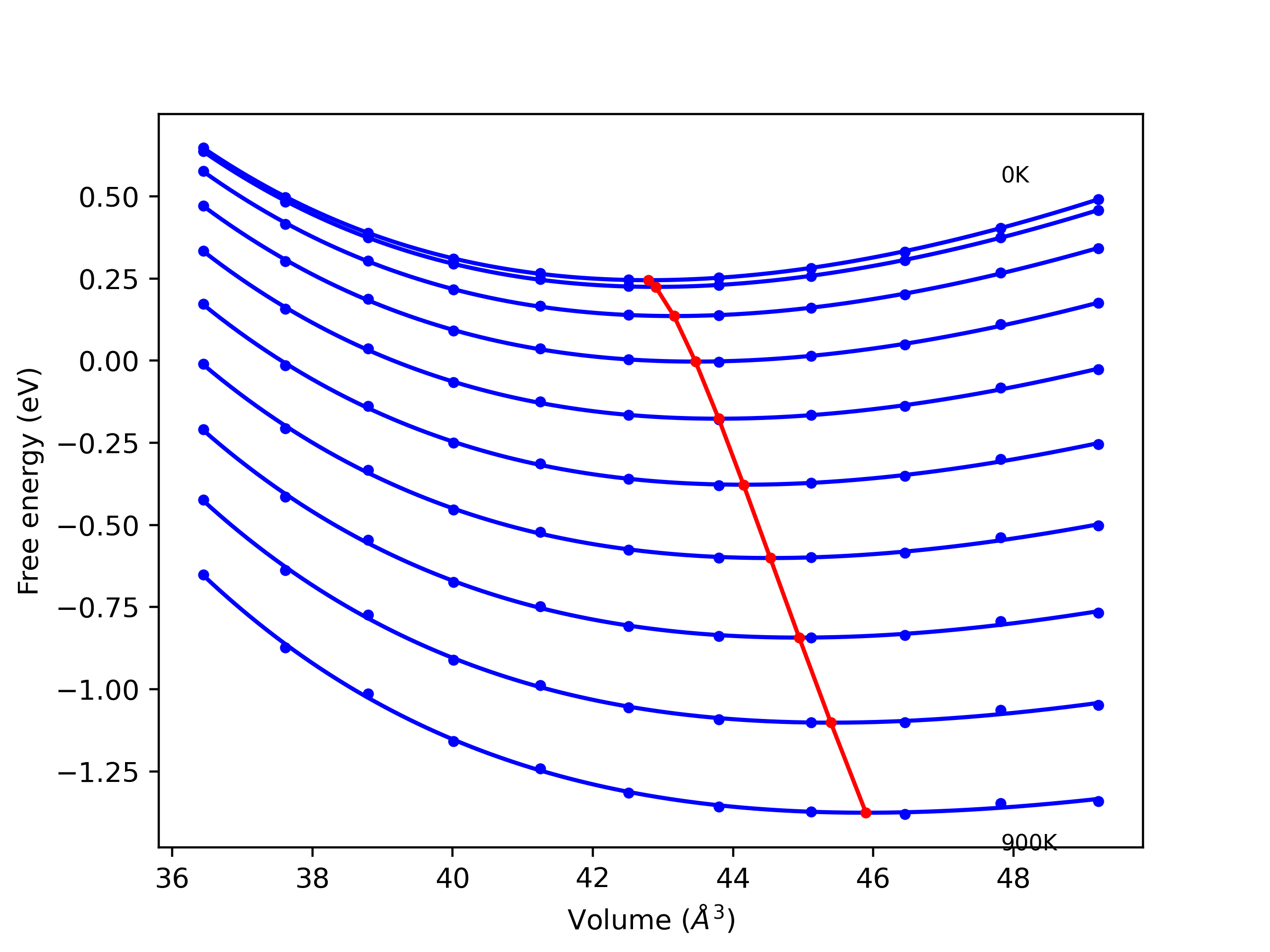 Phonon band structures and crystal properties estimated from quasi-harmonic approximation (QHA) calculations are displayed for select crystals. The calculations were performed using phonopy and LAMMPS. For the phonon calculations, 3x3 supercells of the potential-specific relaxed crystals were used. The QHA calculations were based on 11 strain states ranging from -0.05 to 0.05.