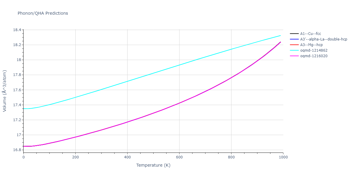 Phonon band structures and crystal properties estimated from quasi-harmonic approximation (QHA) calculations are displayed for select crystals. The calculations were performed using phonopy and LAMMPS. For the phonon calculations, 3x3 supercells of the potential-specific relaxed crystals were used. The QHA calculations were based on 11 strain states ranging from -0.05 to 0.05.